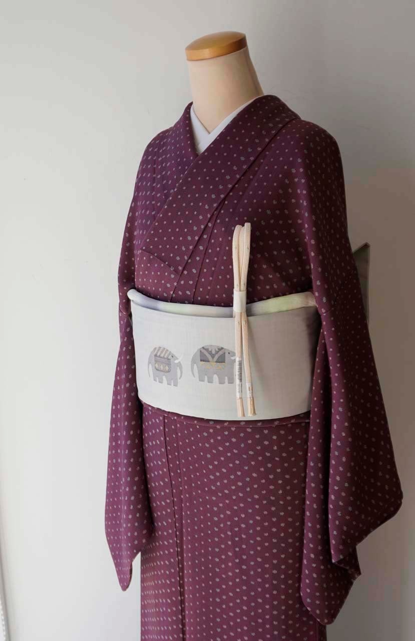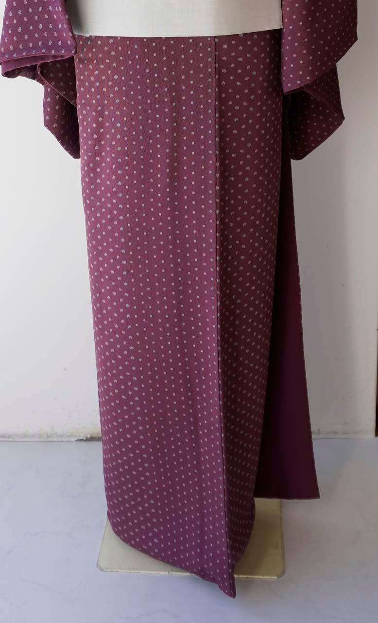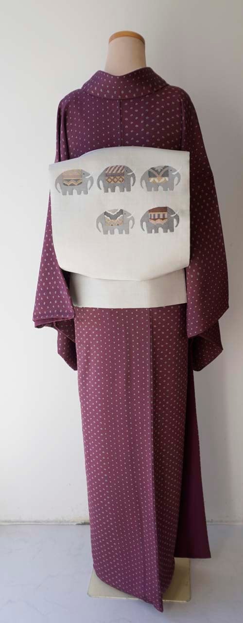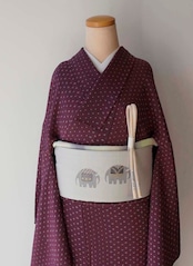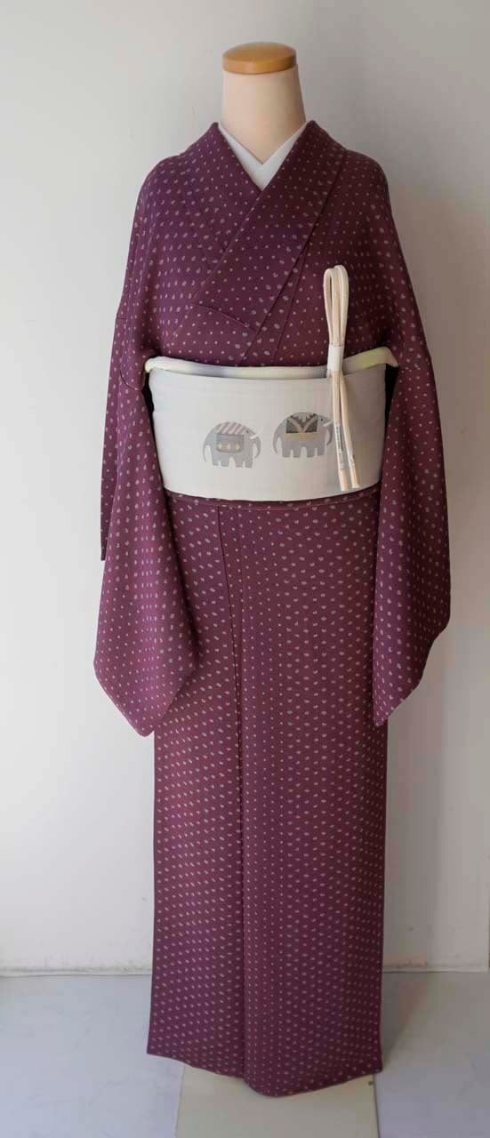 深い赤紫系の地に、丸文と意匠化された桐文が