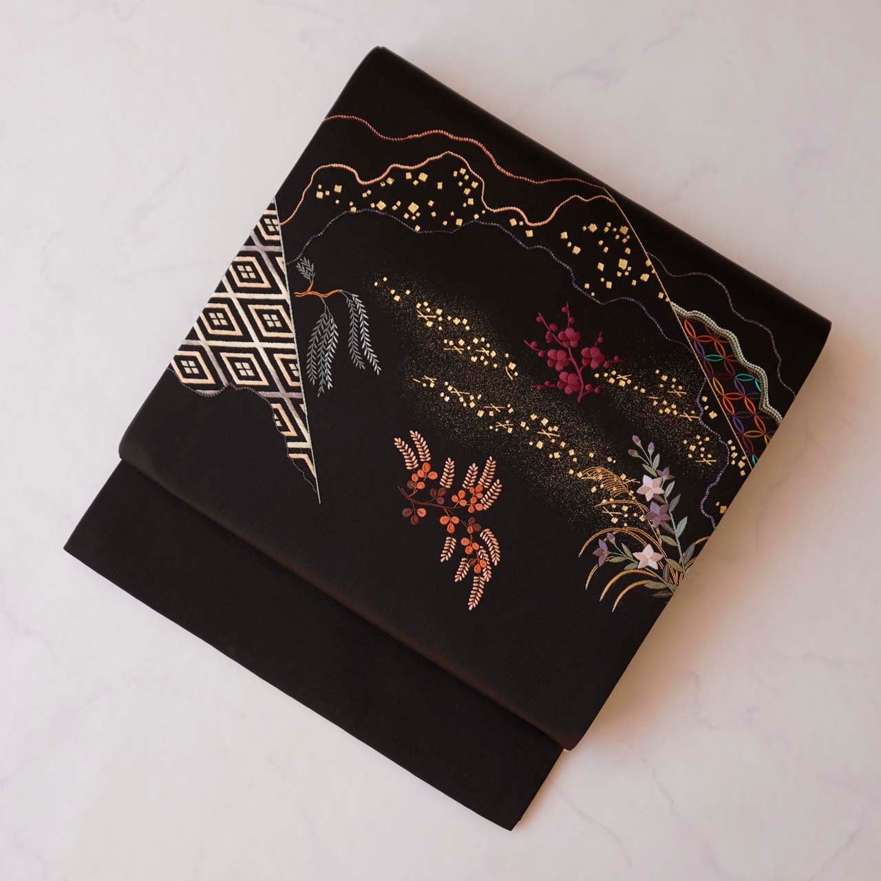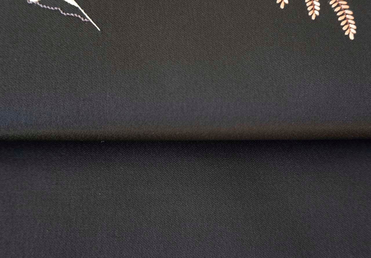 【ふくろ帯】黒地 吉祥・四季植物刺繍文 ふくろ帯