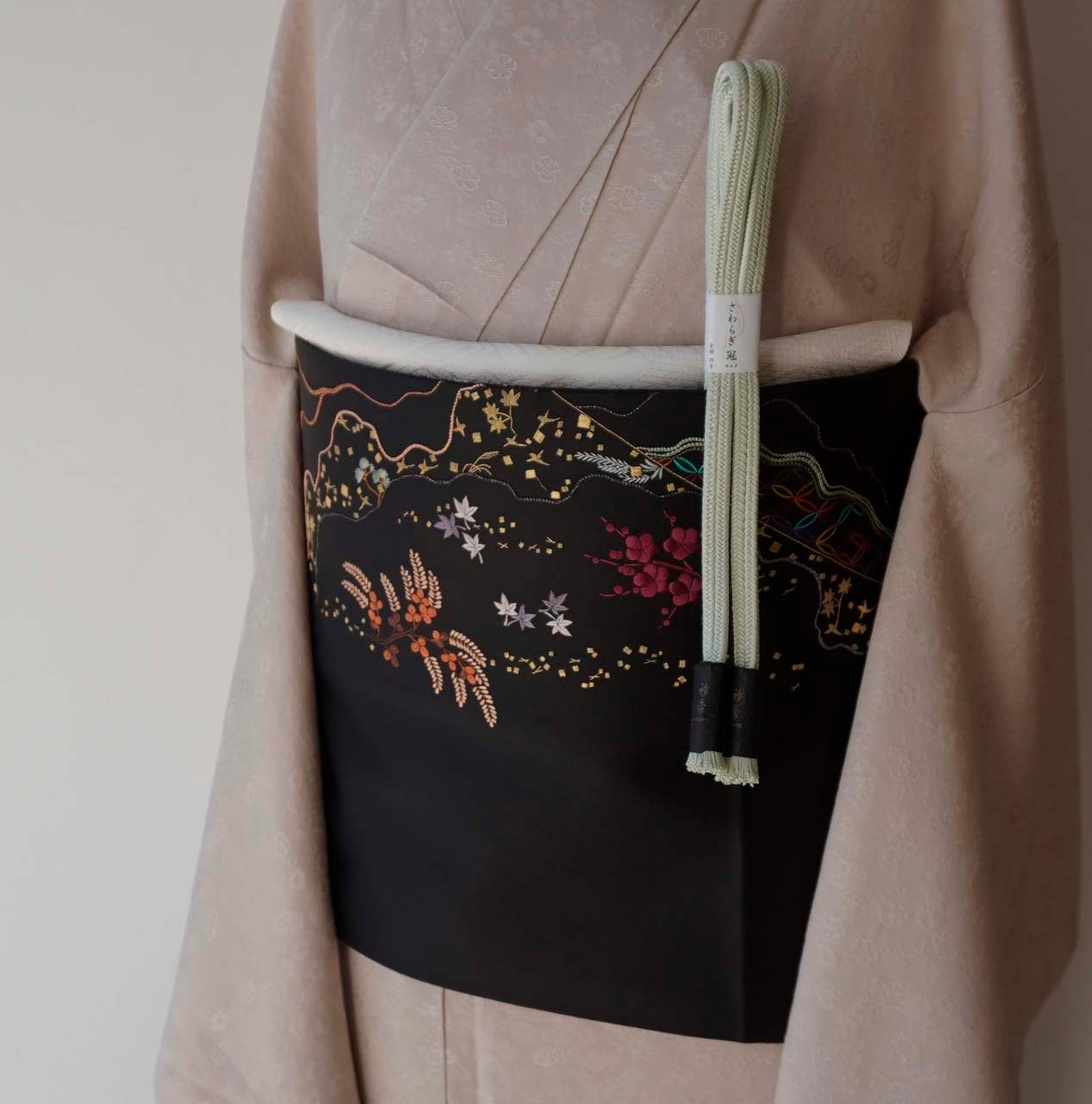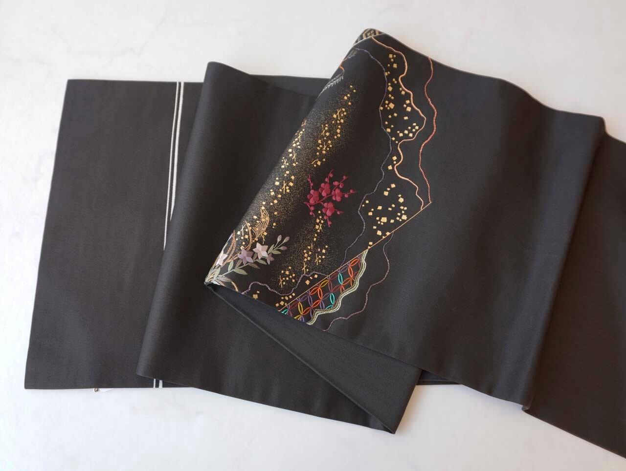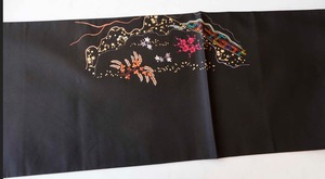 黒地に美しい手刺繍が施されたふくろ帯です。