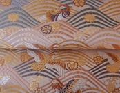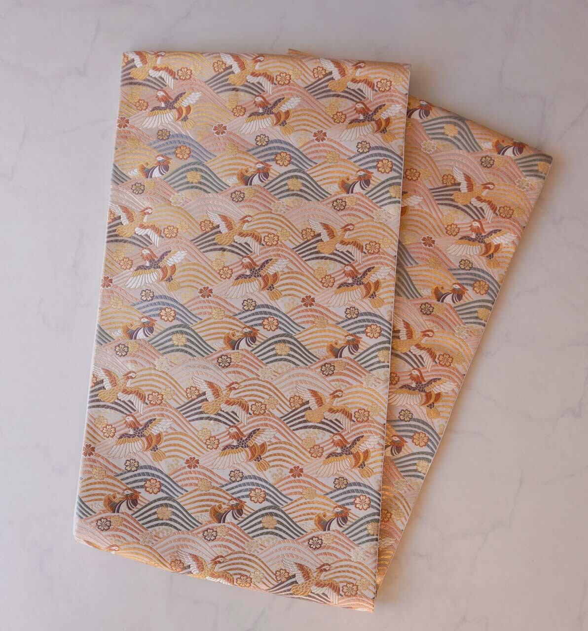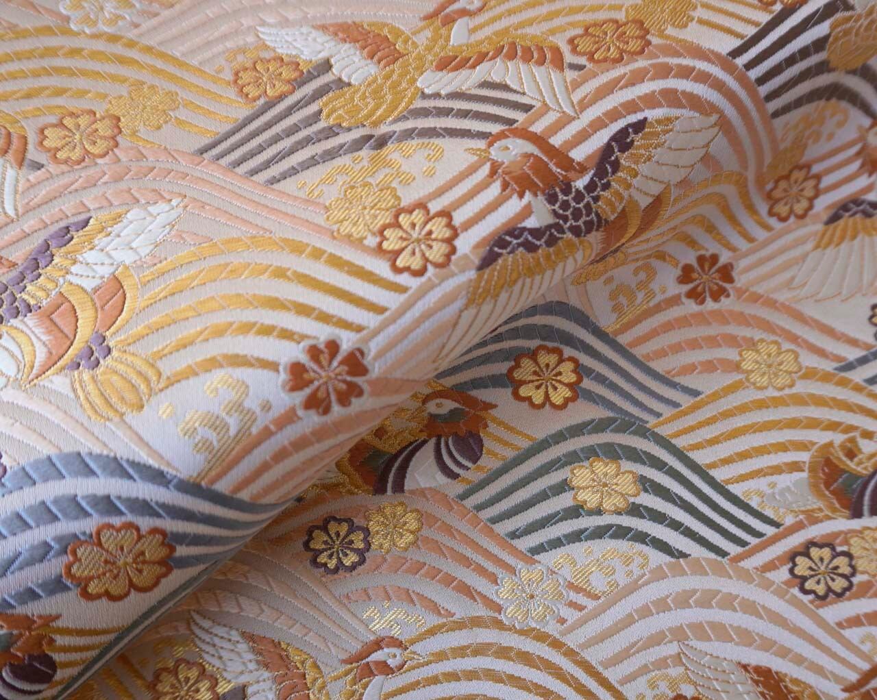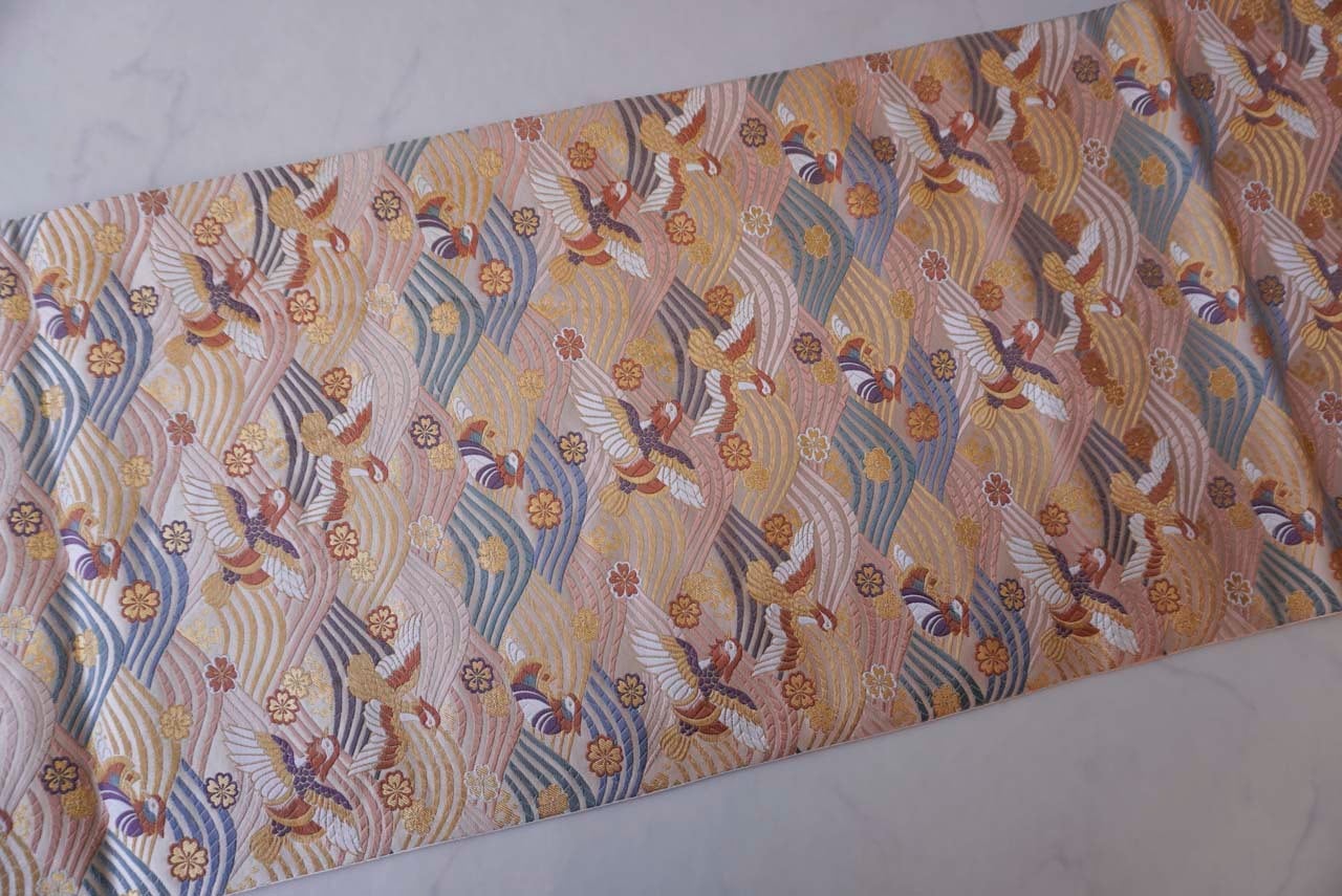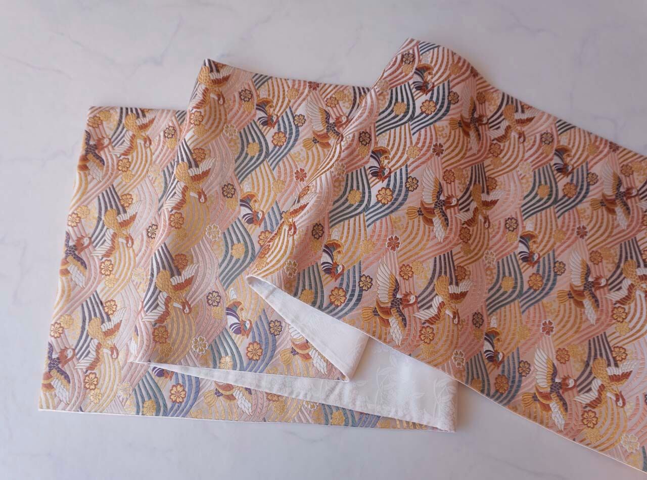 【ふくろ帯】ふくい 織匠十一代目篠屋宗兵衛 白地 波に鴛鴦・桜文 ふくろ帯