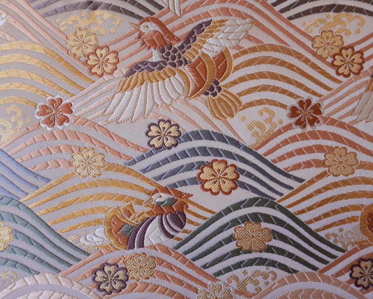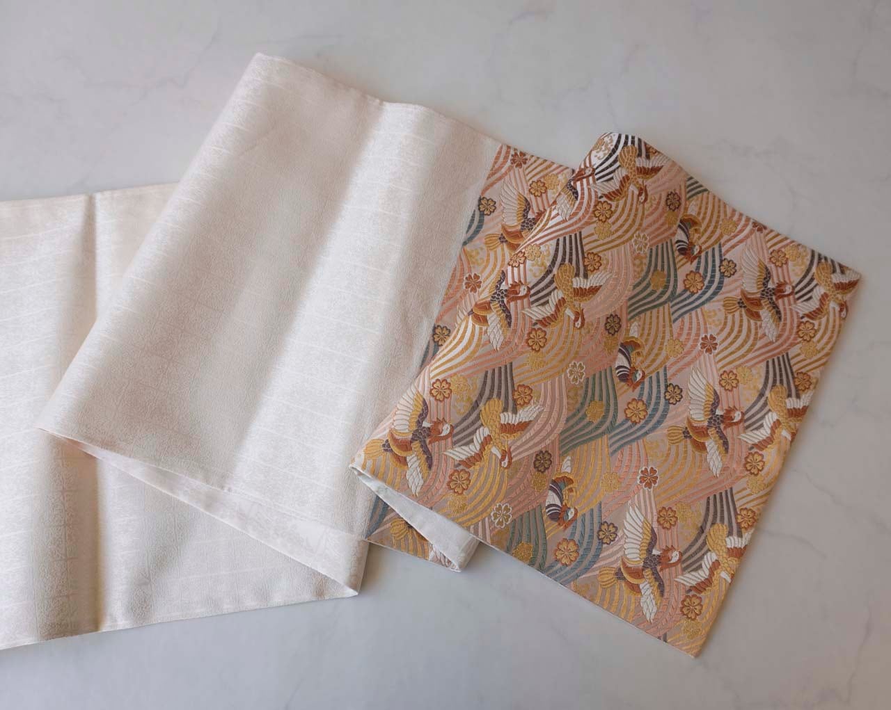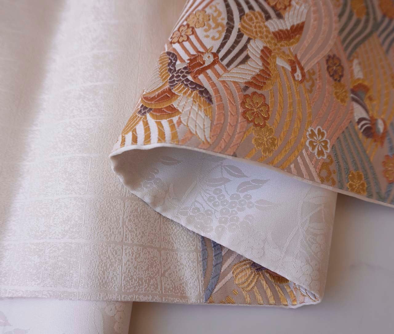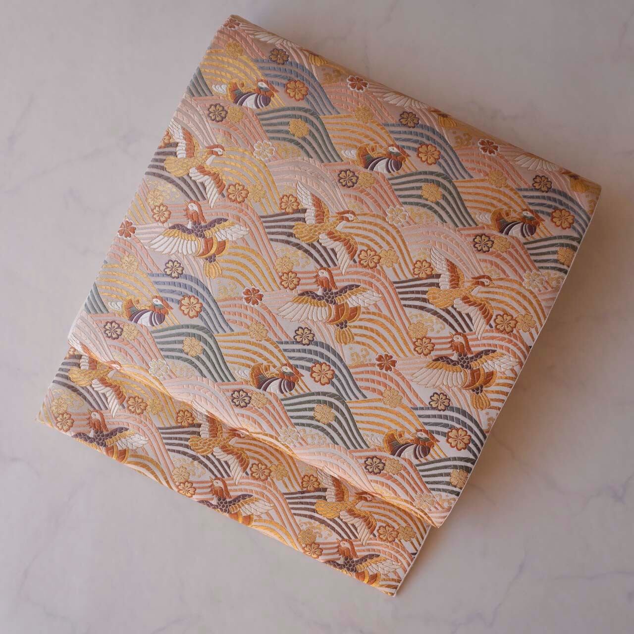 【ふくろ帯】ふくい 織匠十一代目篠屋宗兵衛 白地 波に鴛鴦・桜文 ふくろ帯