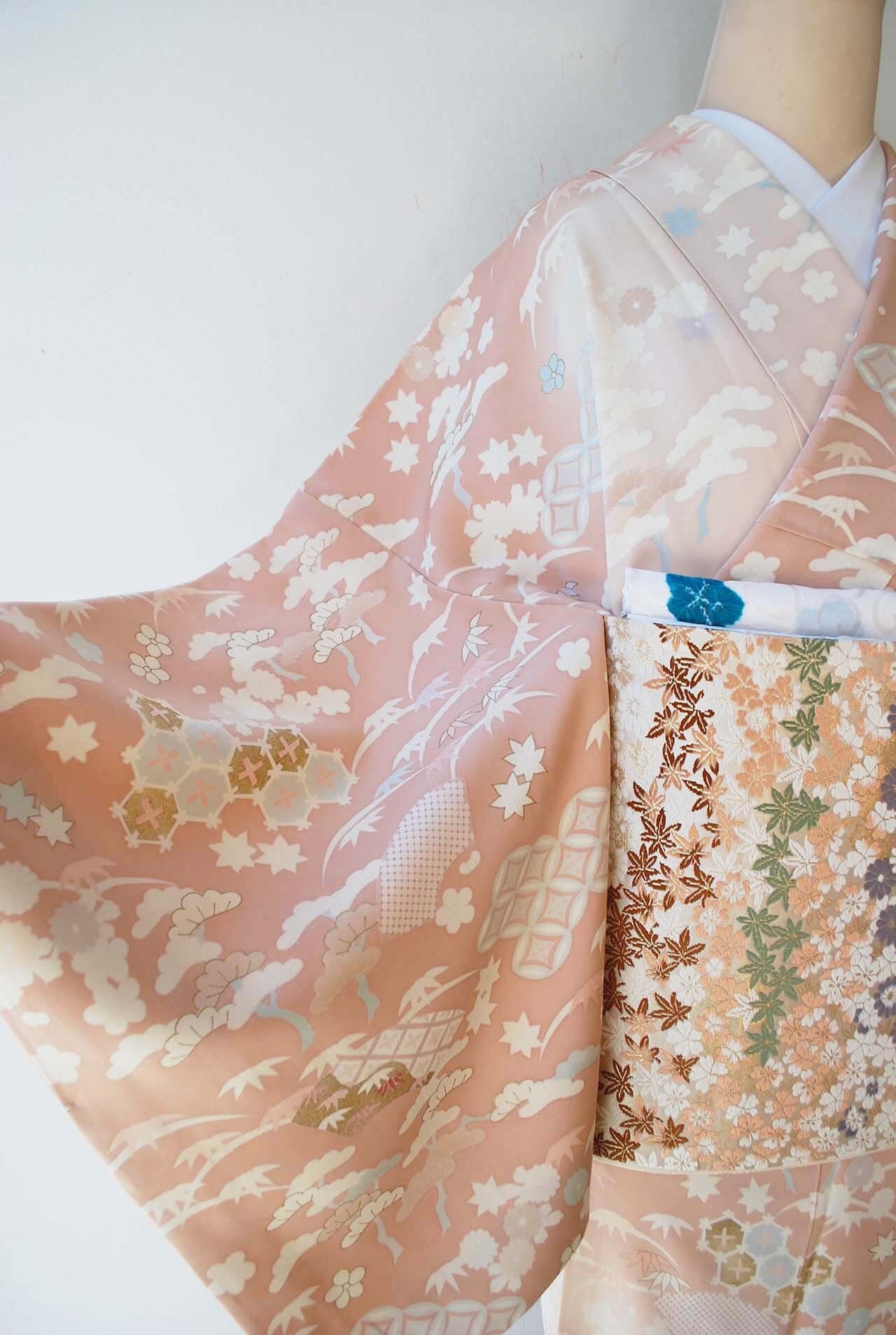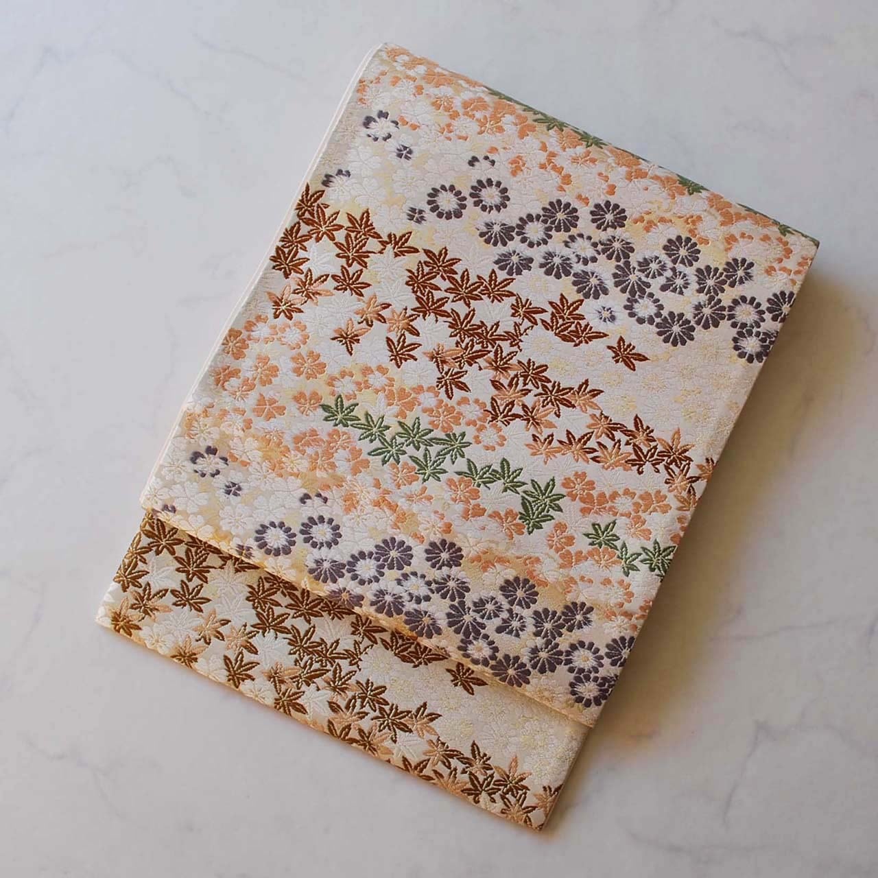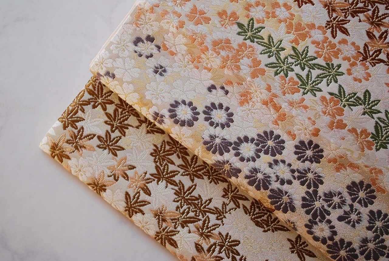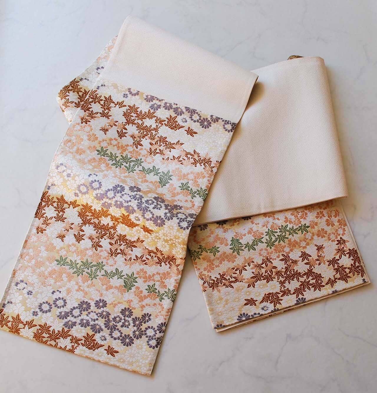 オフホワイト地に小さな紅葉、菊、桜。