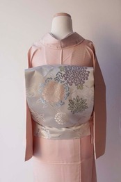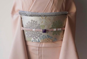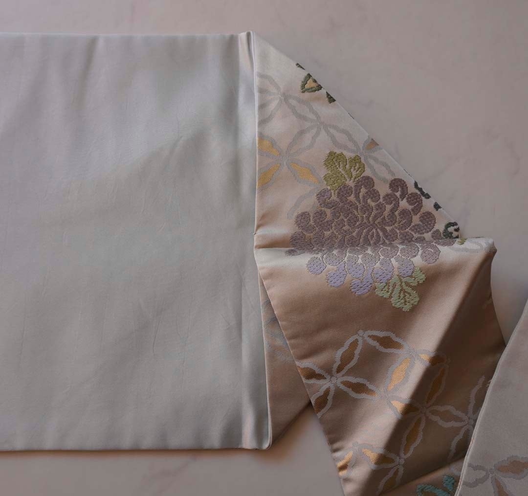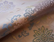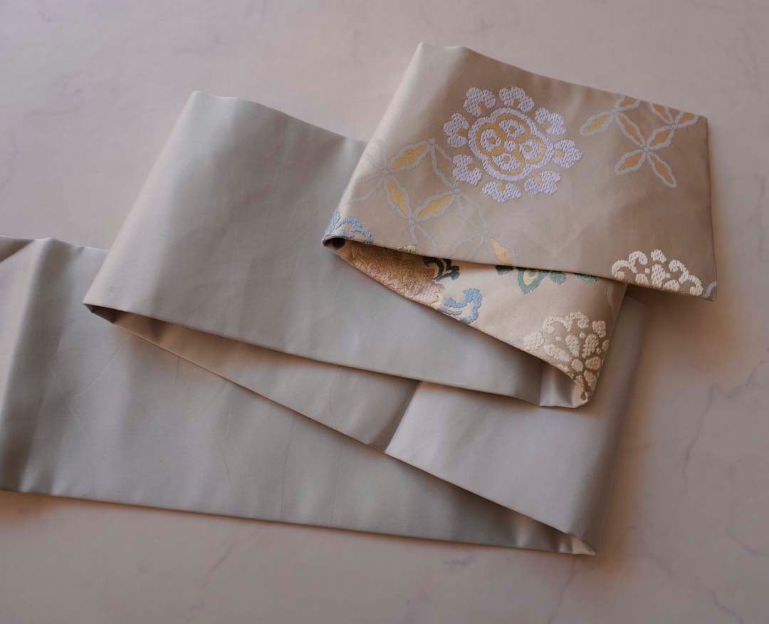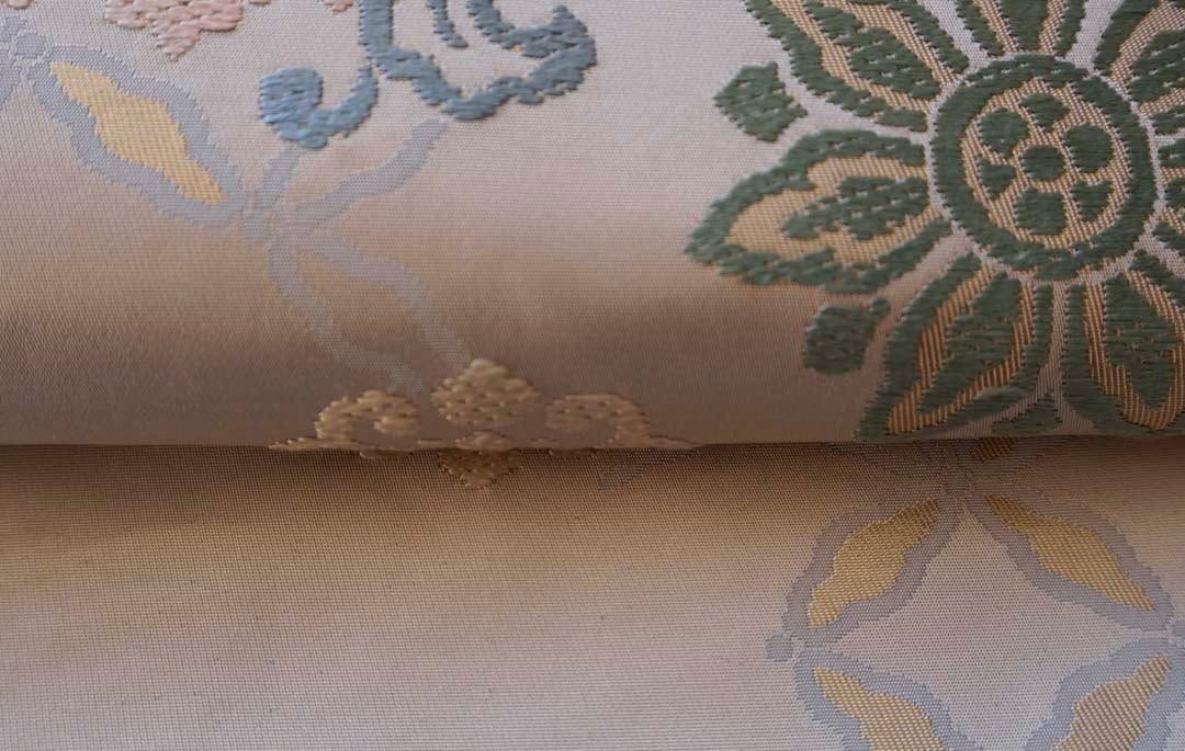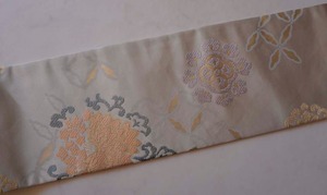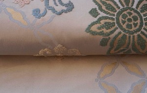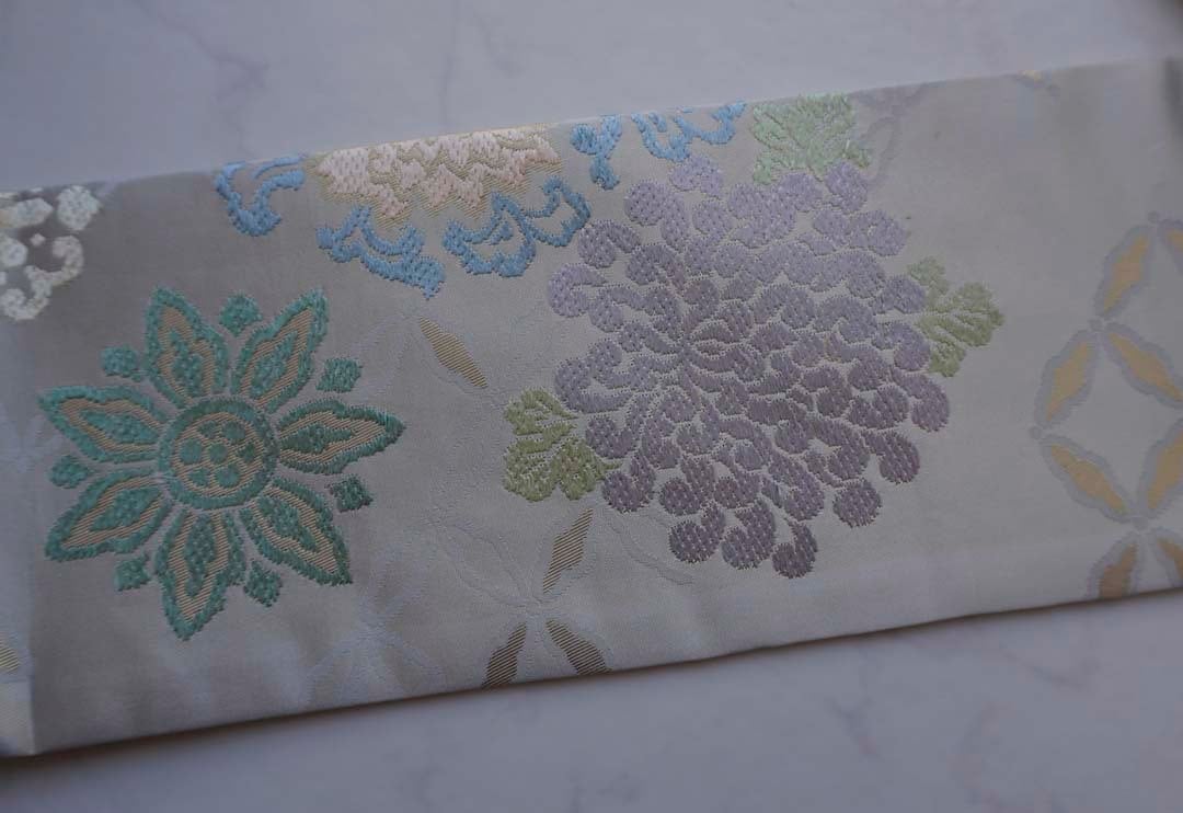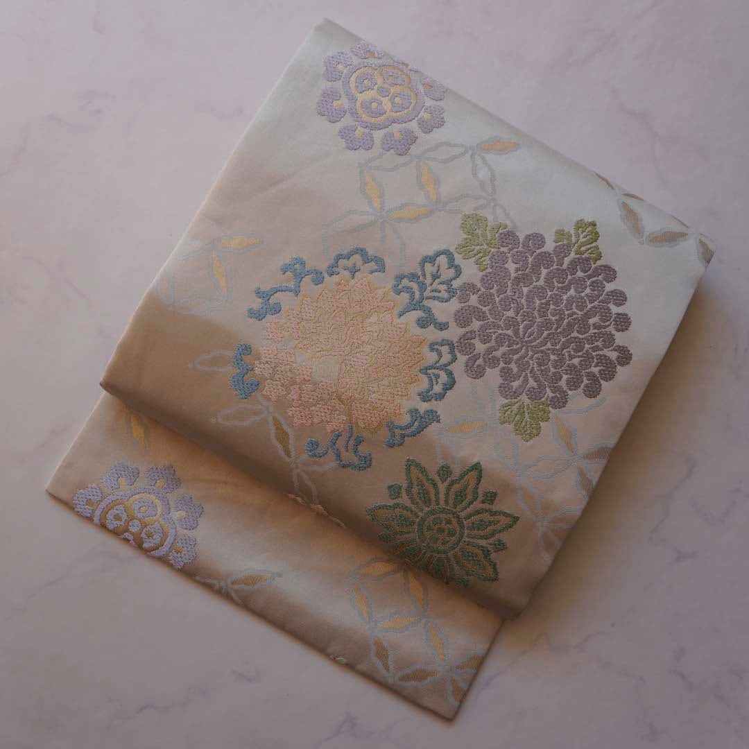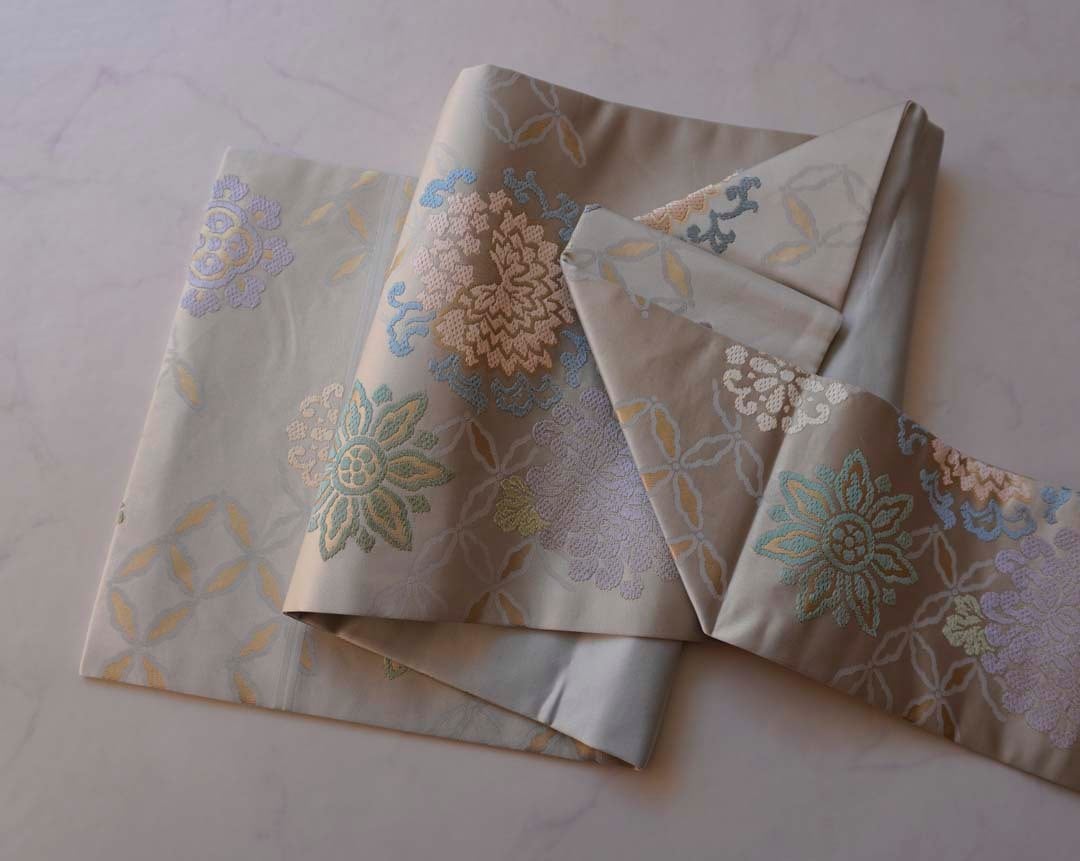 淡い灰地の川島織物製、唐織りのなごや帯です。