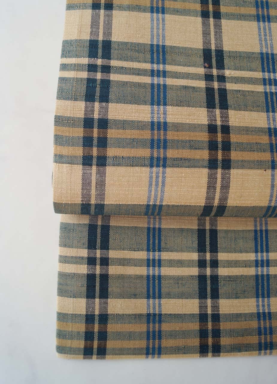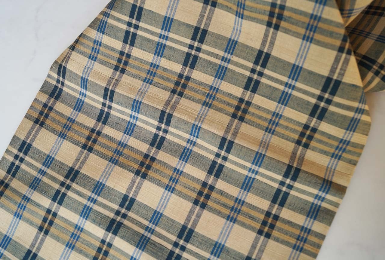 【なごや帯】白橡色 格子文様 紬地なごや帯 お仕立て品