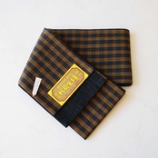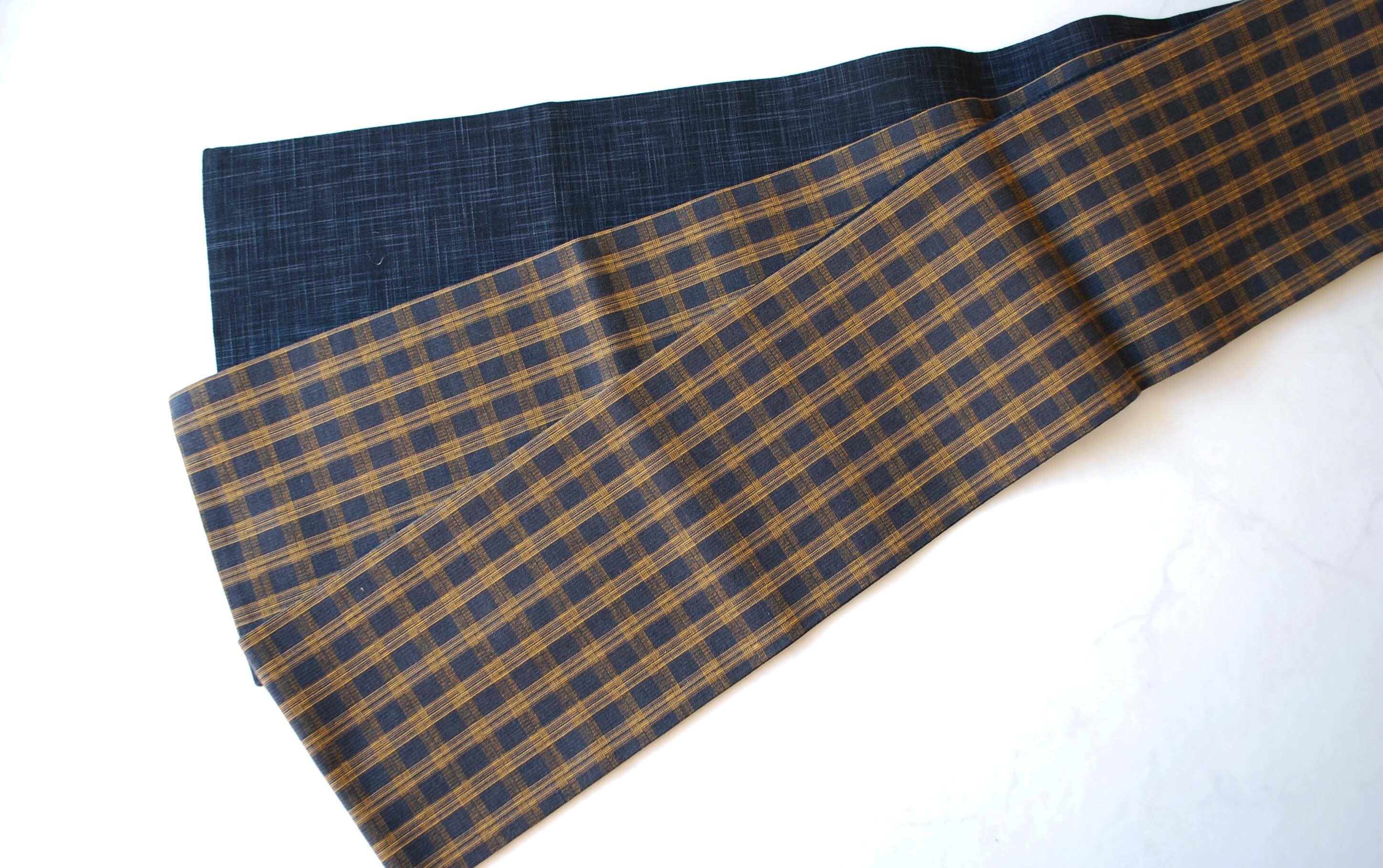 【半幅帯】紺仁・片貝木綿 墨色×菜種油 格子柄半幅帯