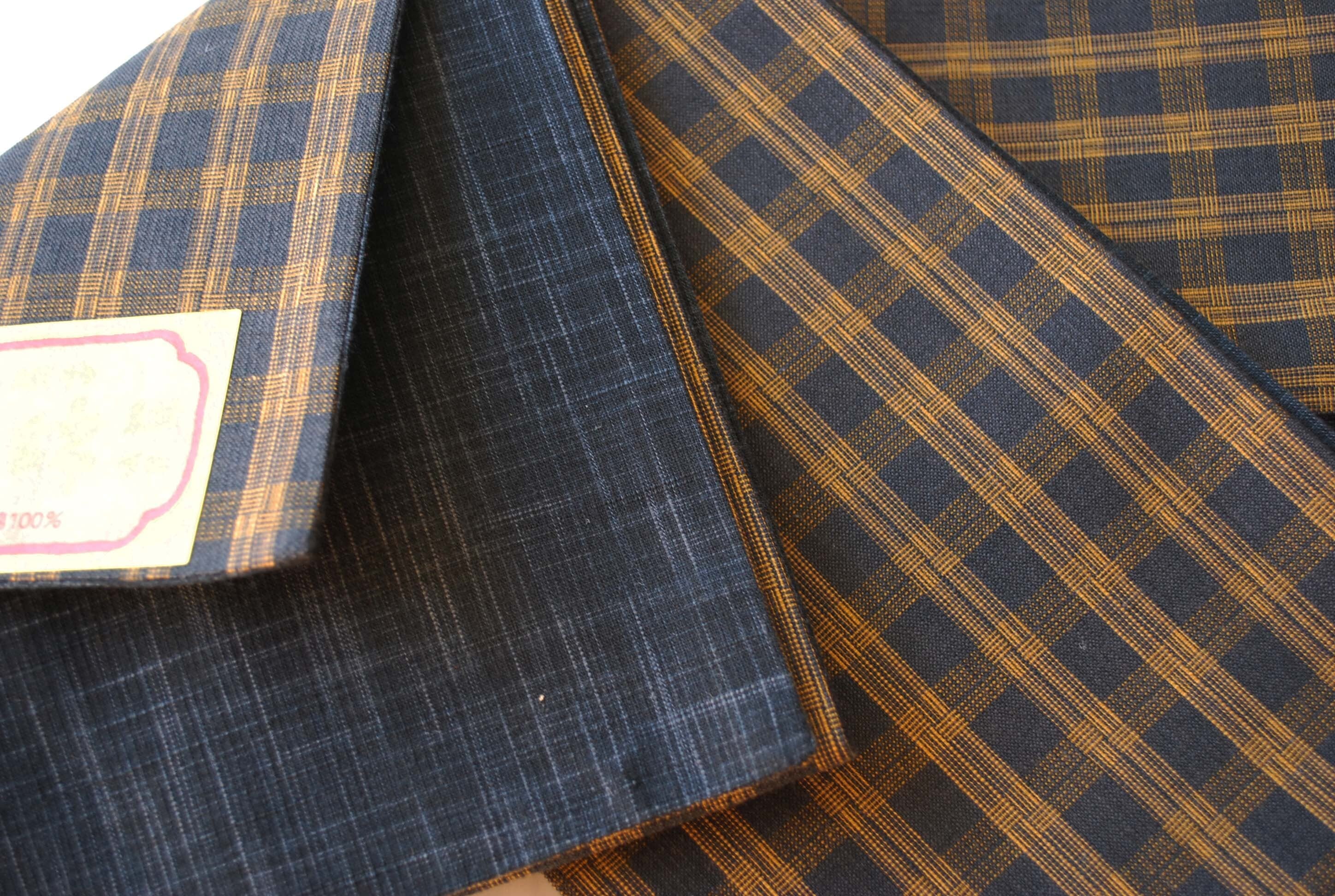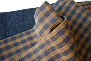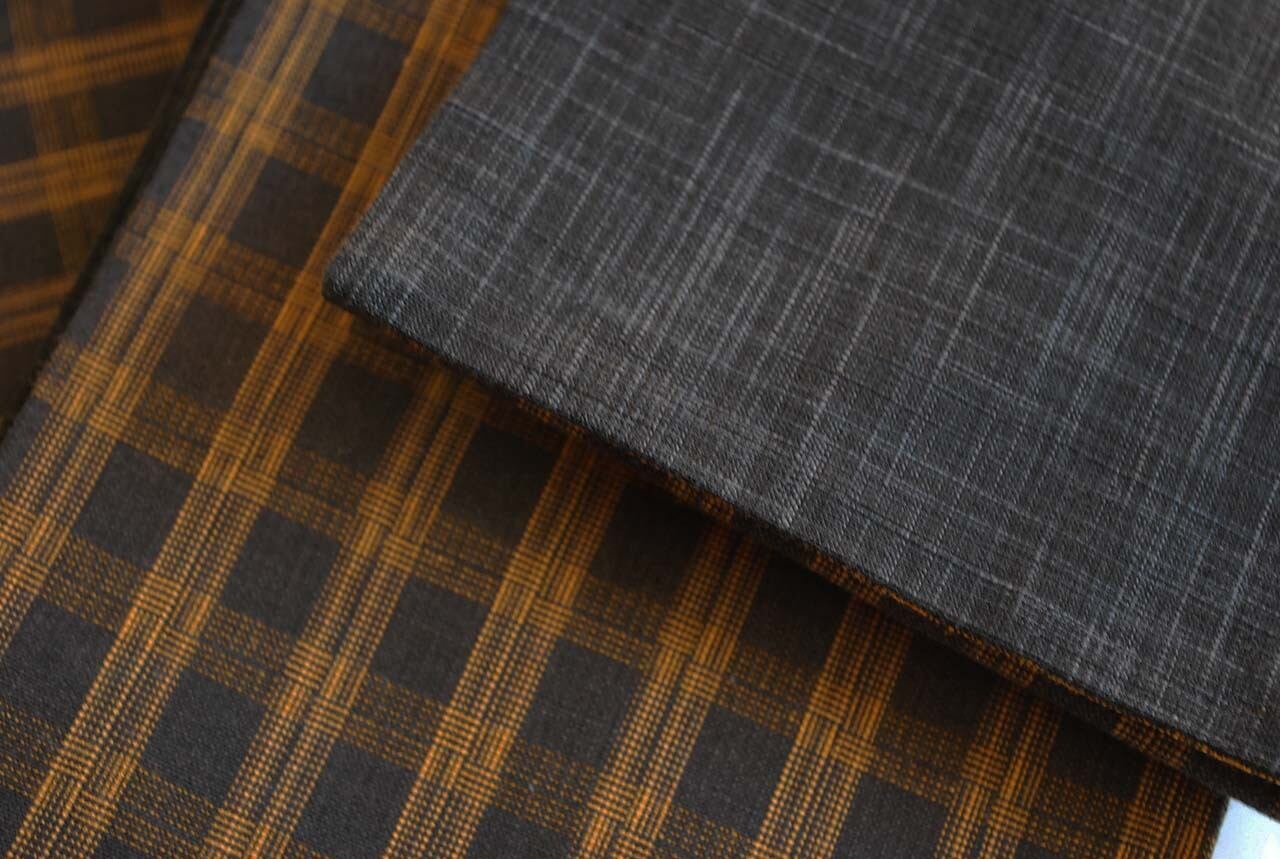 こちらは墨色と飴色の格子柄の織。