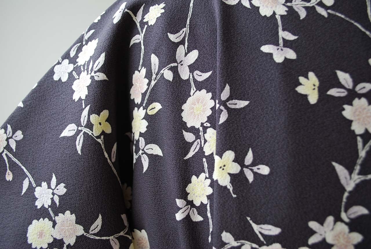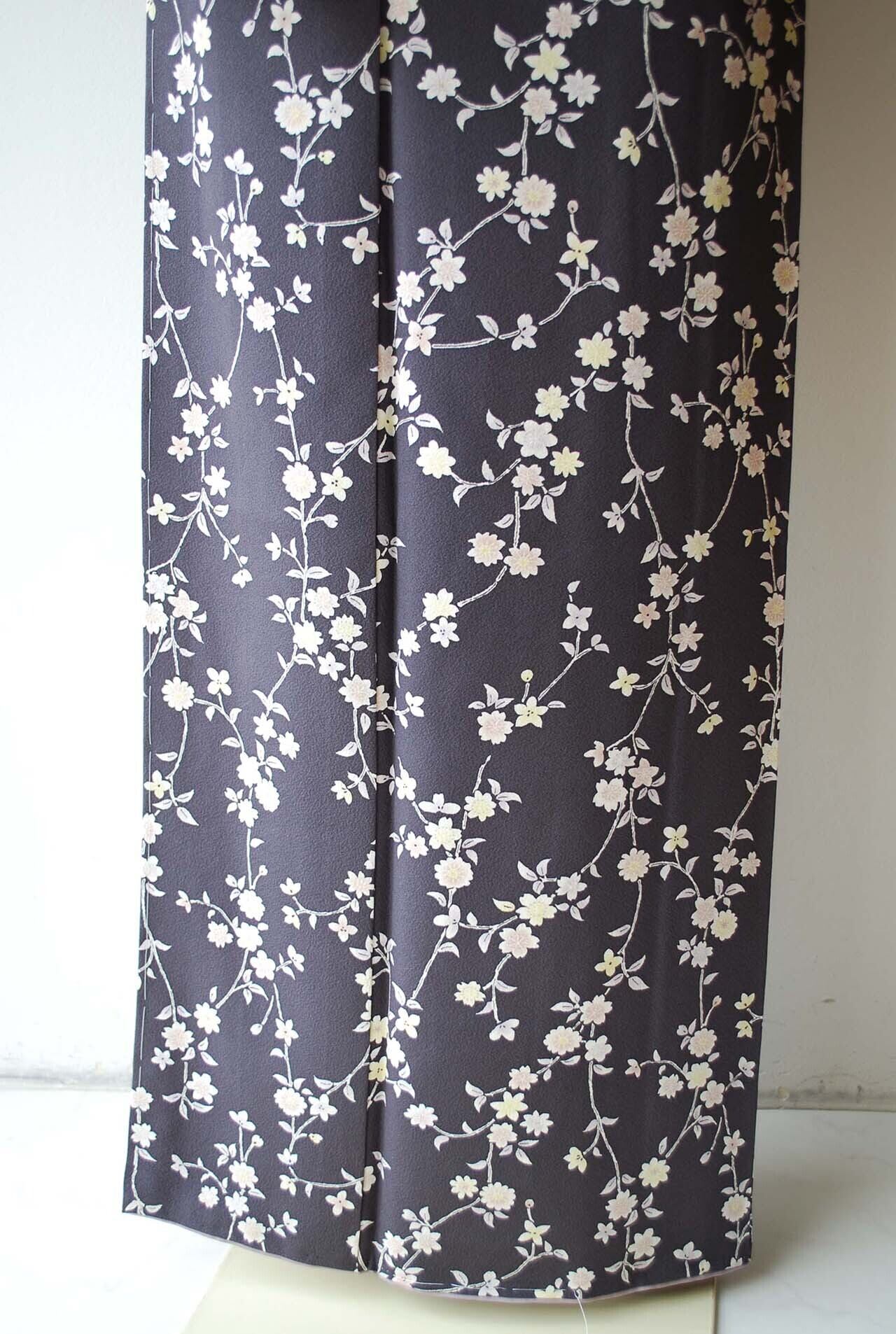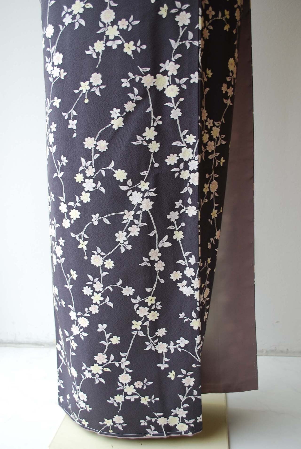 【袷】濃鼠色地 枝垂れ桜に小花 小紋