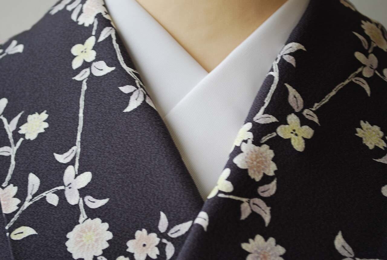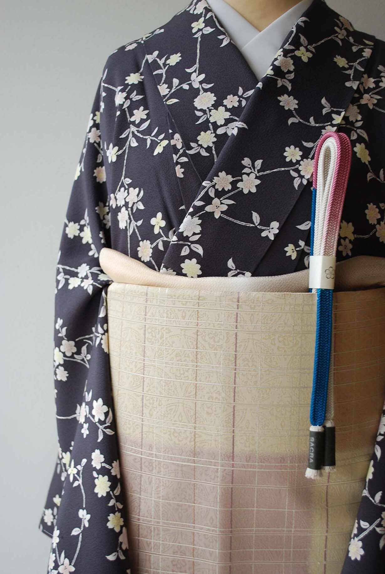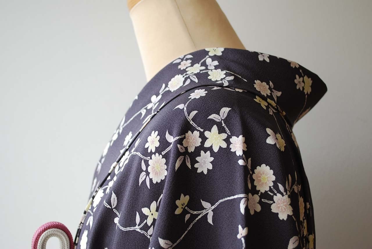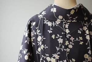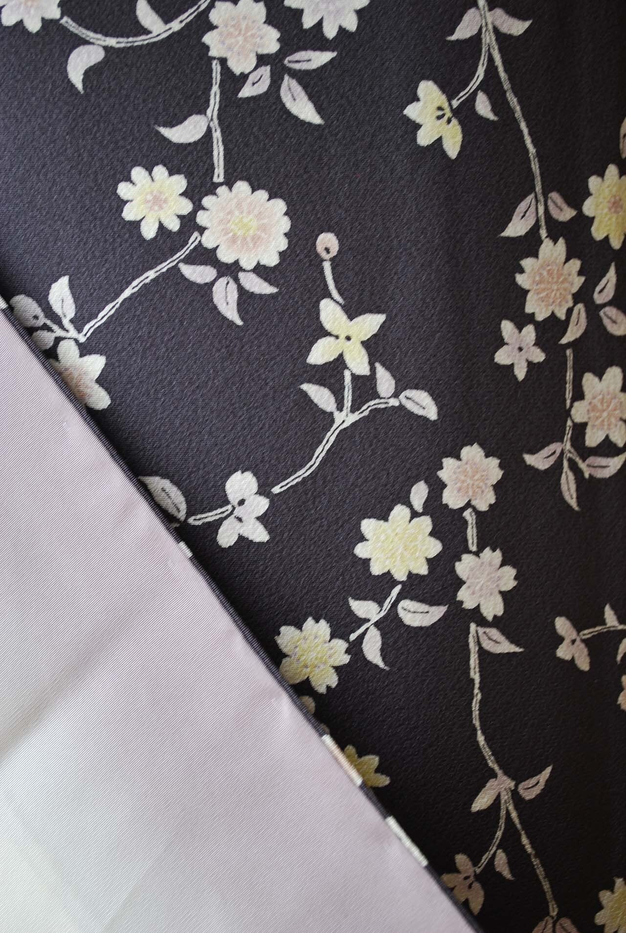 【袷】濃鼠色地 枝垂れ桜に小花 小紋