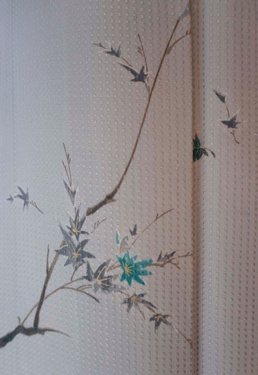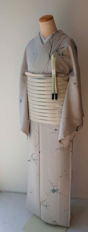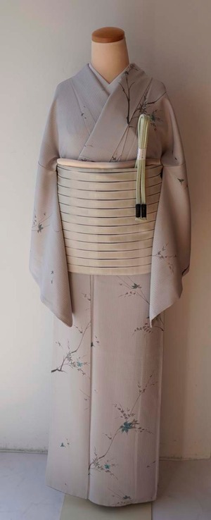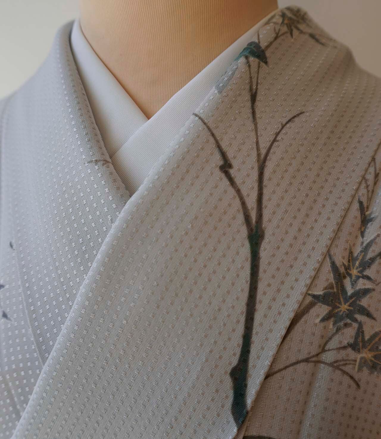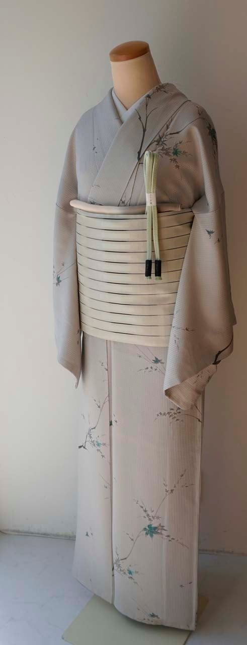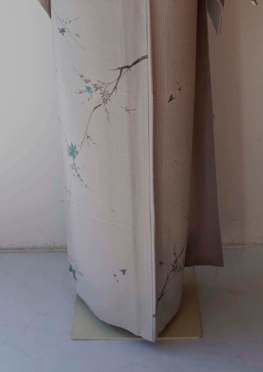 淡いグレーの地に、青紅葉が描かれた小紋です。