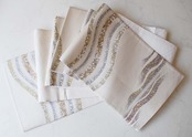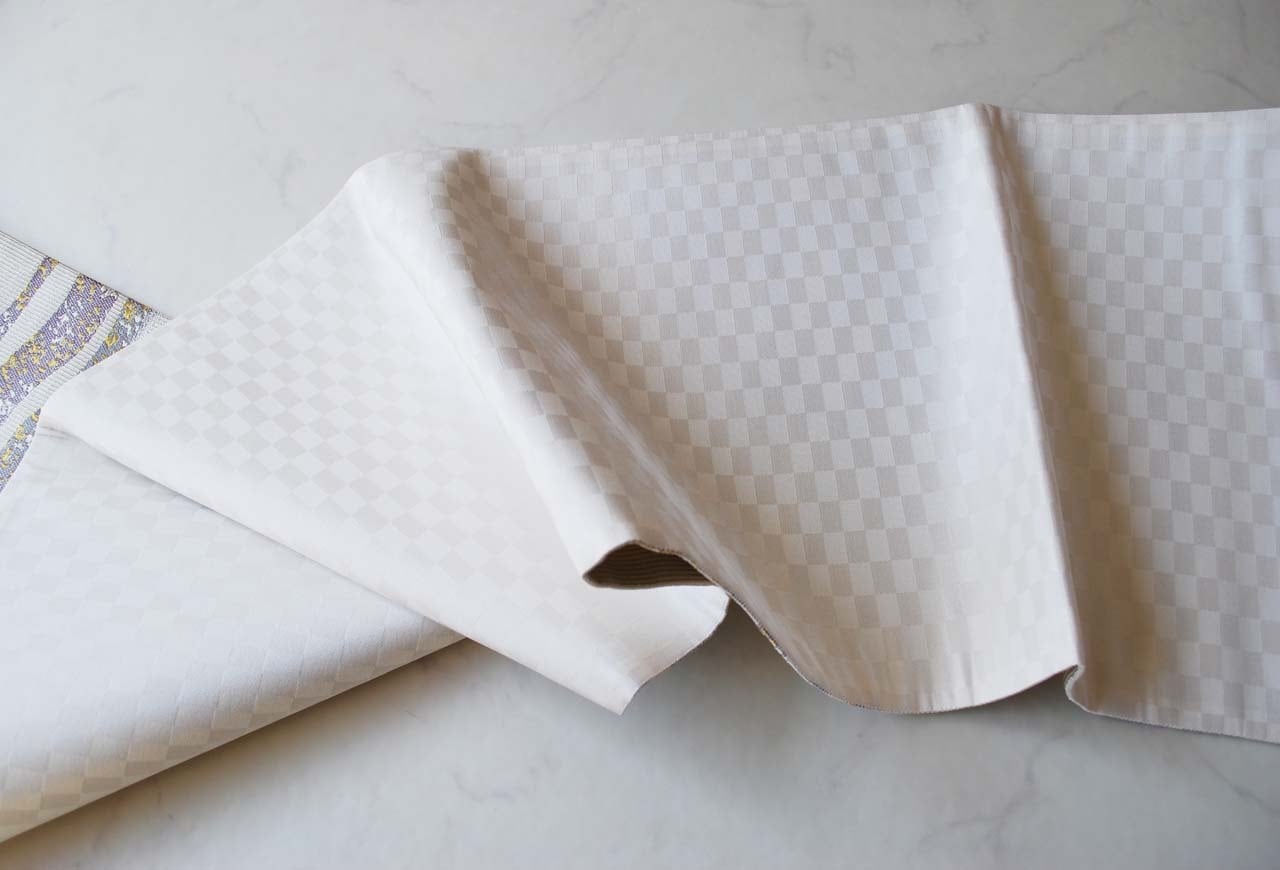 生成り色に銀色の細かい縞がベースと