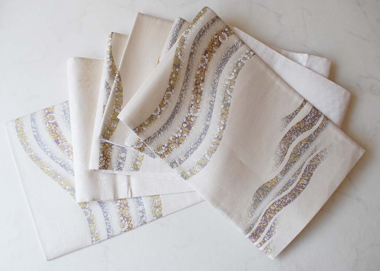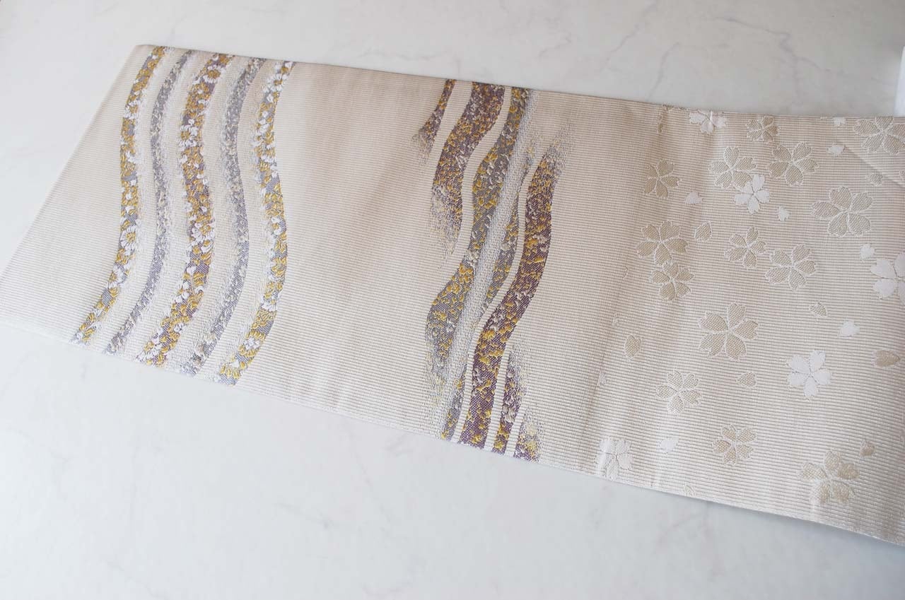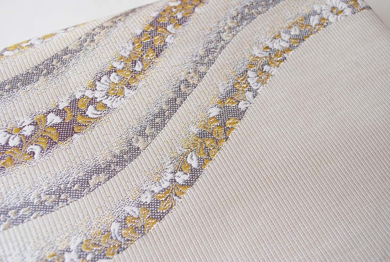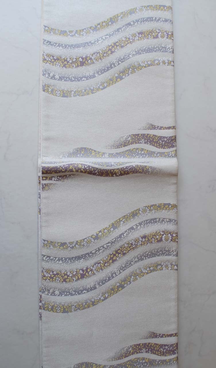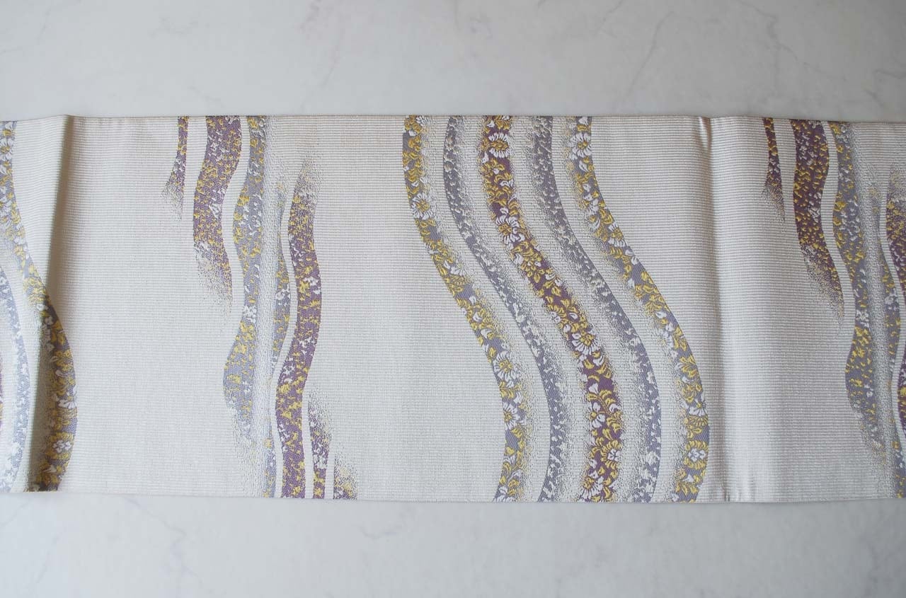 白灰地に曲線に花文のふくろ帯です。