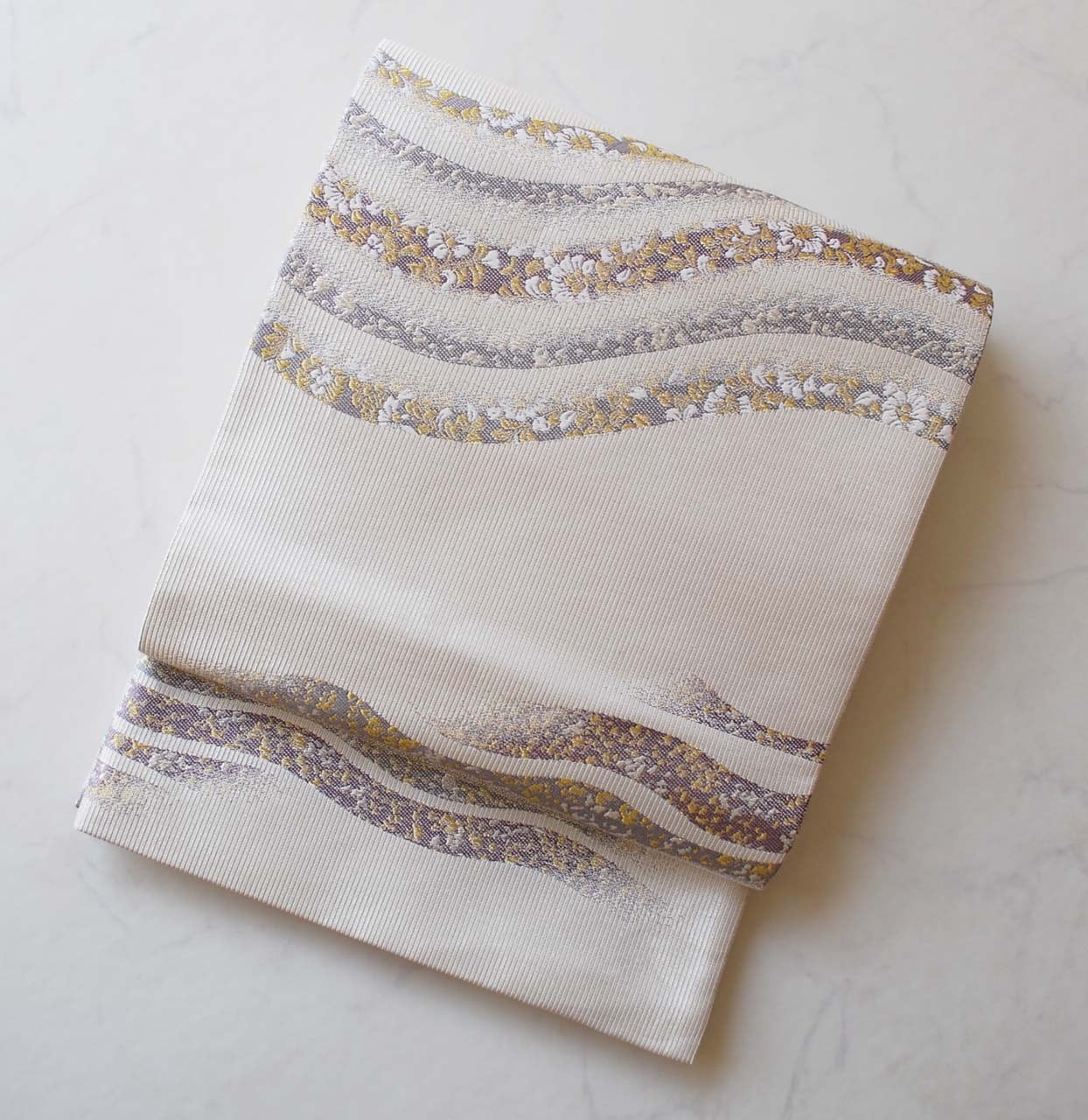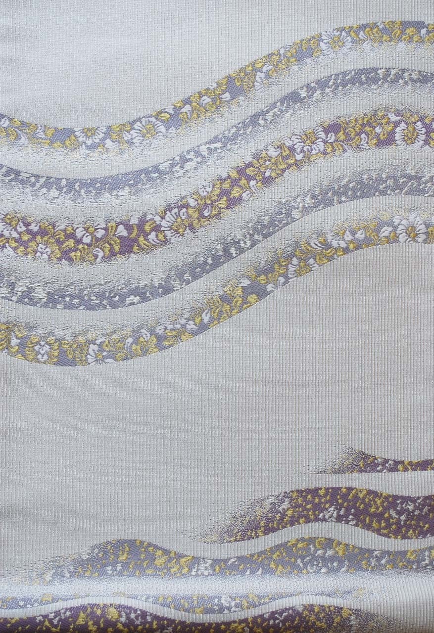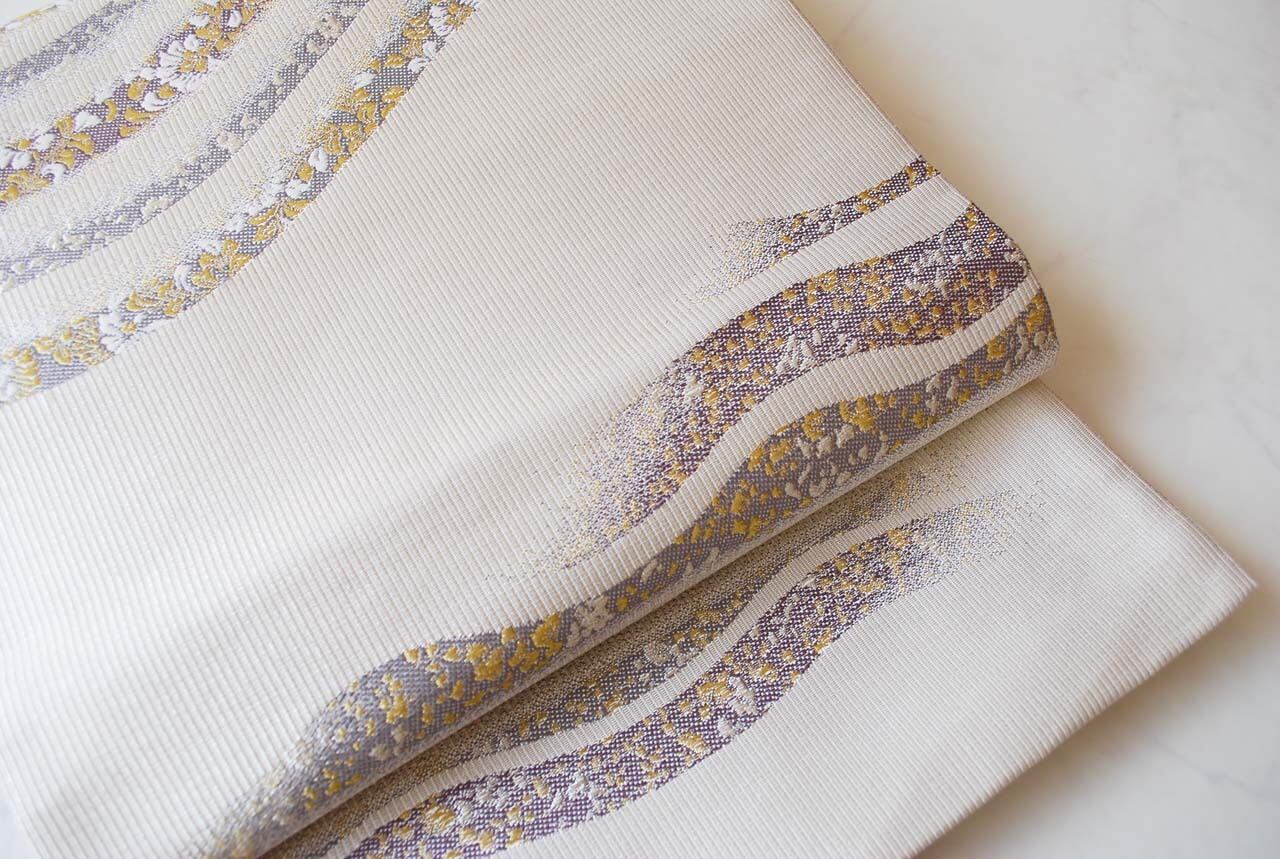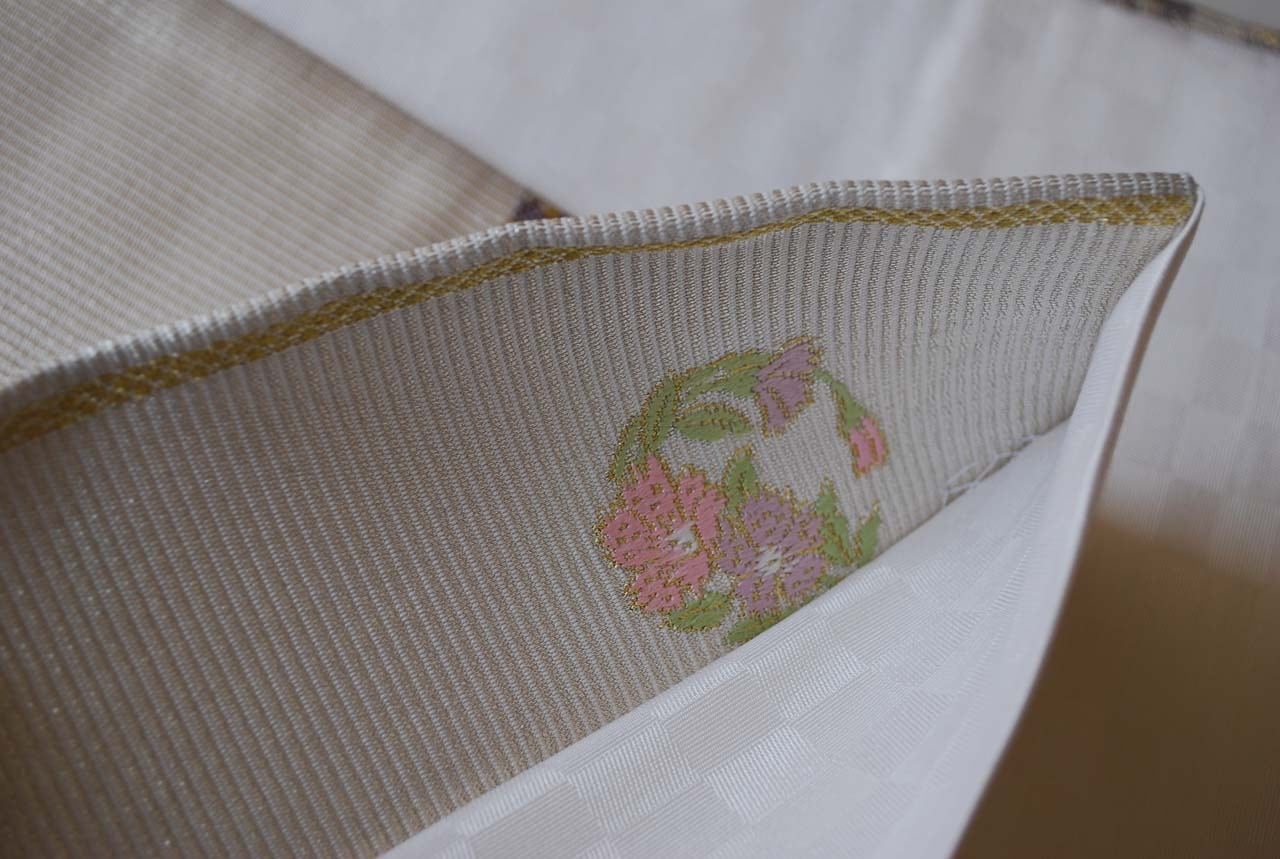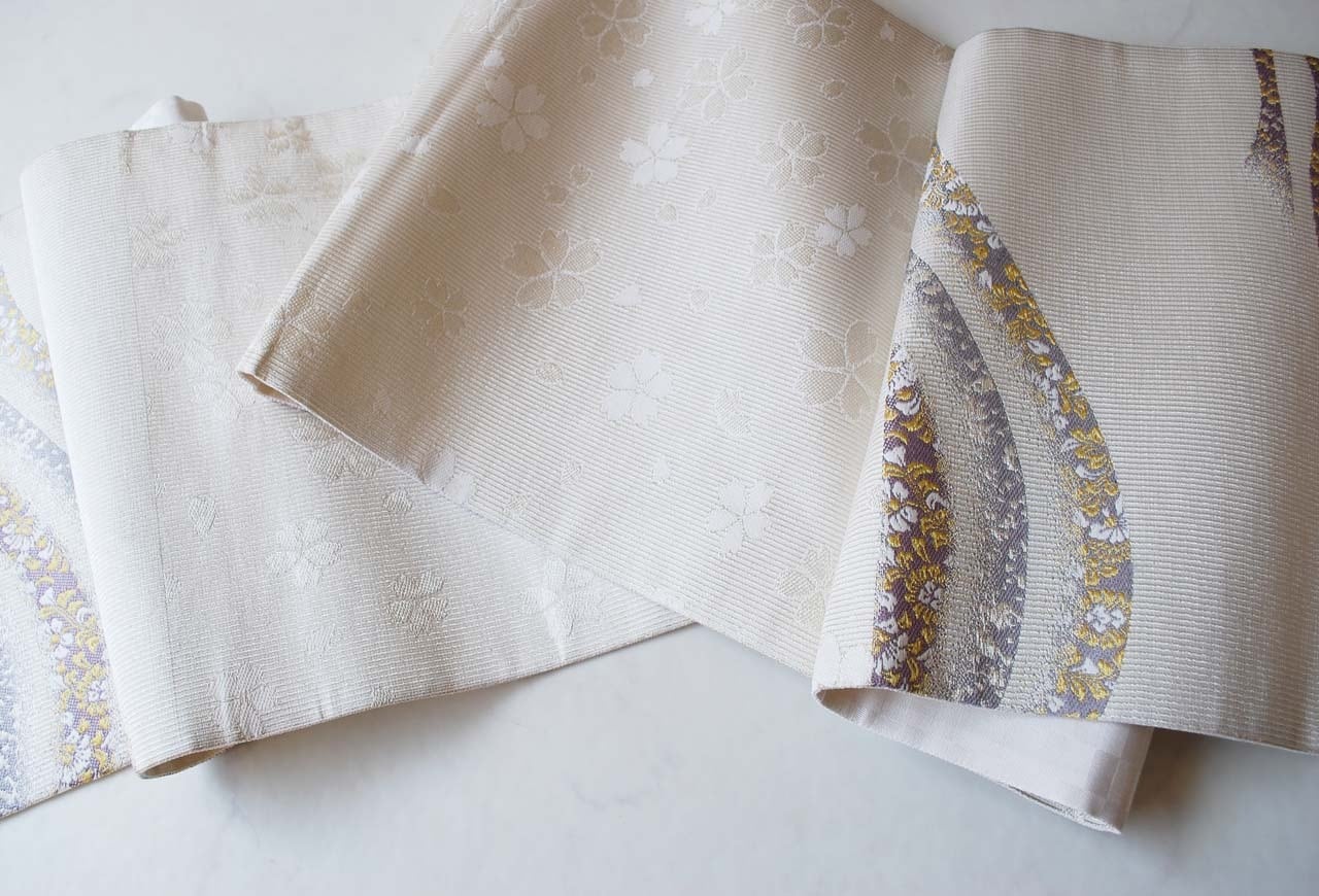 白灰地に曲線に花文のふくろ帯です。