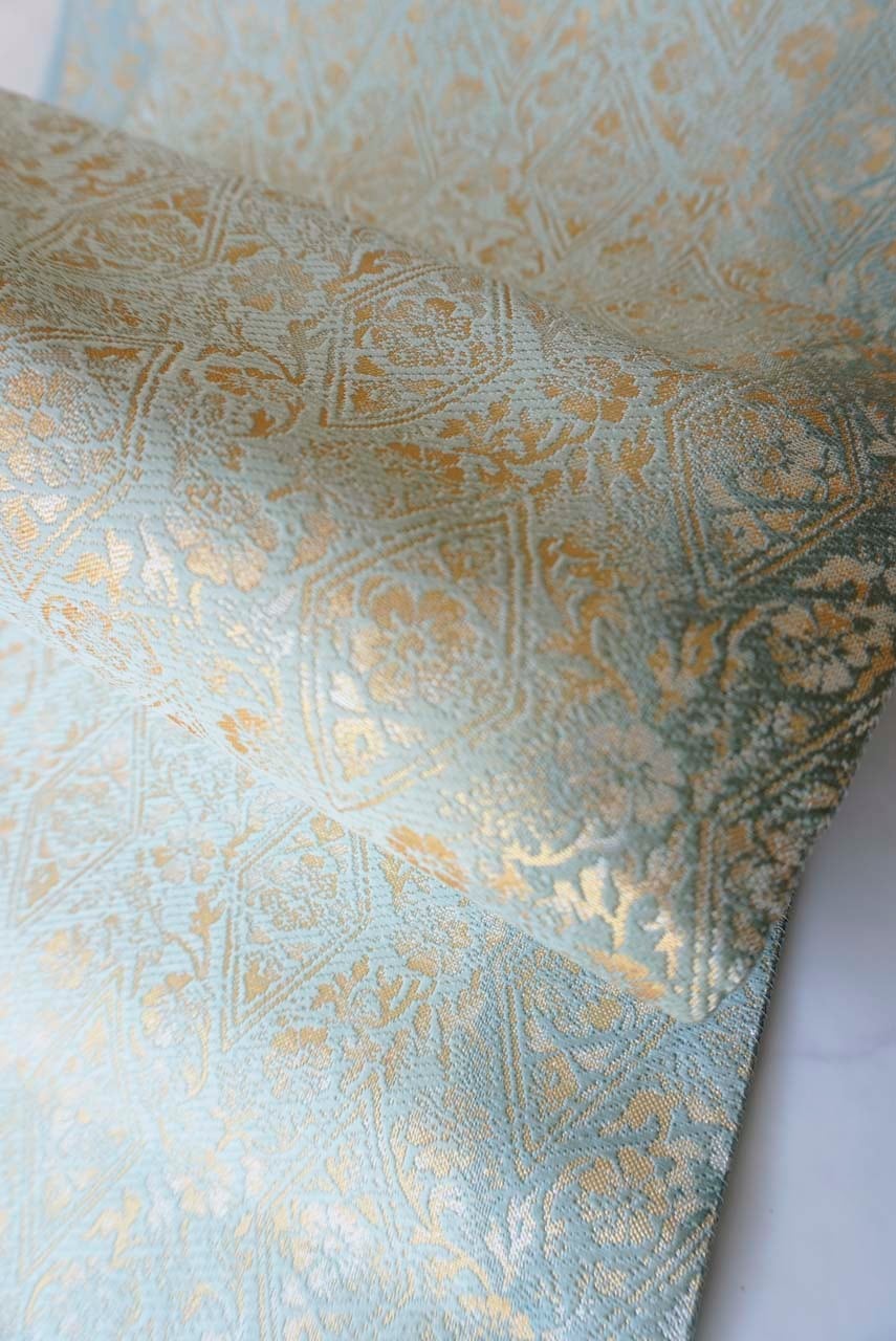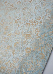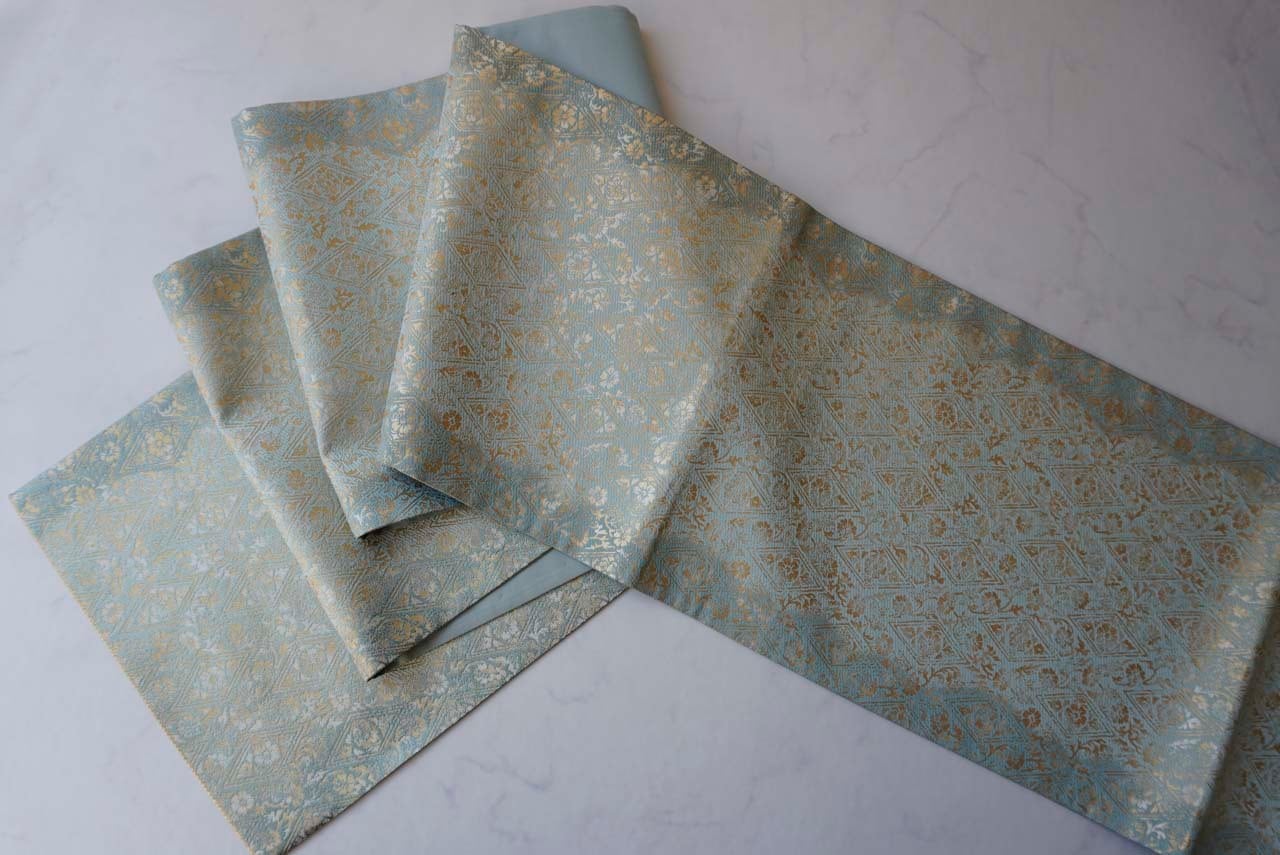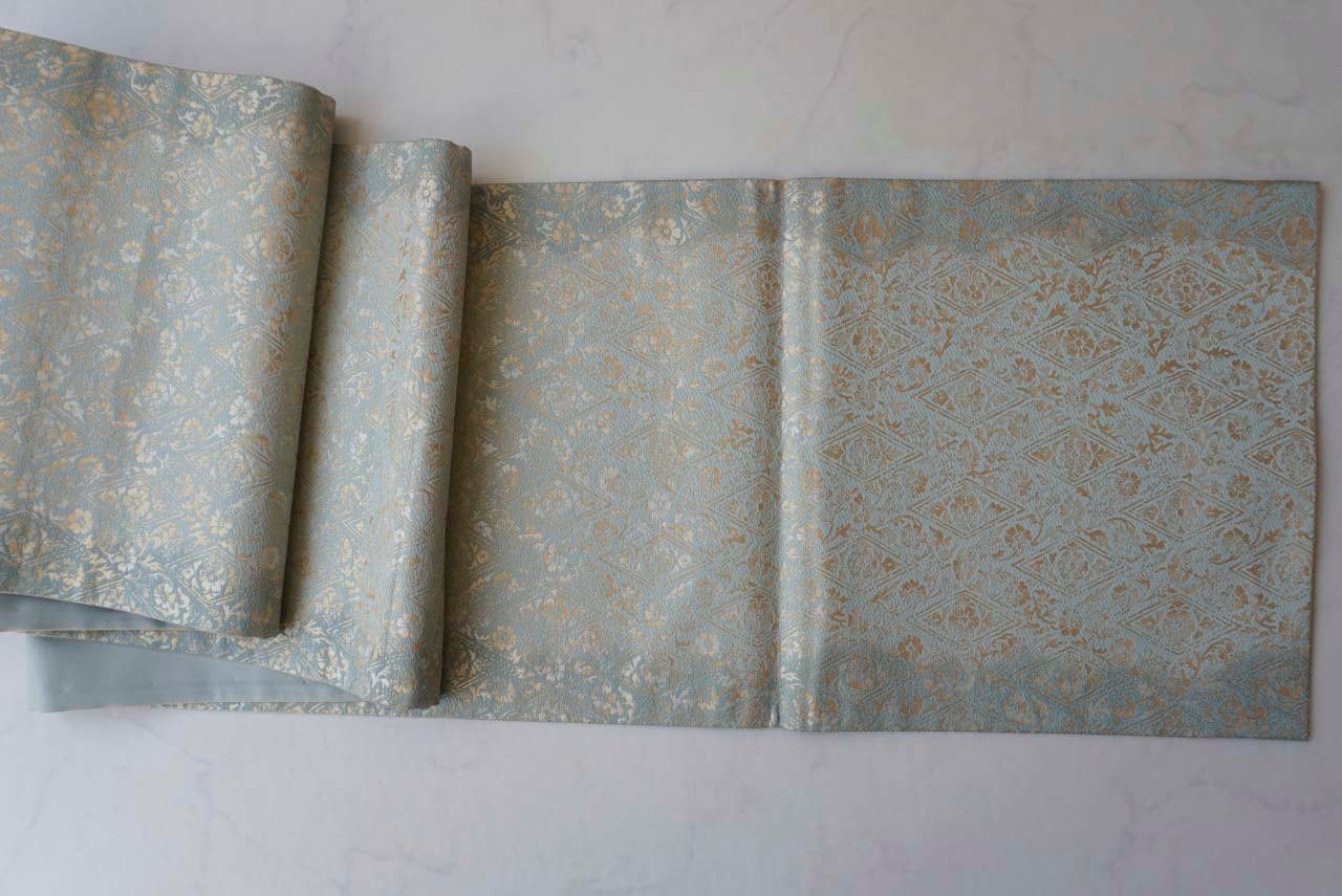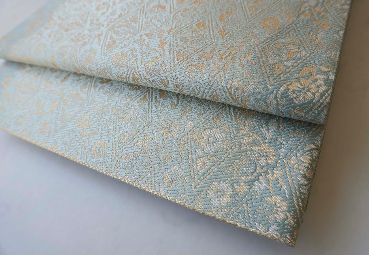 京都・織楽浅野製、千草色の濃淡の地に花唐草菱文の