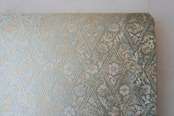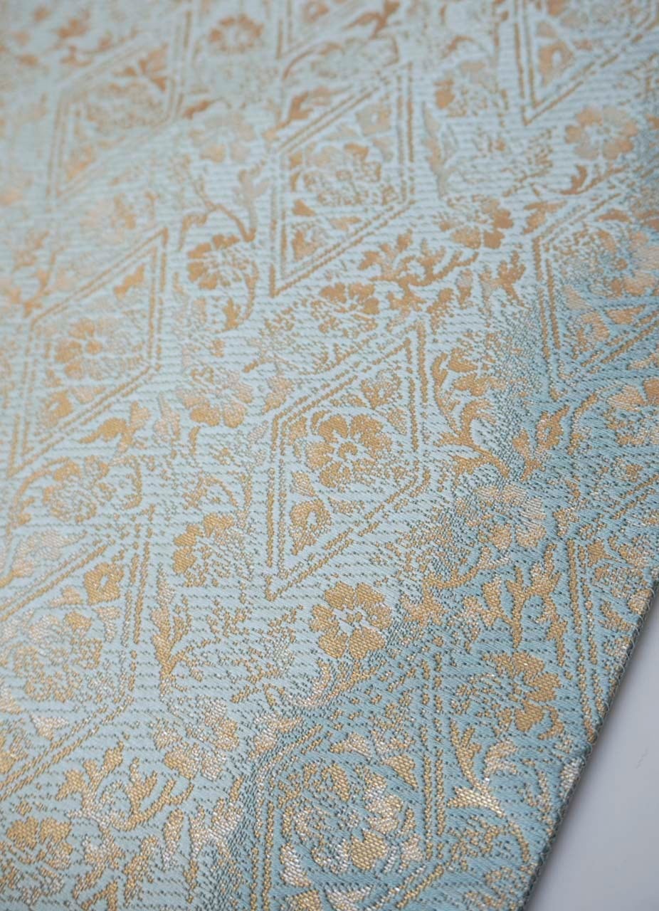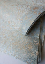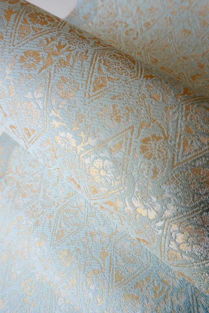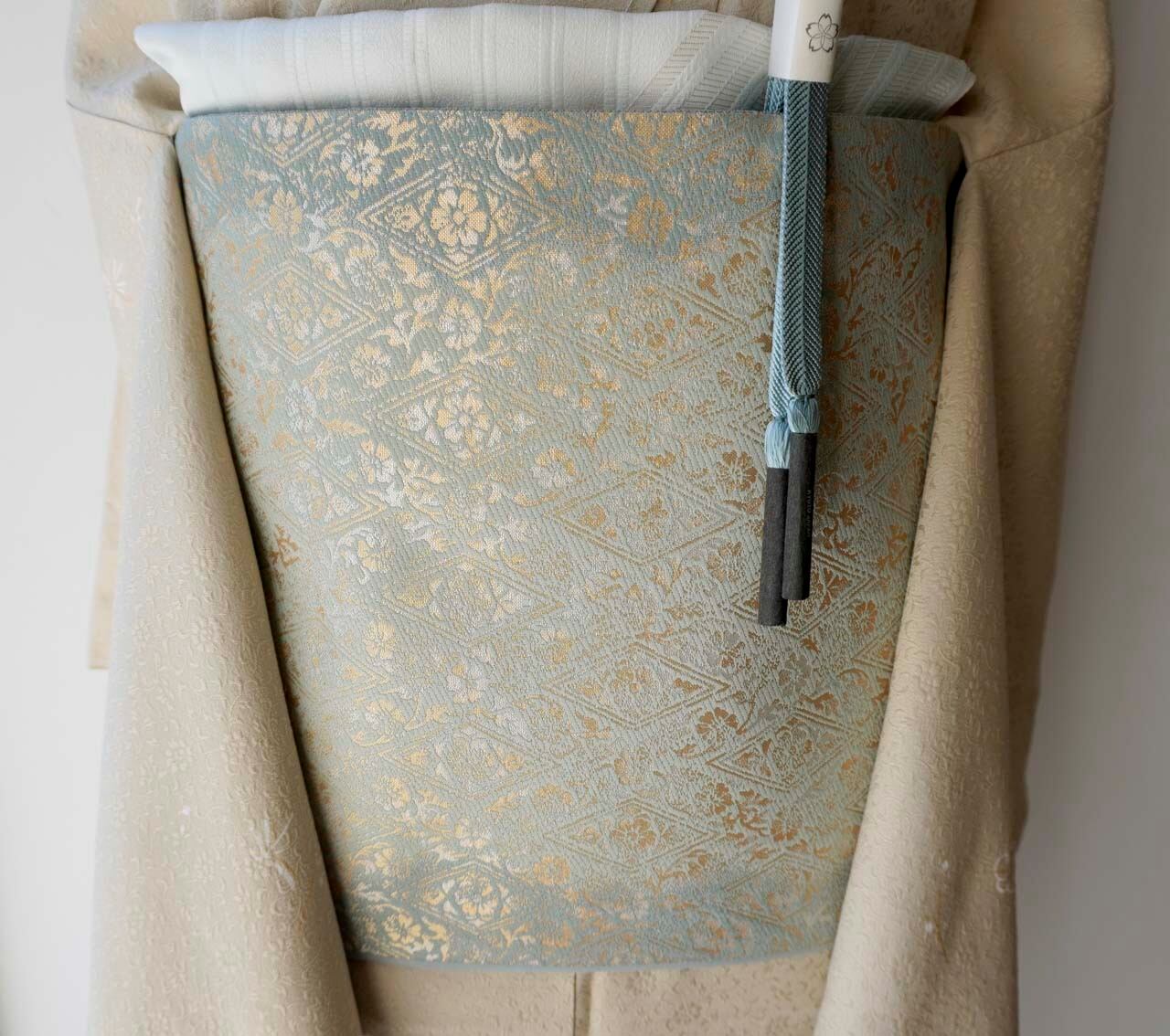 京都・織楽浅野製、千草色の濃淡の地に花唐草菱文の