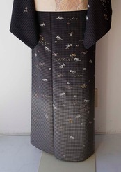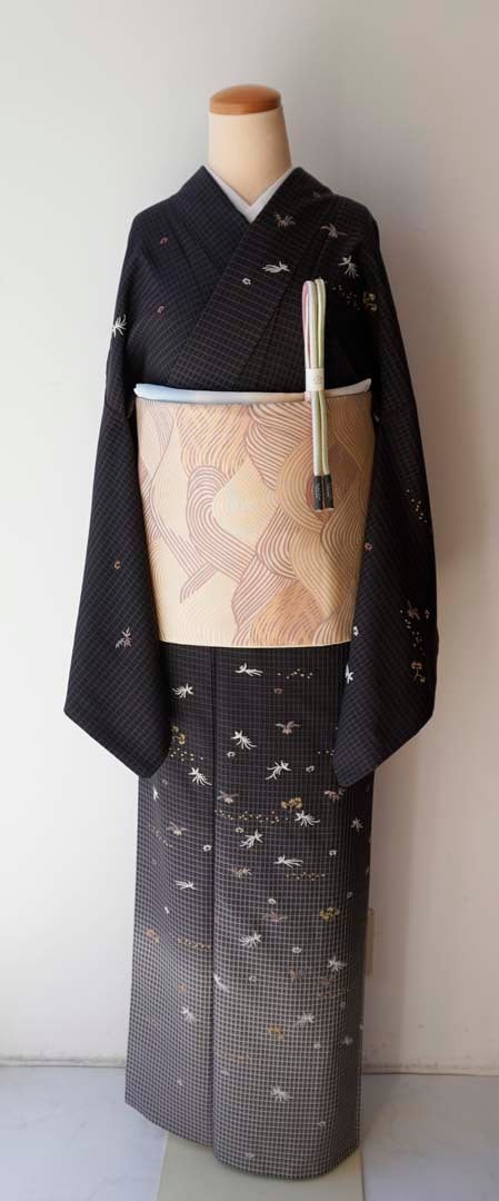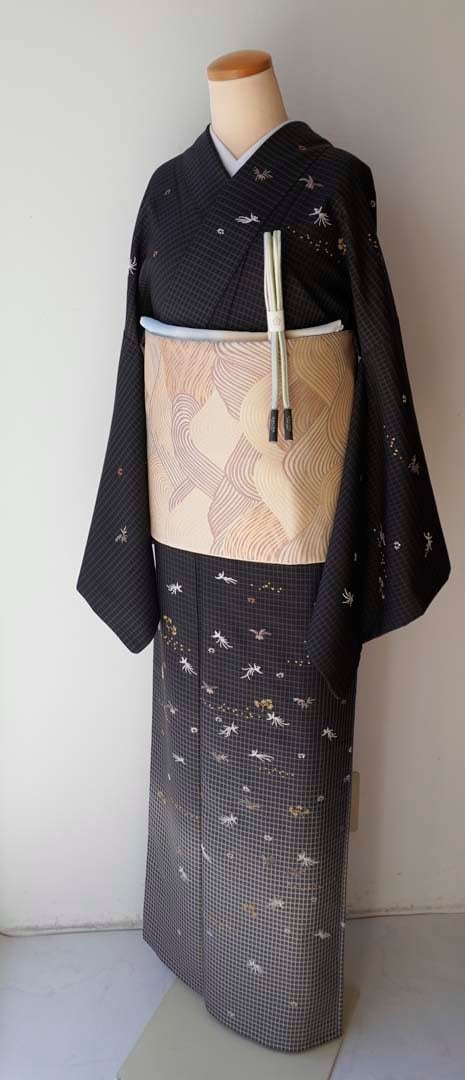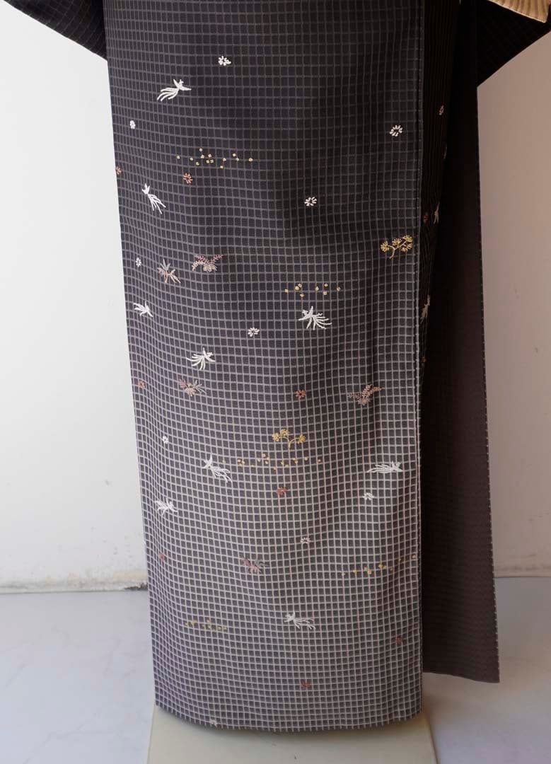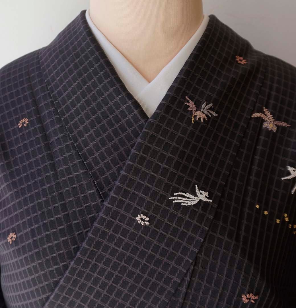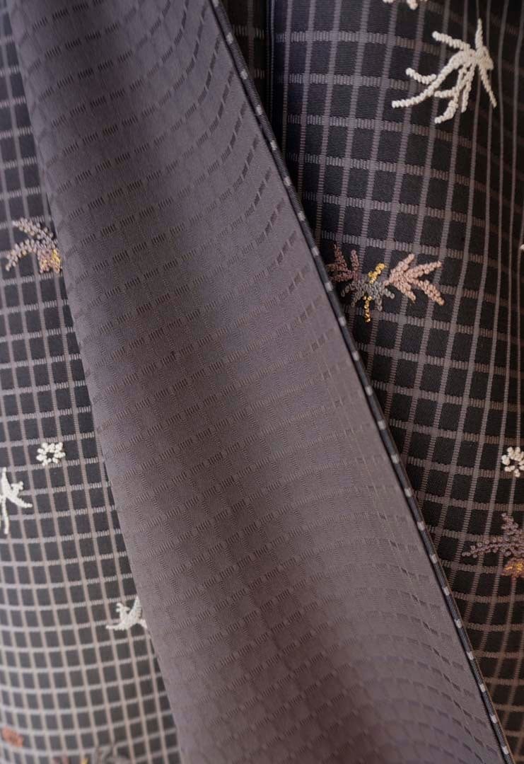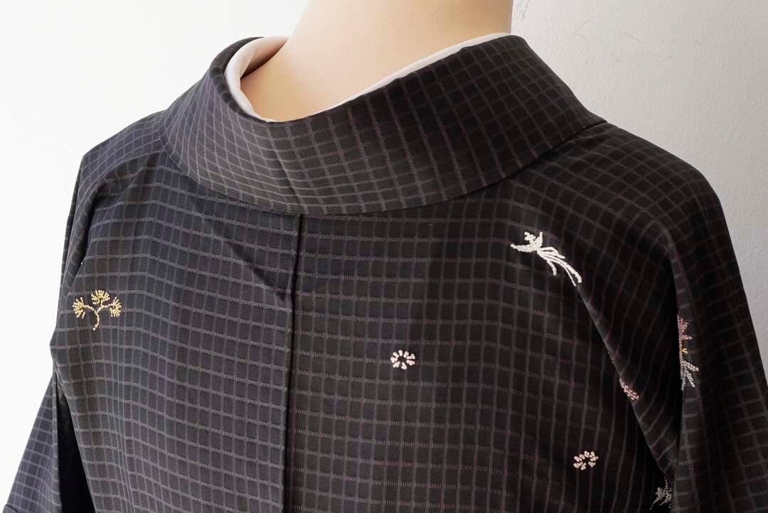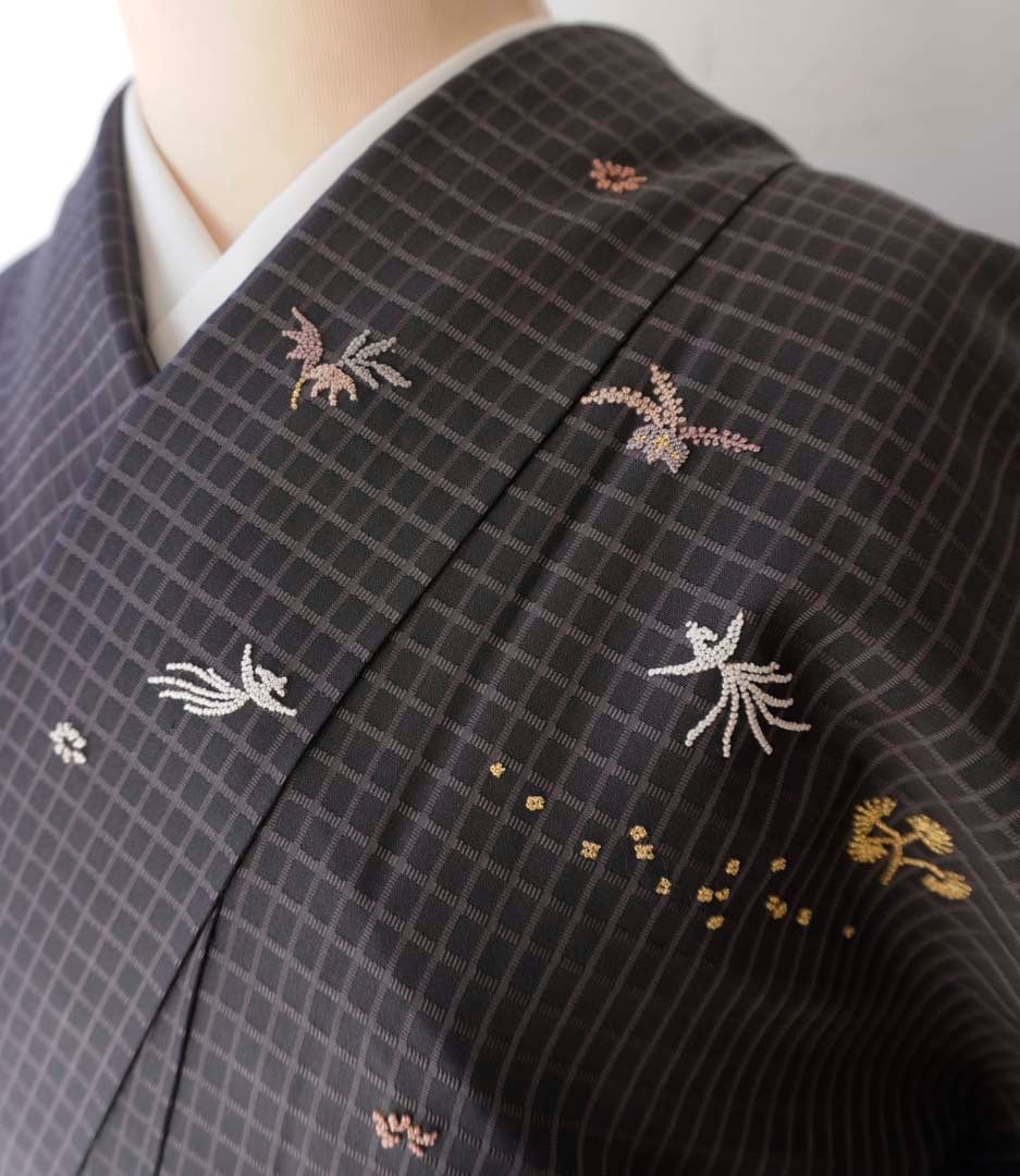 【袷】蝋色地 格子に相良刺繍文 お召し 訪問着