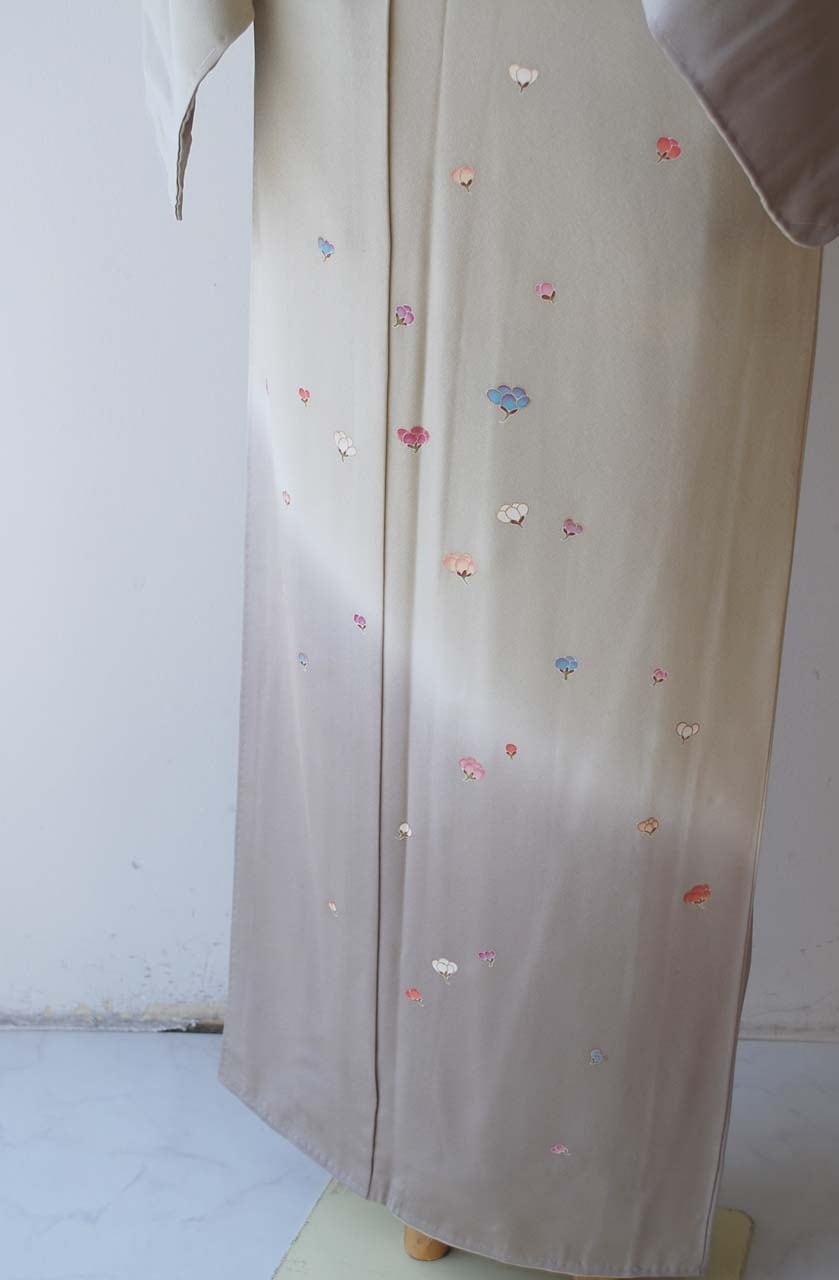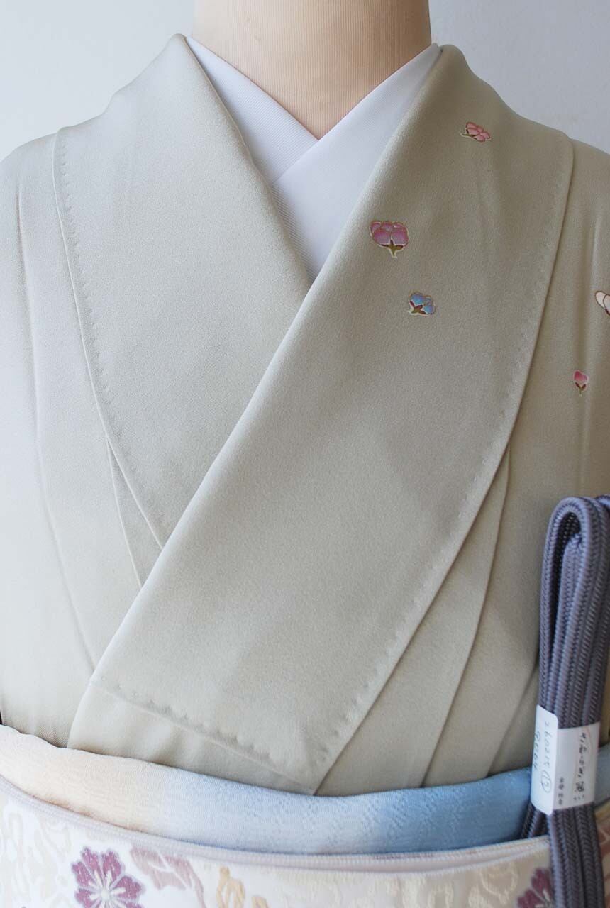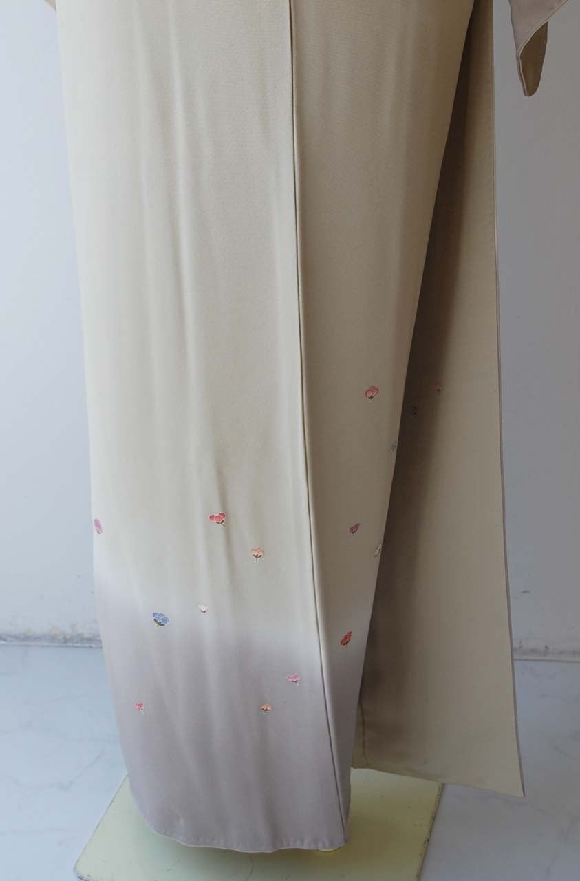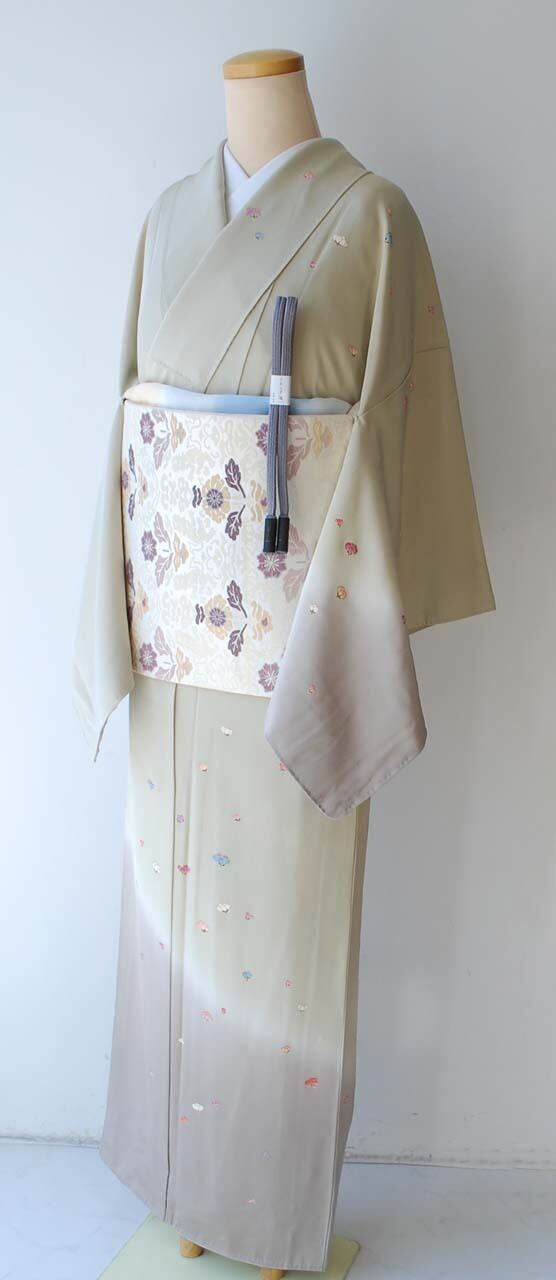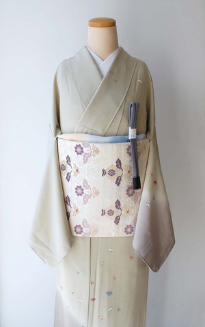 【袷】薄柳色×茶鼠色 裾暈かし 小花柄 訪問着