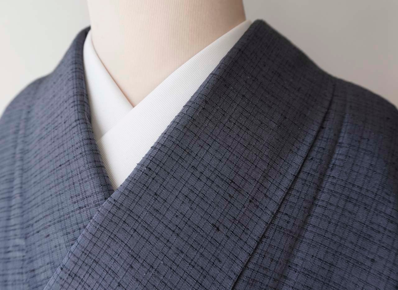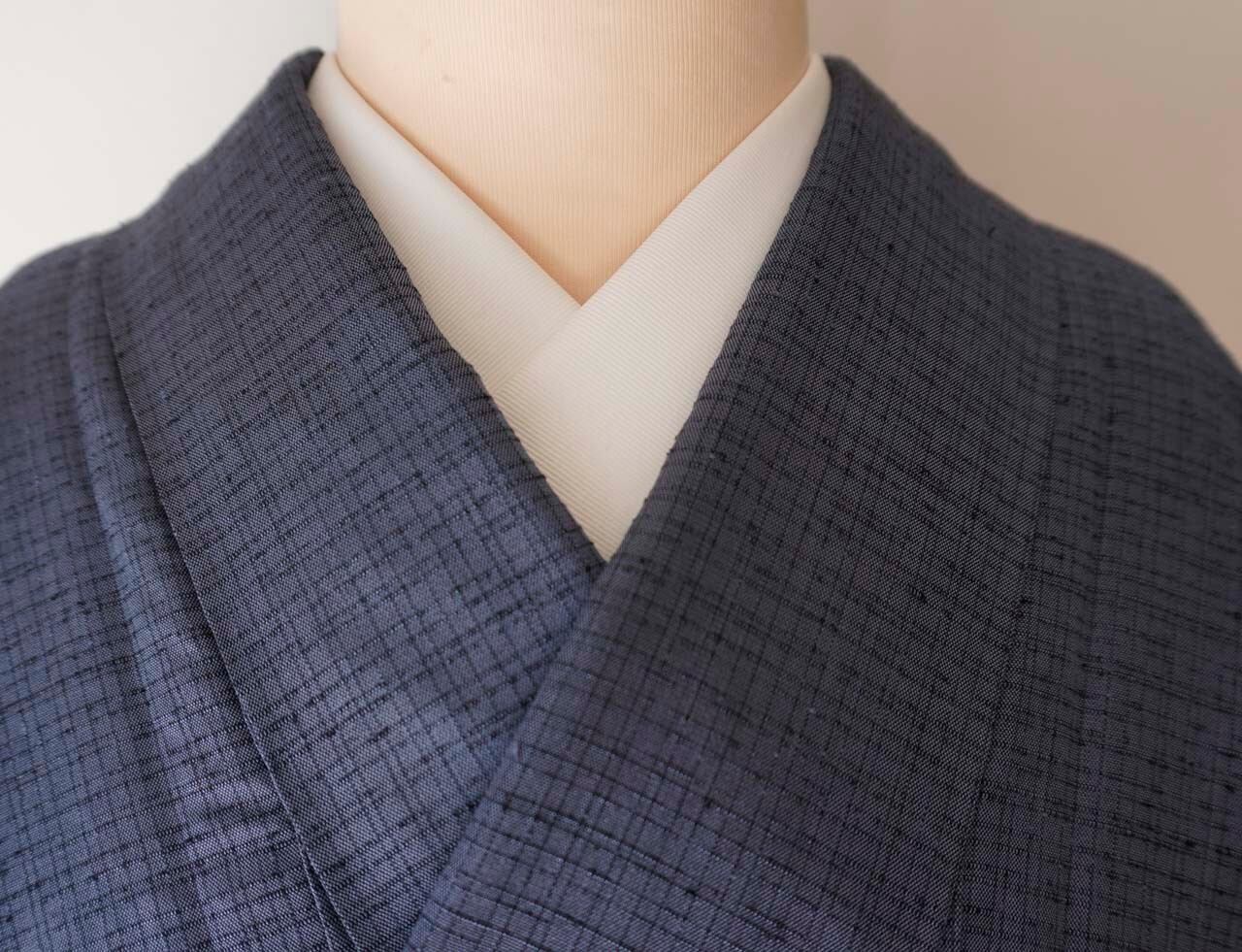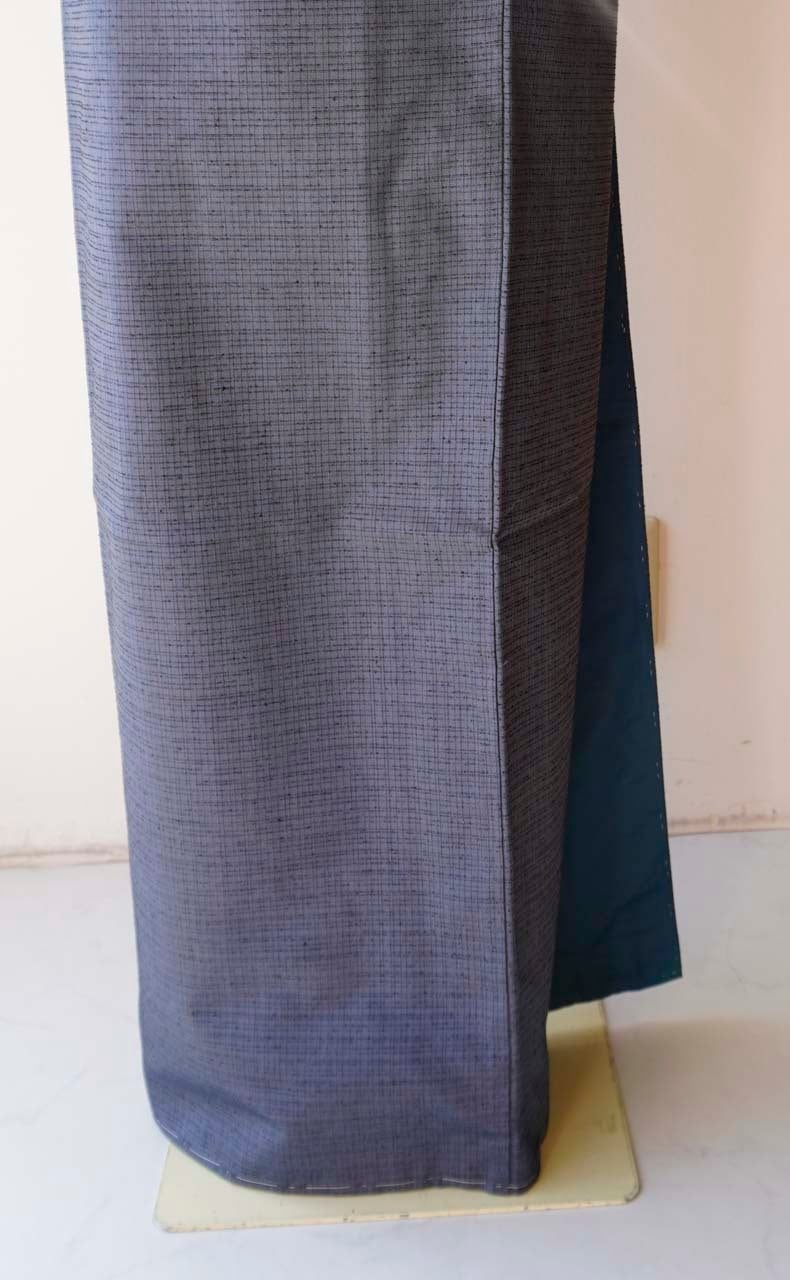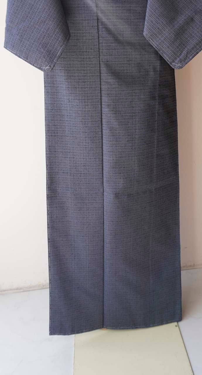 【袷】灰紺系色 格子文 米沢織 生つむぎ