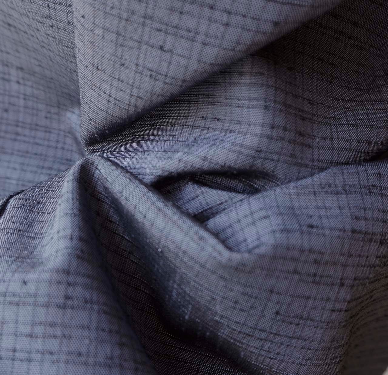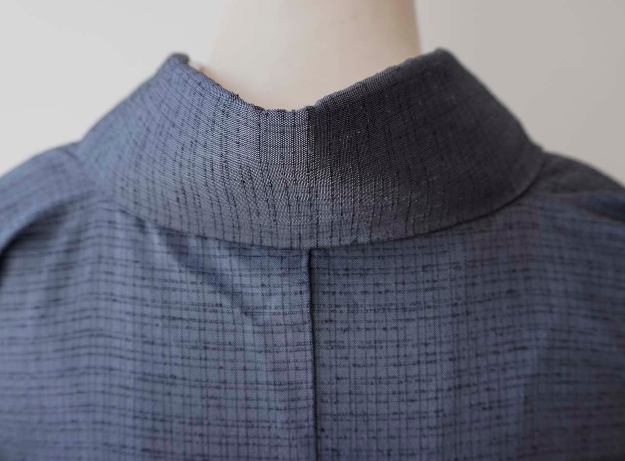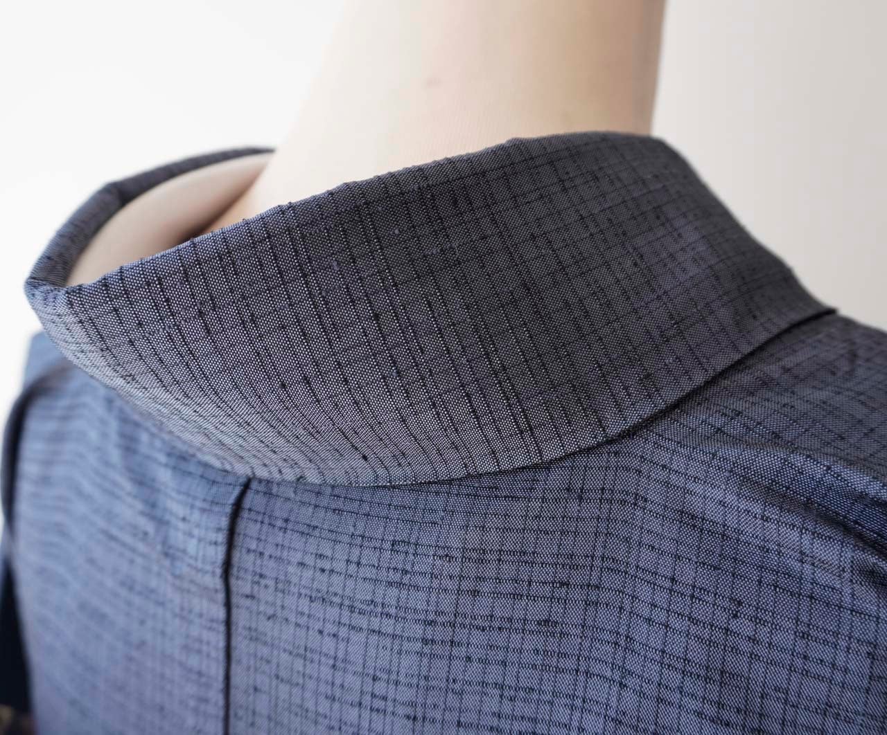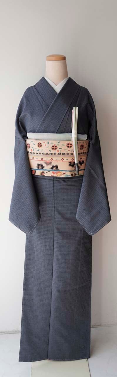 【袷】灰紺系色 格子文 米沢織 生つむぎ