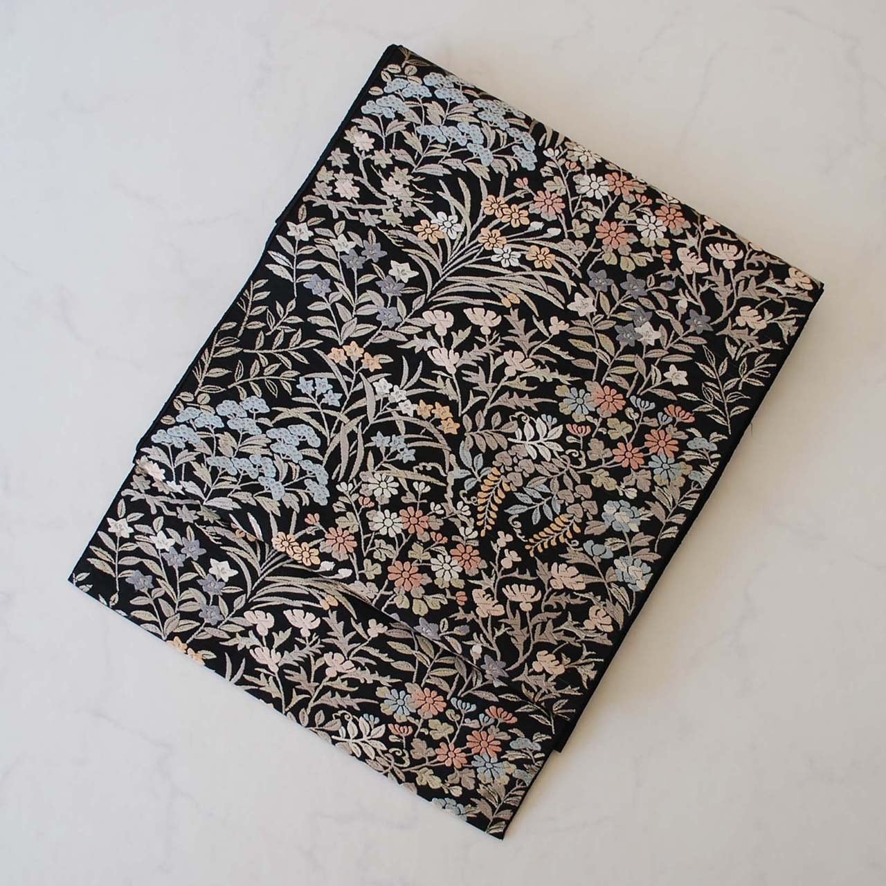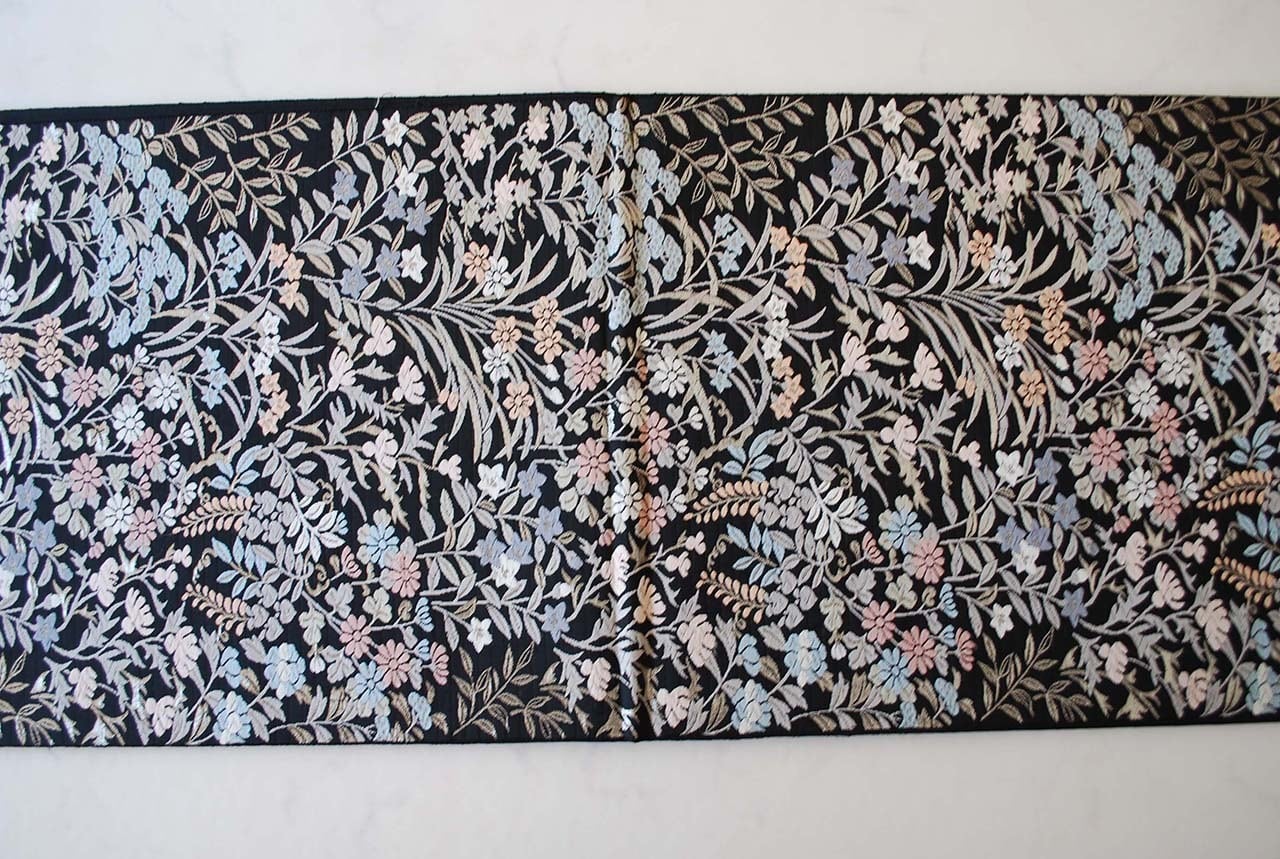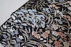【ふくろ帯】青々庵・服部織物 黒地四季花文 唐織ふくろ帯