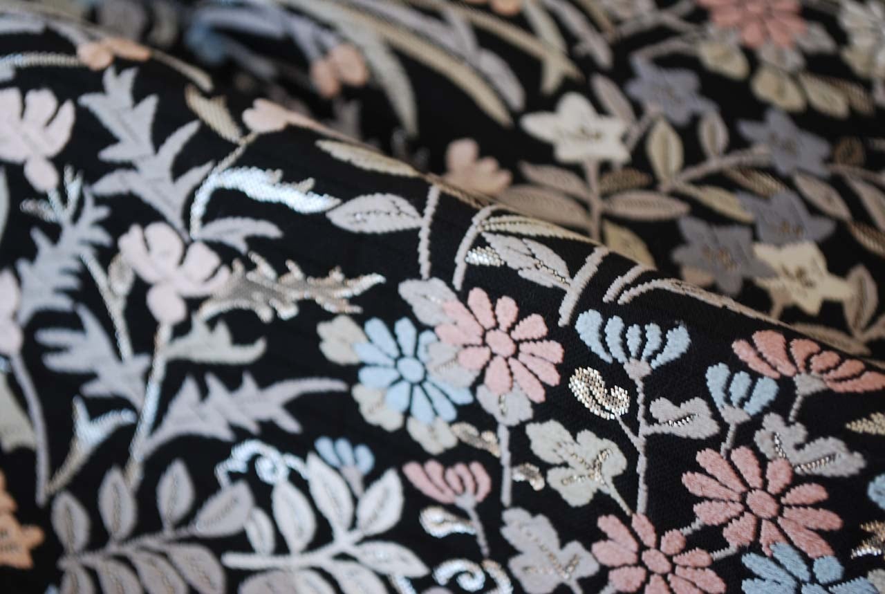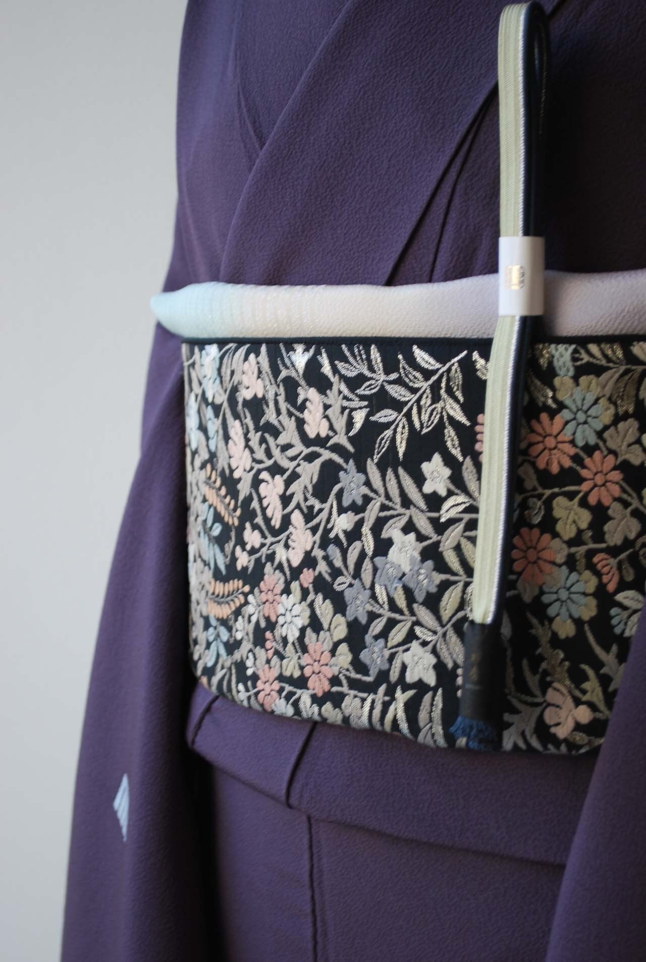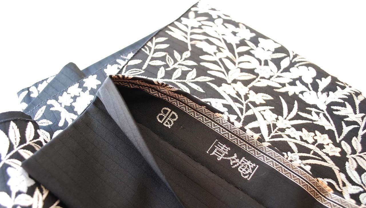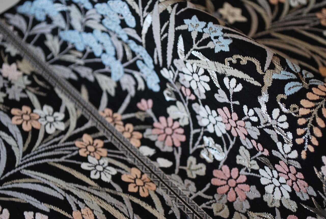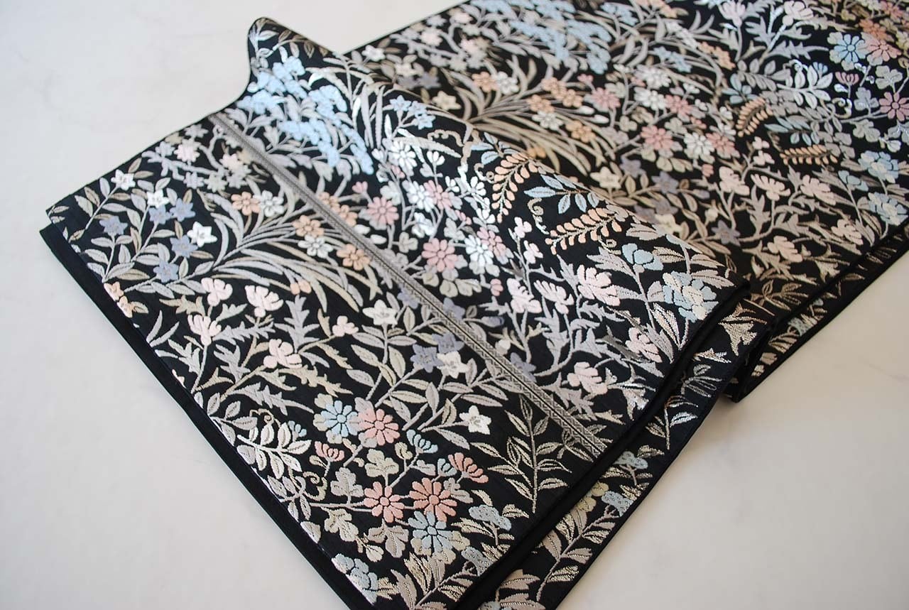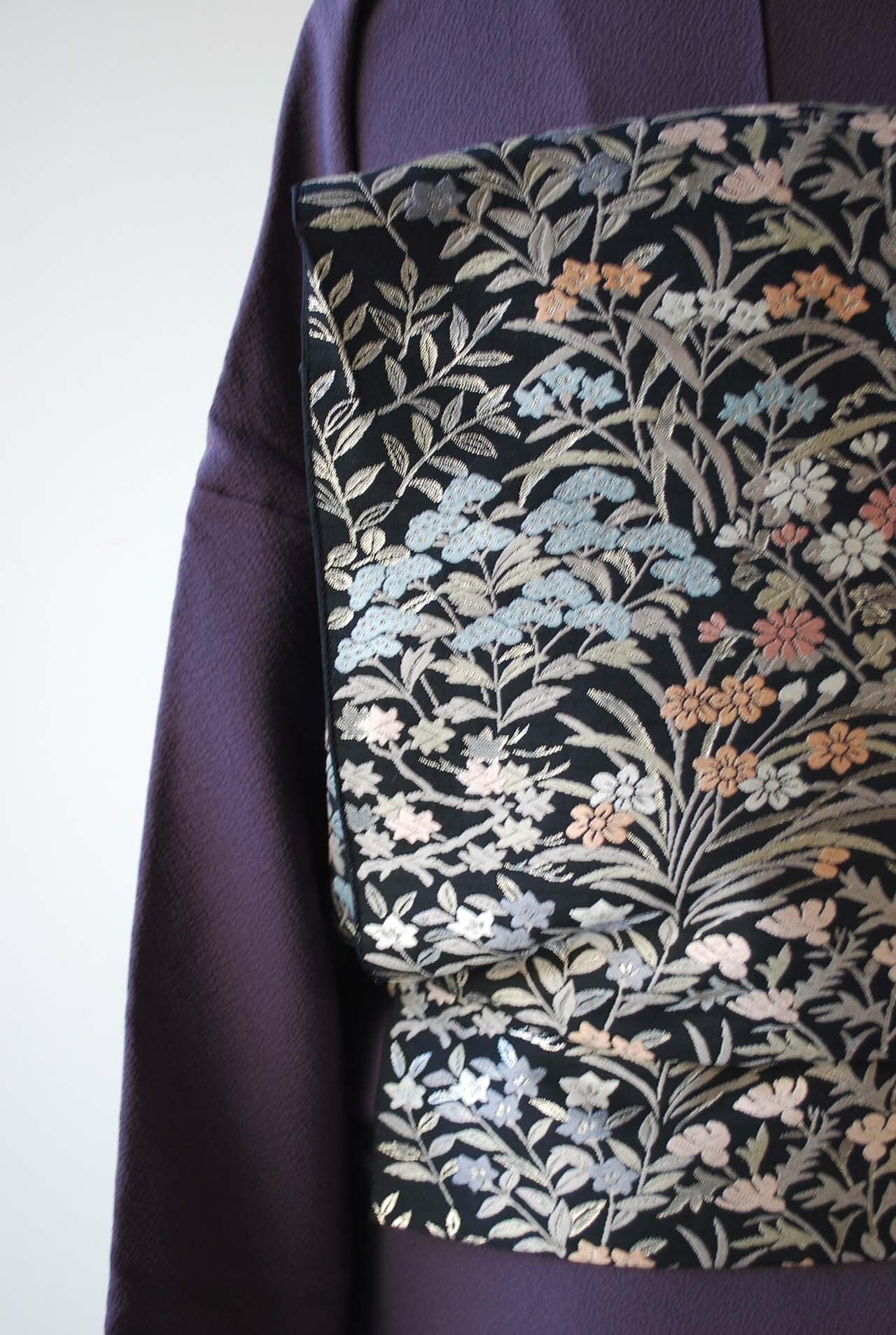 青々庵・服部織物の黒地に唐織が映える袋帯です。