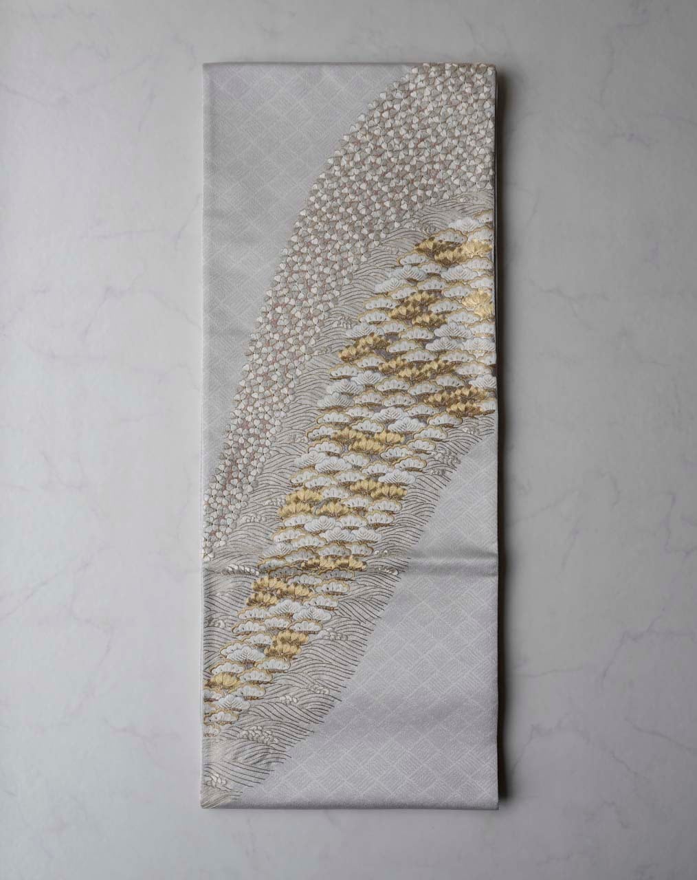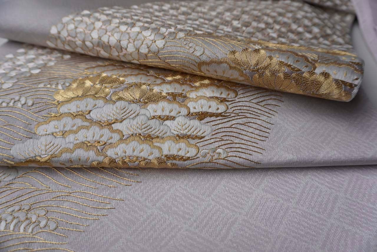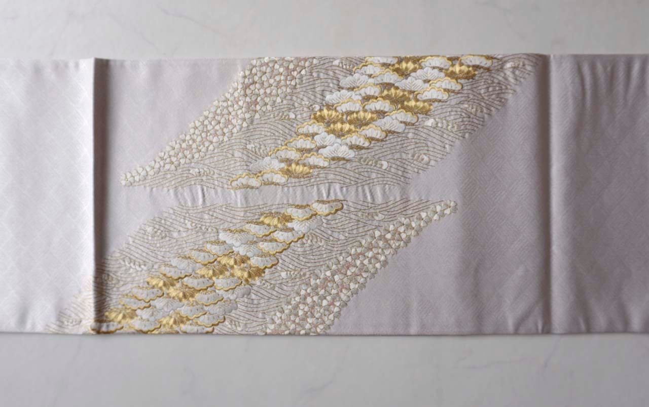網代文の帯地に小桜、笠松、波頭の手刺繍と