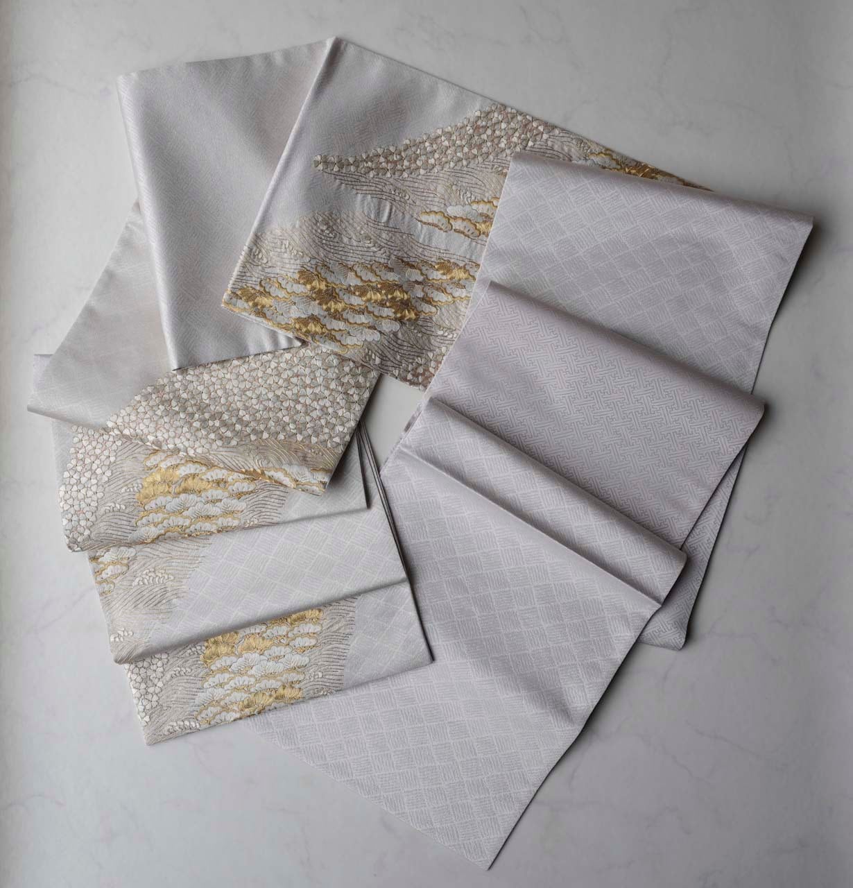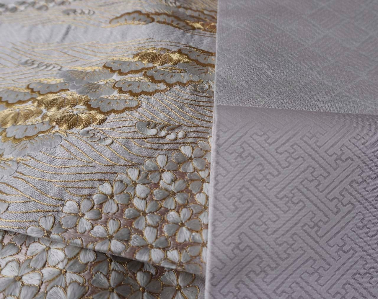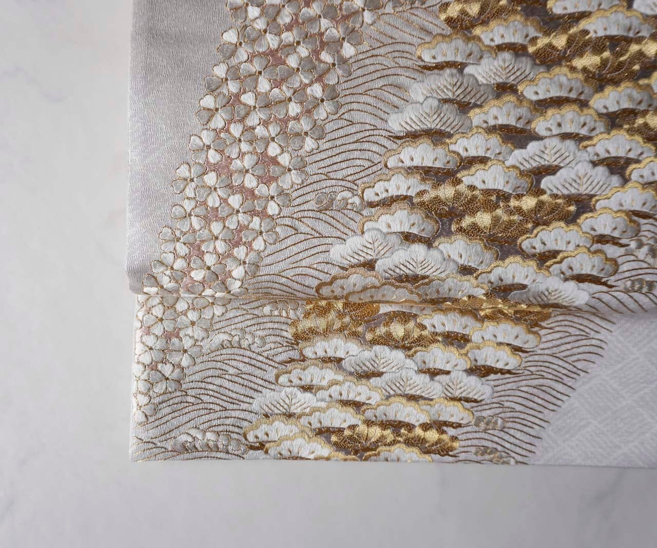 網代文の帯地に小桜、笠松、波頭の手刺繍と