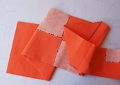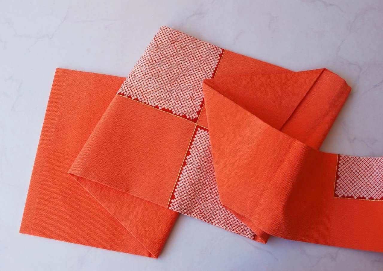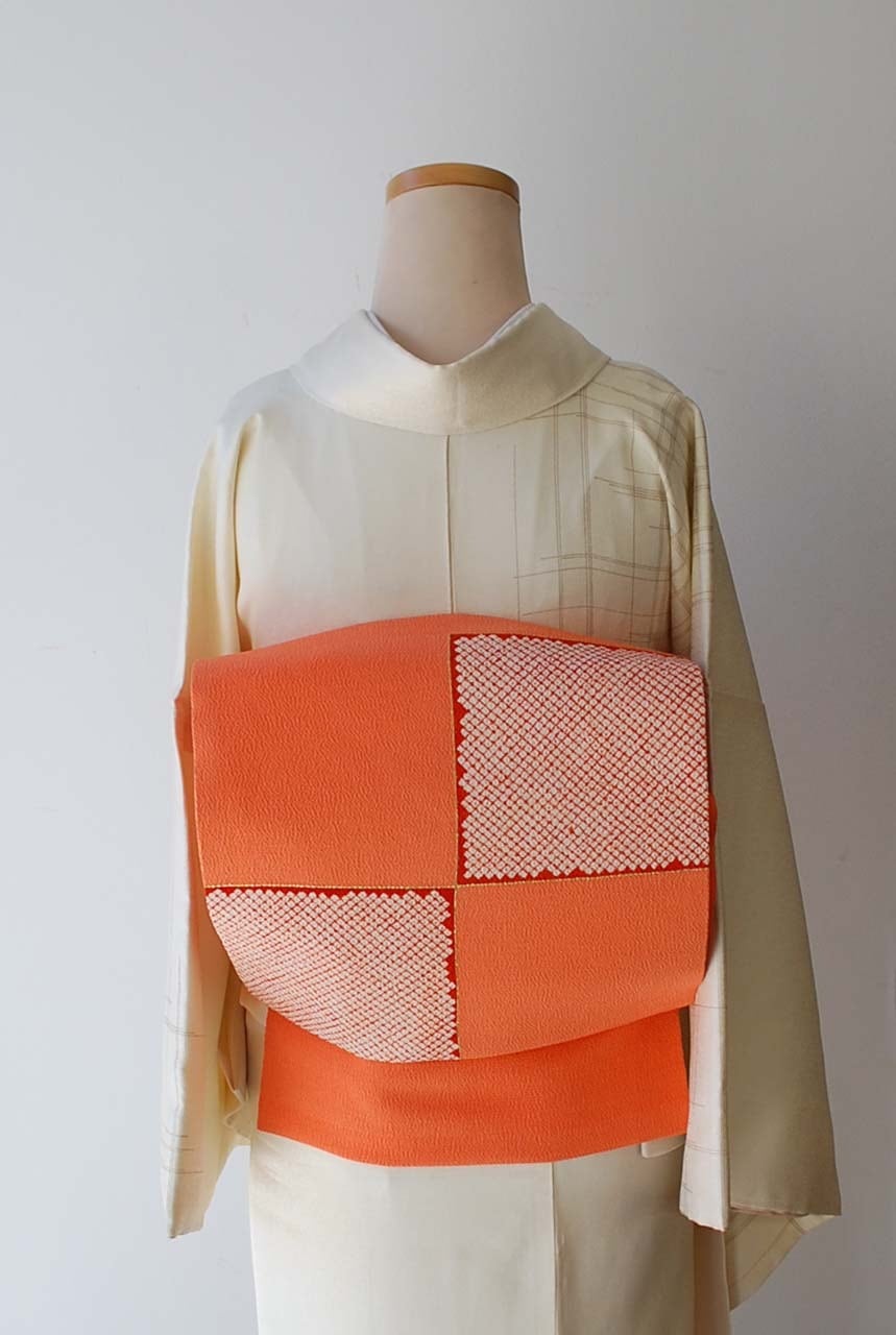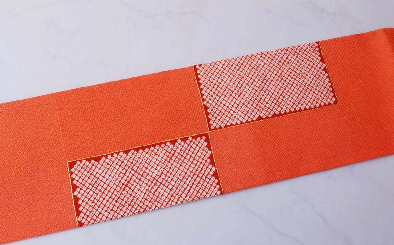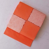 【なごや帯】に志田製 橙系 市松に疋田絞り文 縮緬地 なごや帯