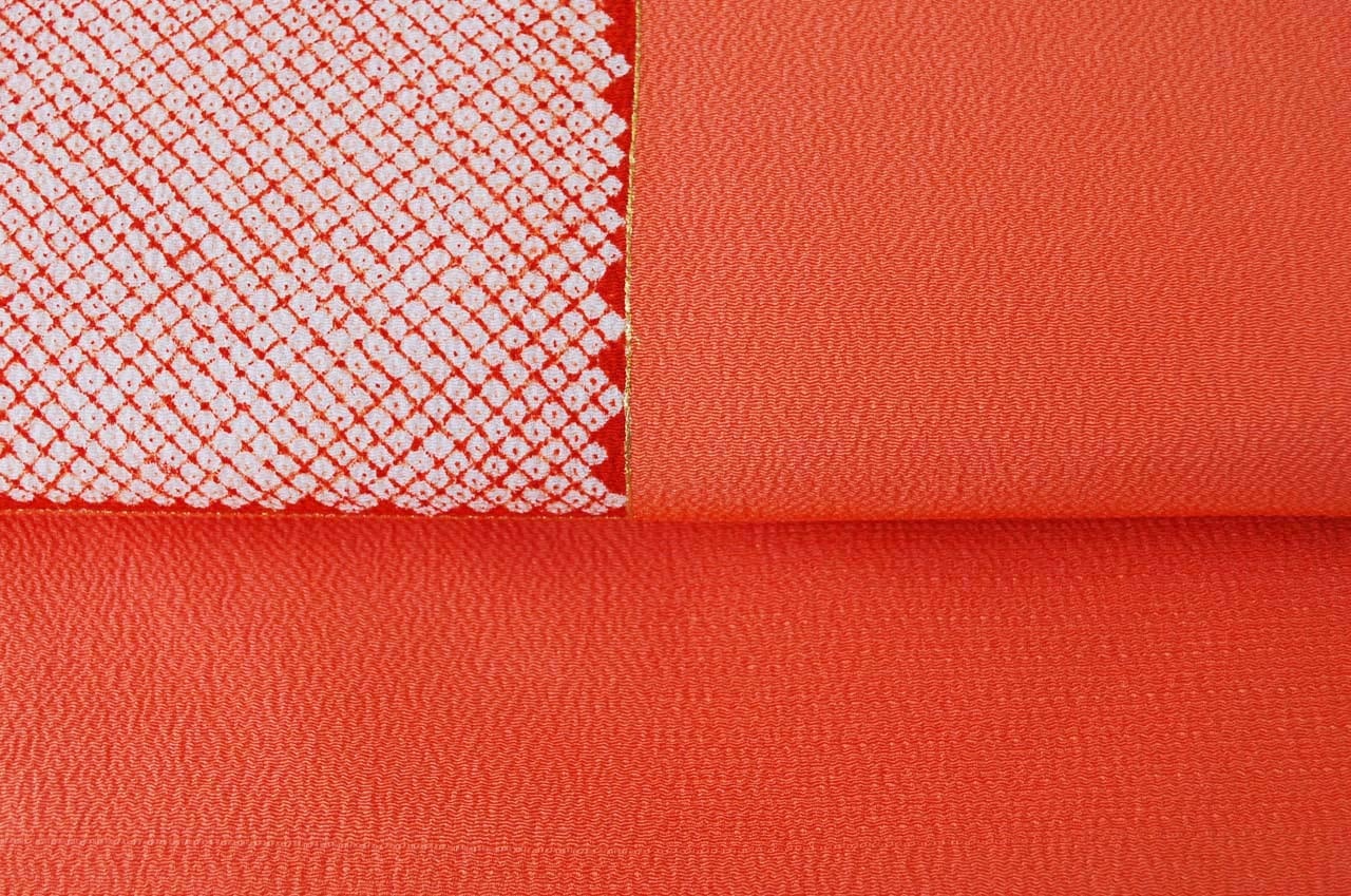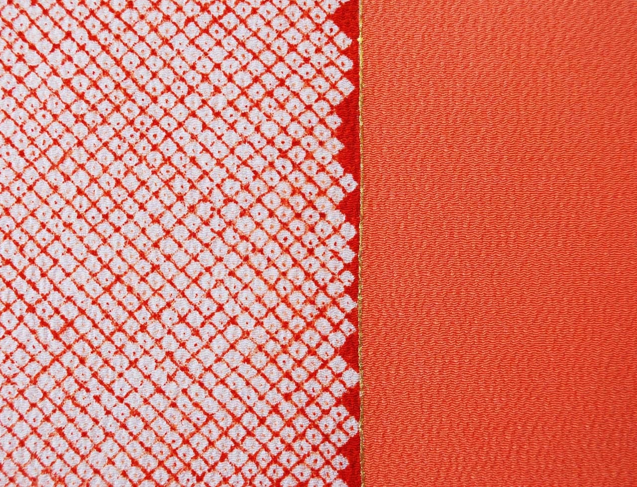 鮮やかな紅白の疋田絞り文が染められ、