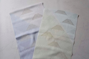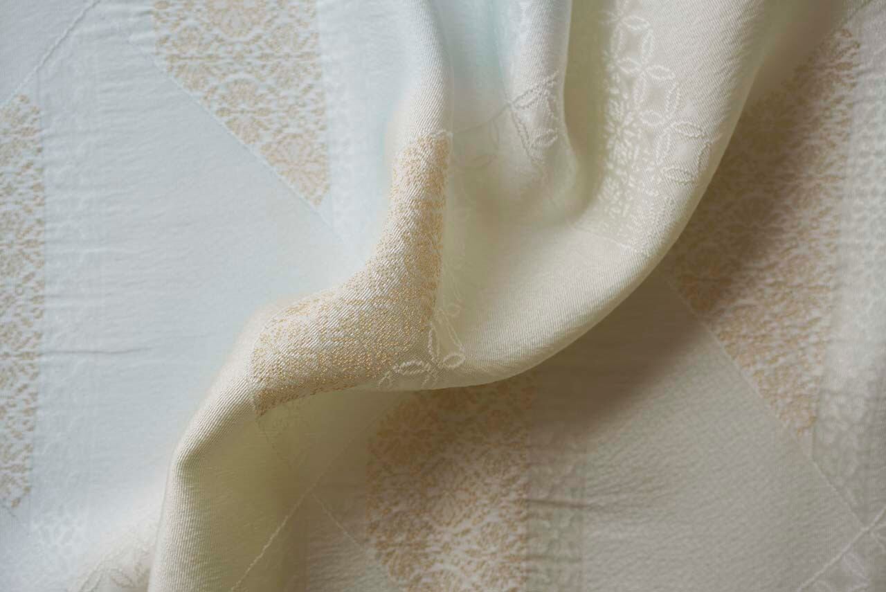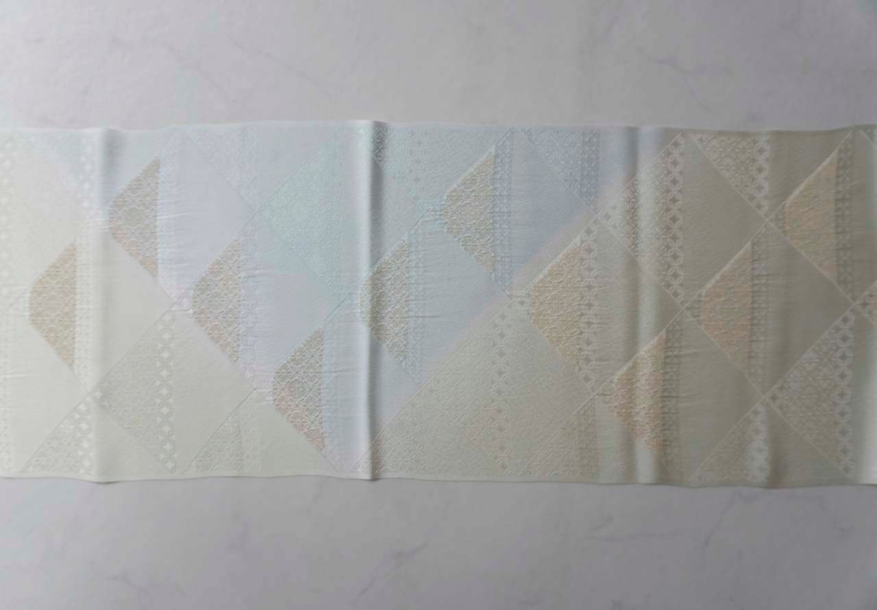 菱格子の上部の三角形に金糸で花紋、