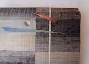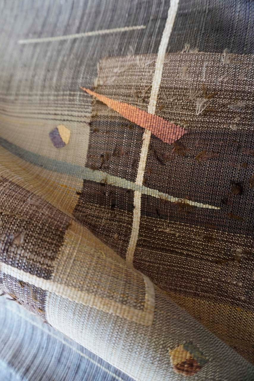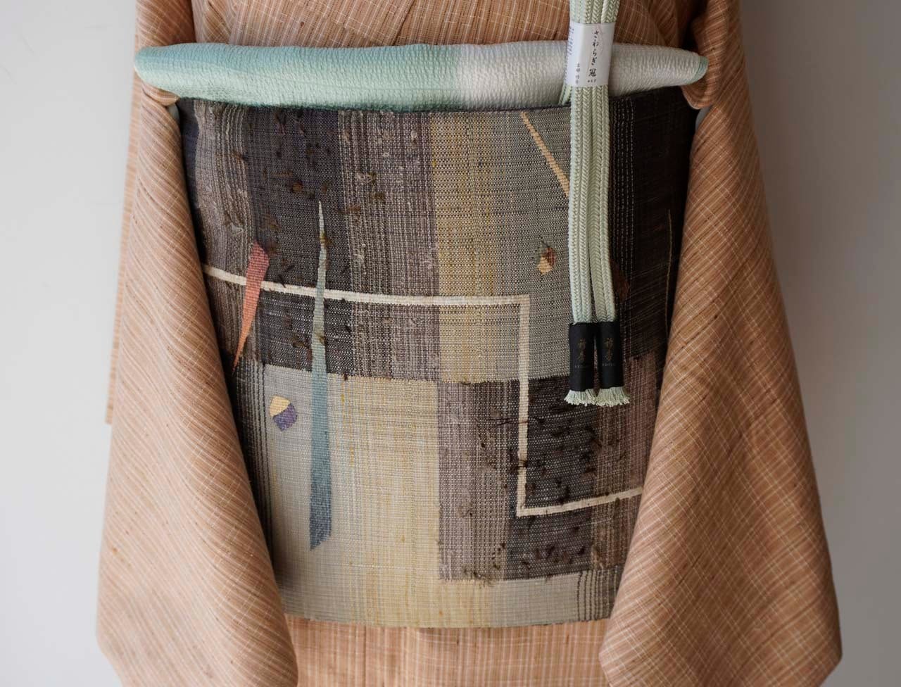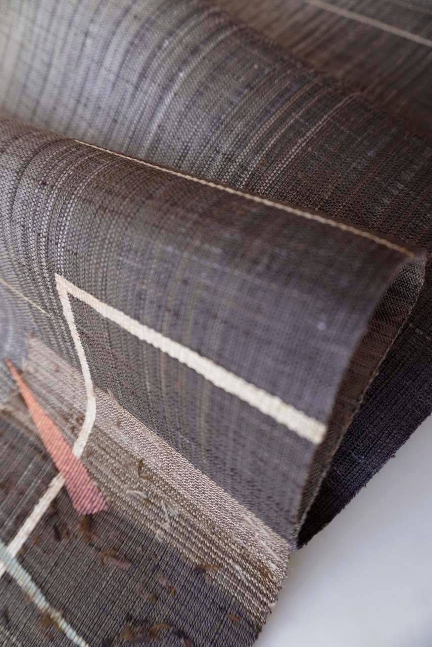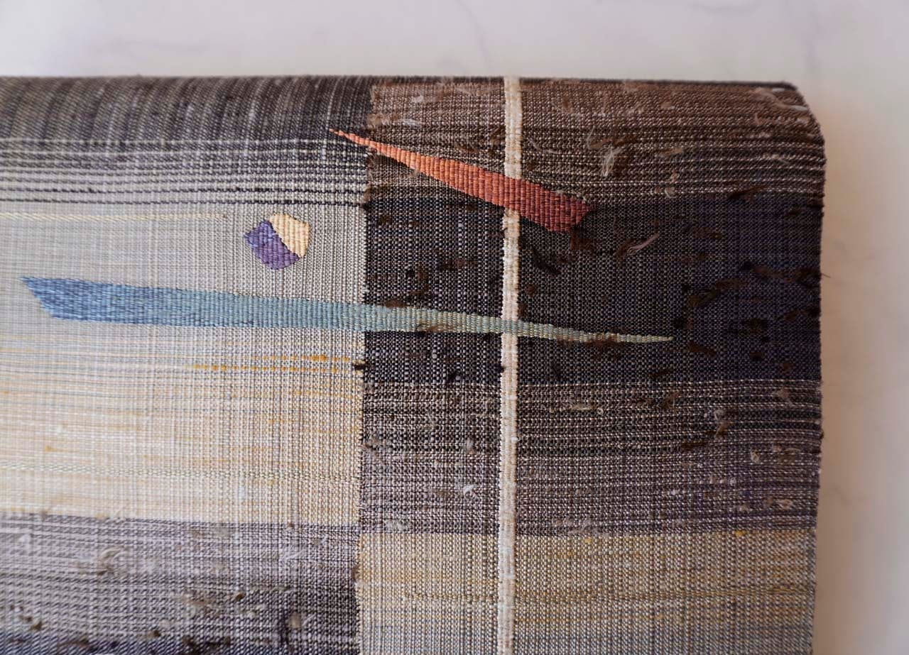 幾何学抽象文の柿渋染めの紬の袋帯です。