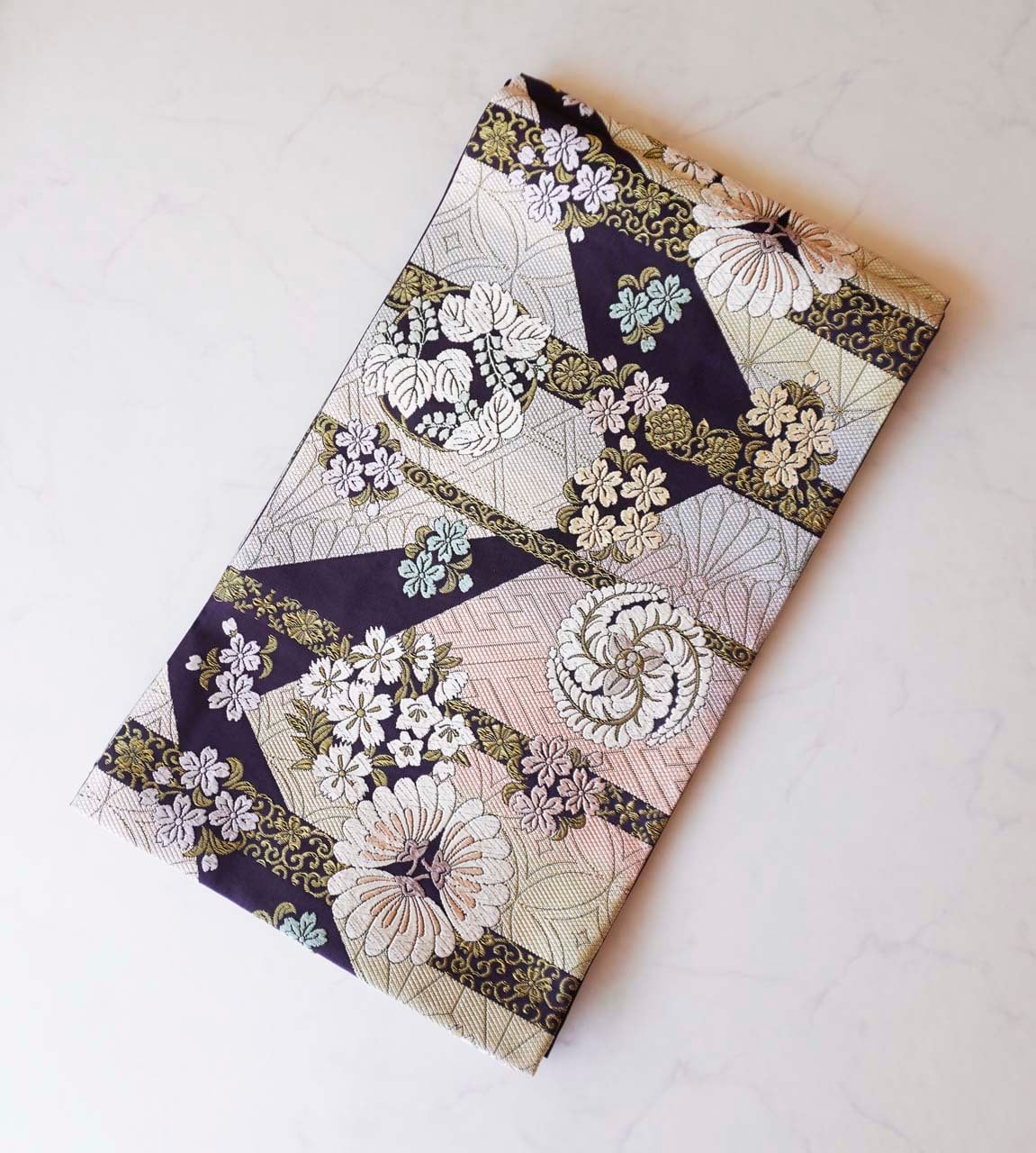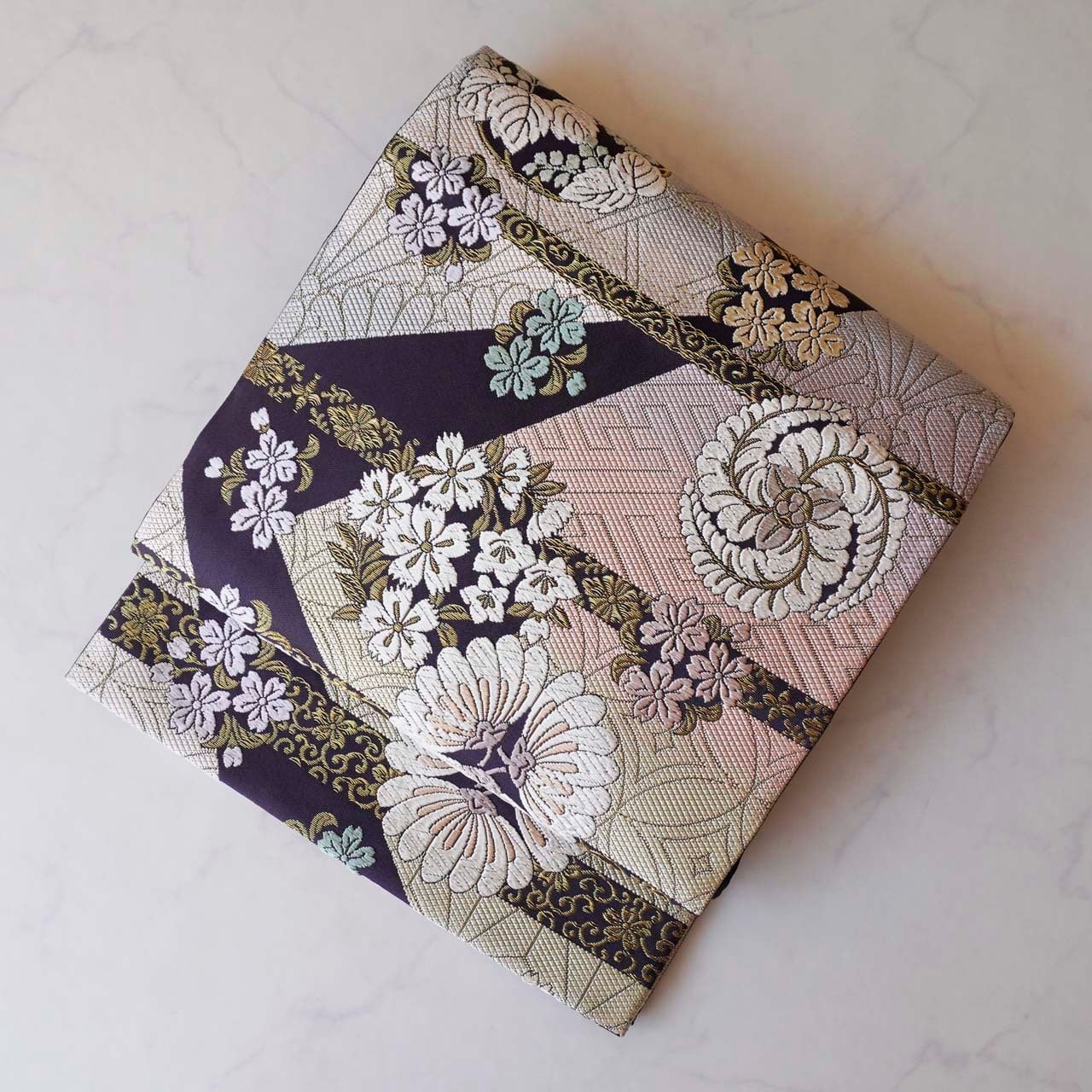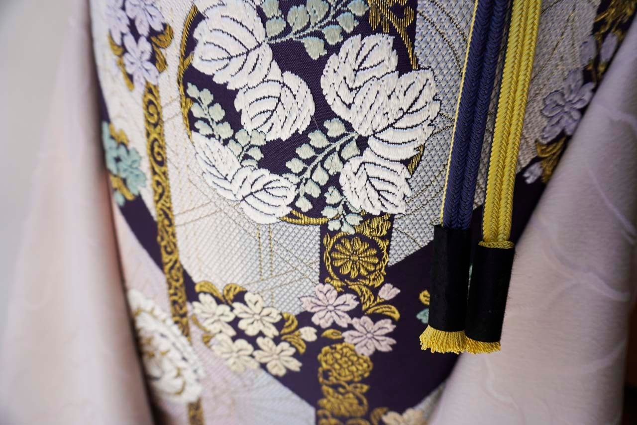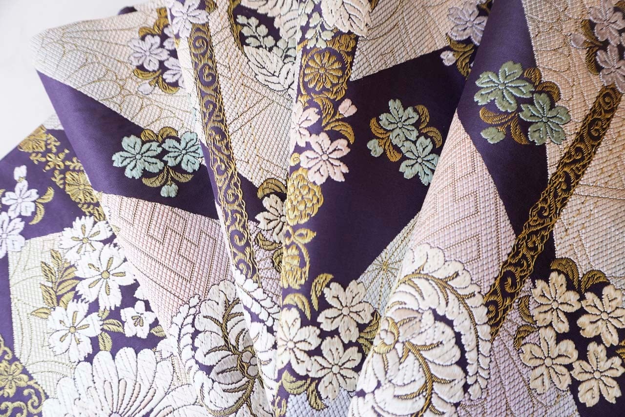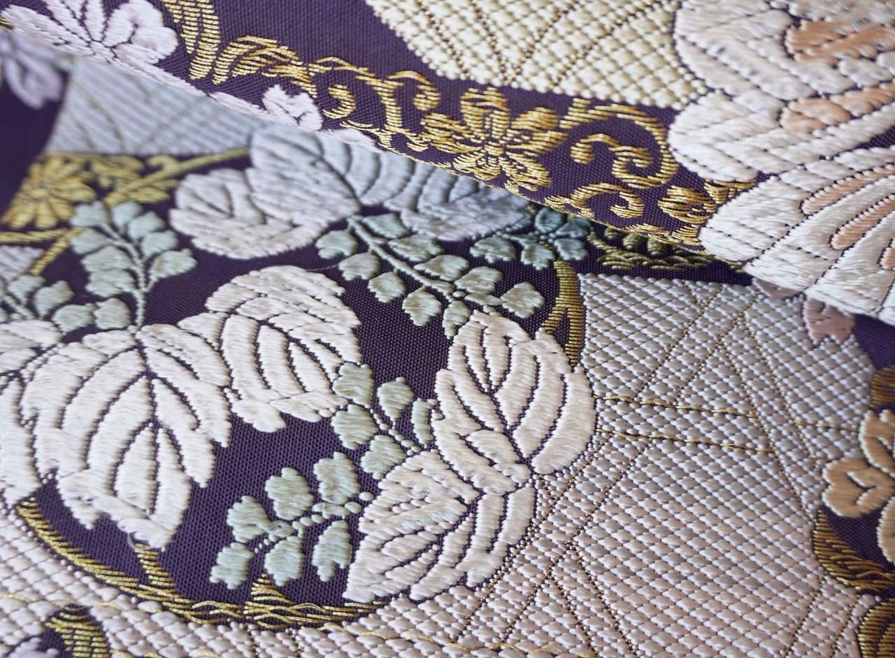 様々な吉祥文様と花々が唐織りで