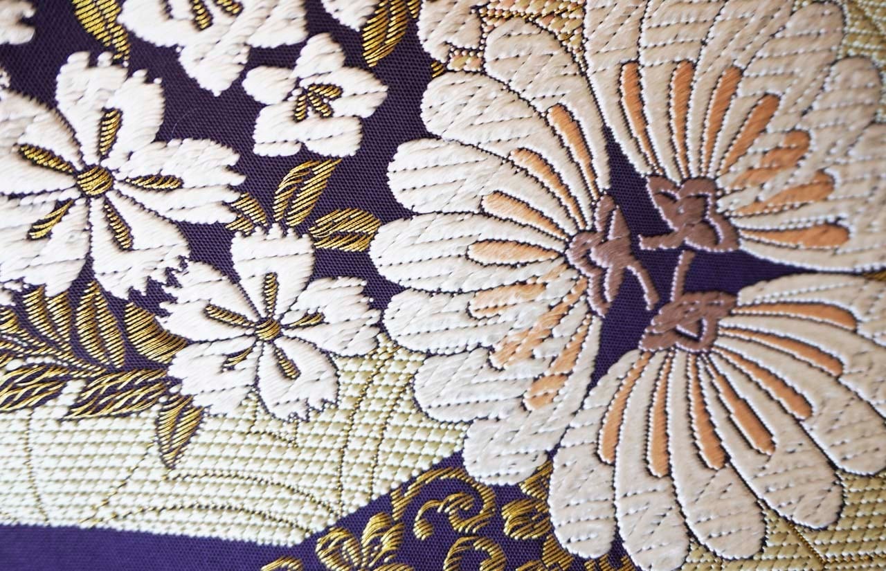 唐織りされた花々は、見る角度によって