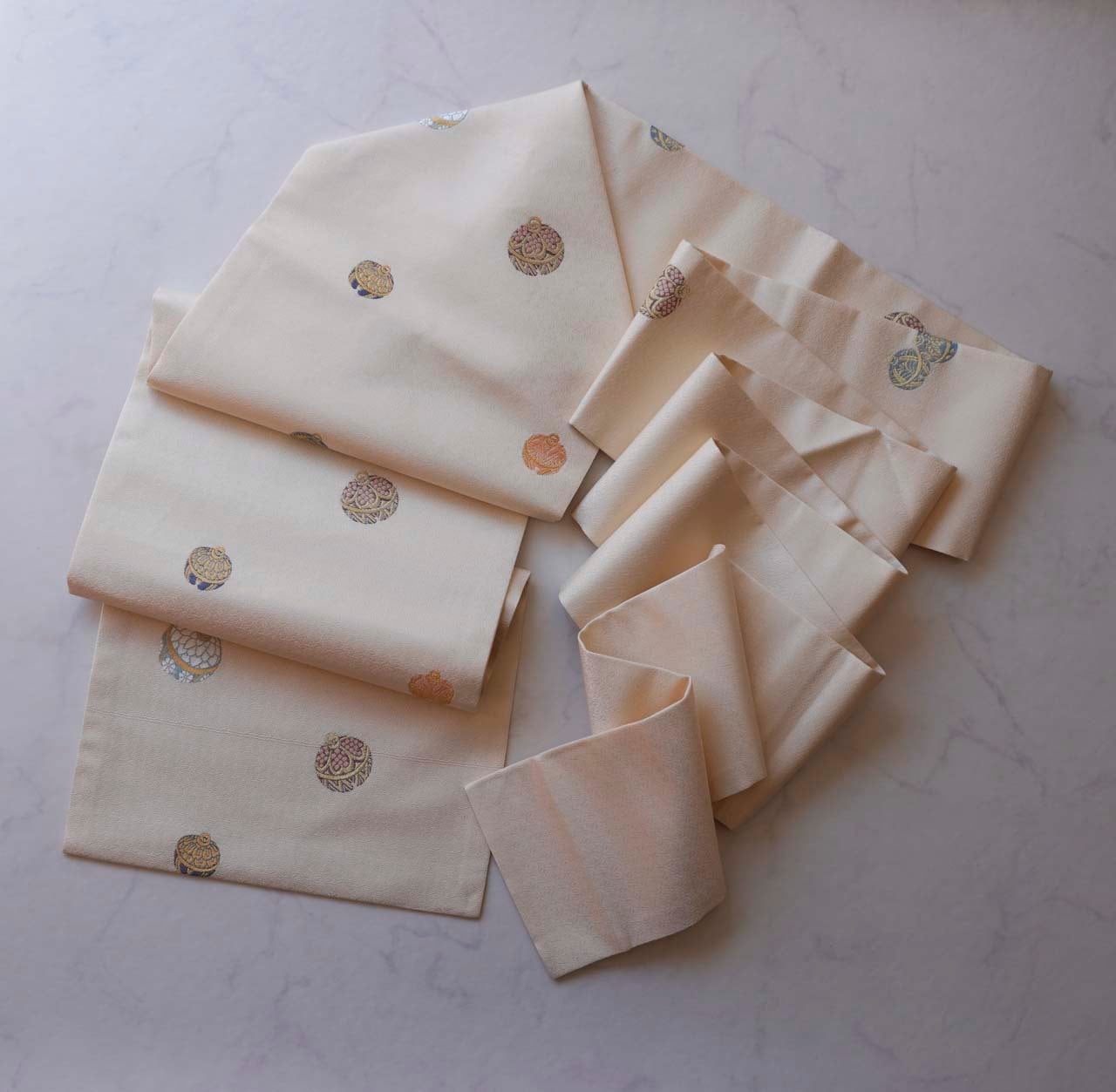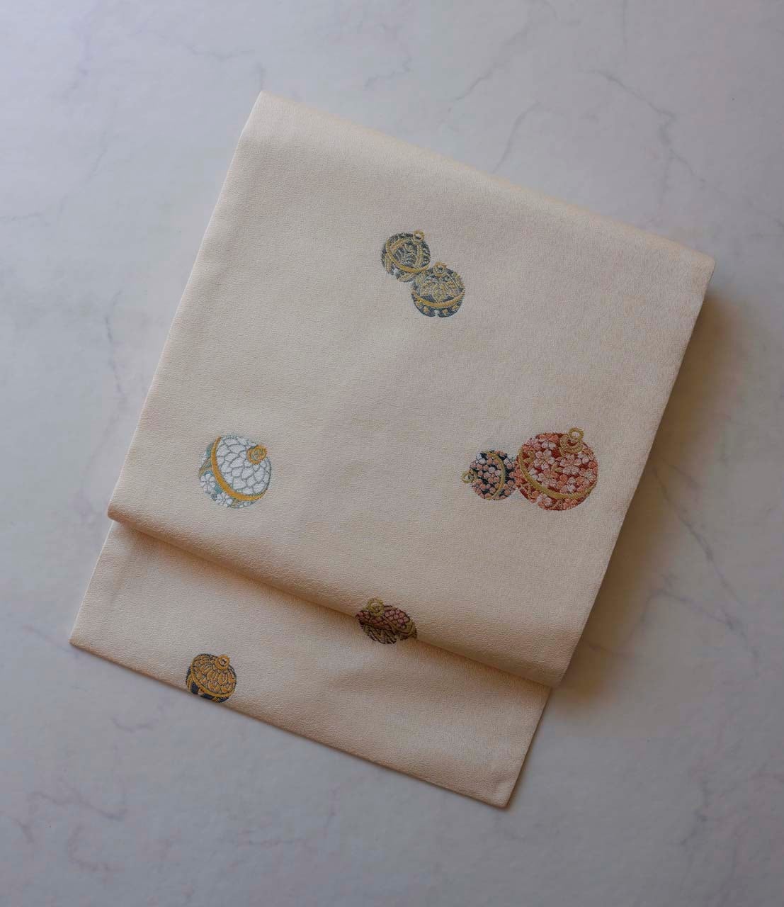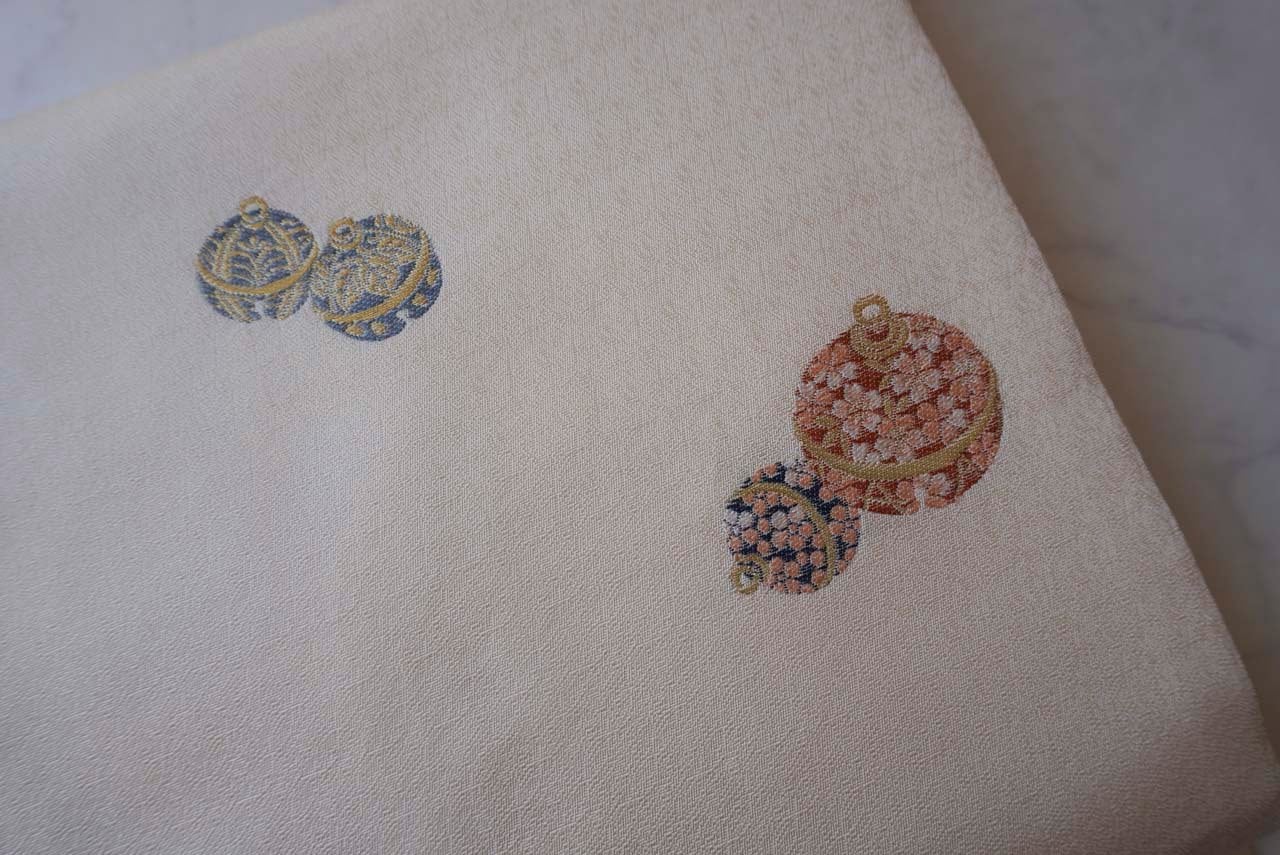優しい地色には繊細な幾何学文様が連続して