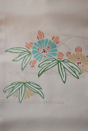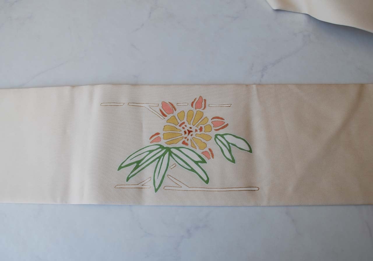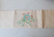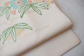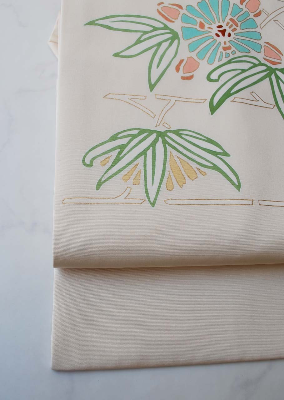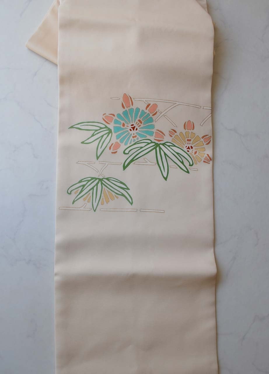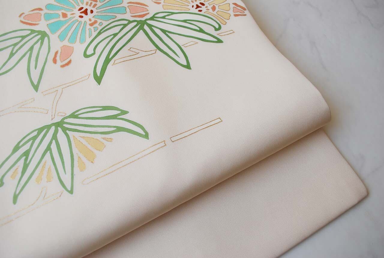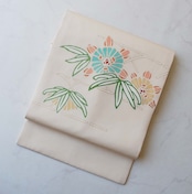 生成り色に抽象花笹文の塩瀬なごや帯です。