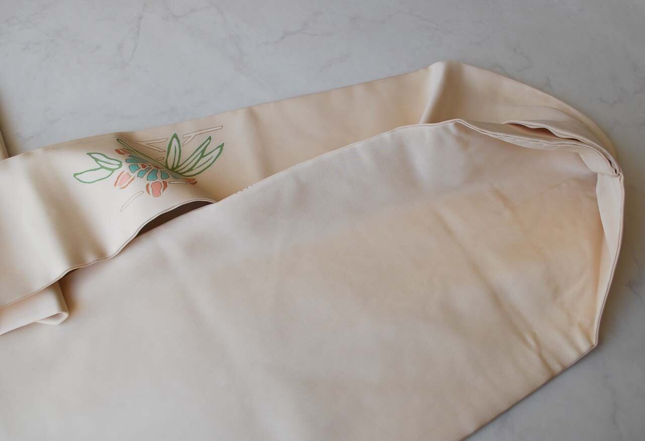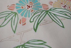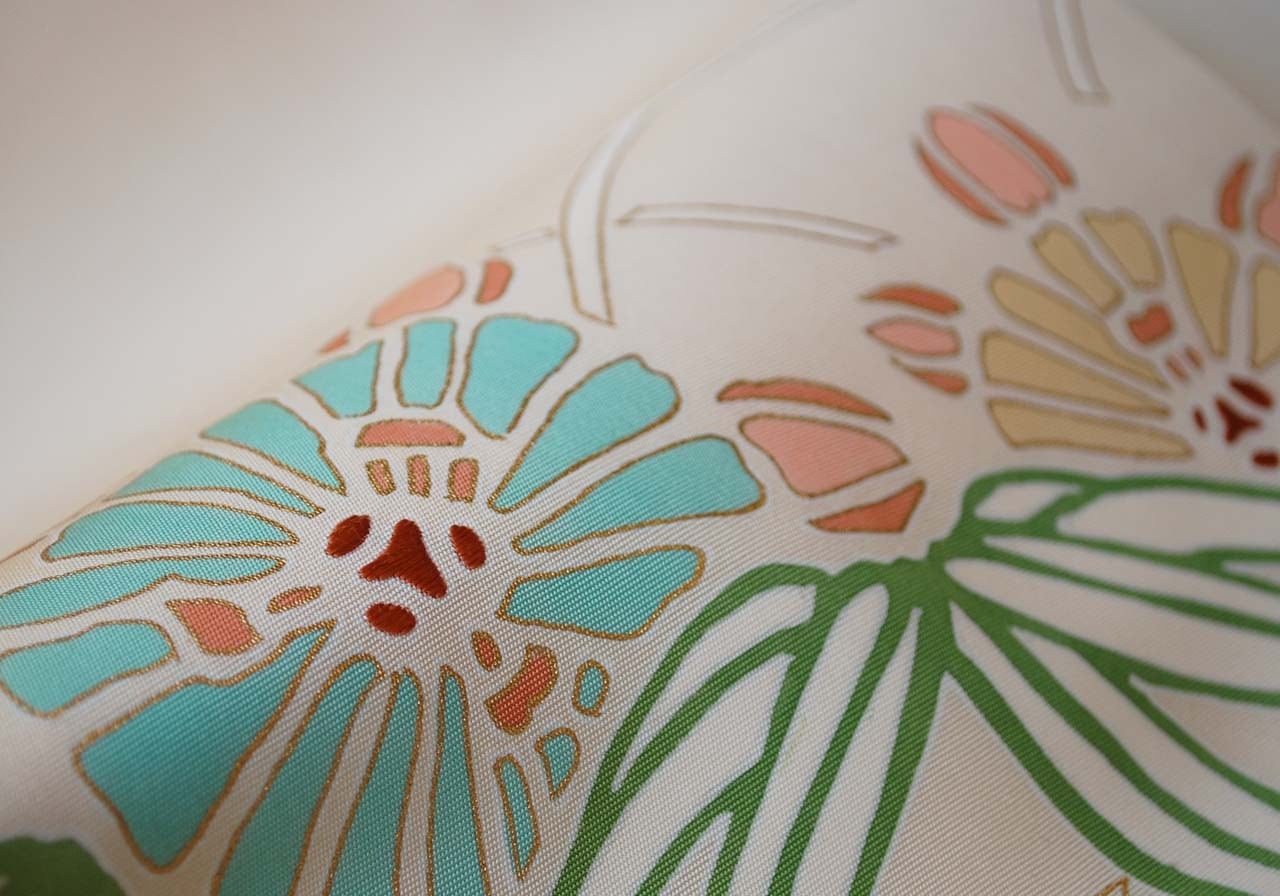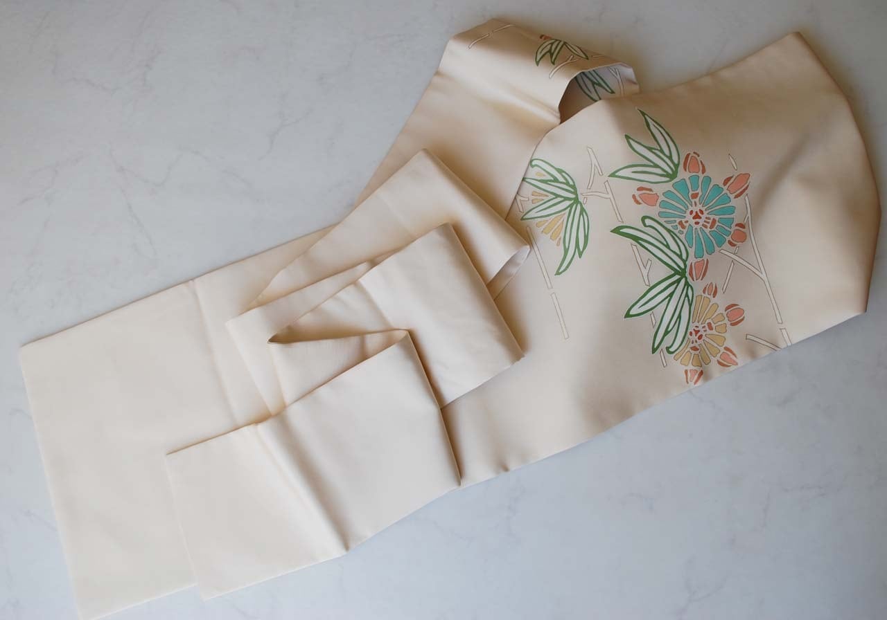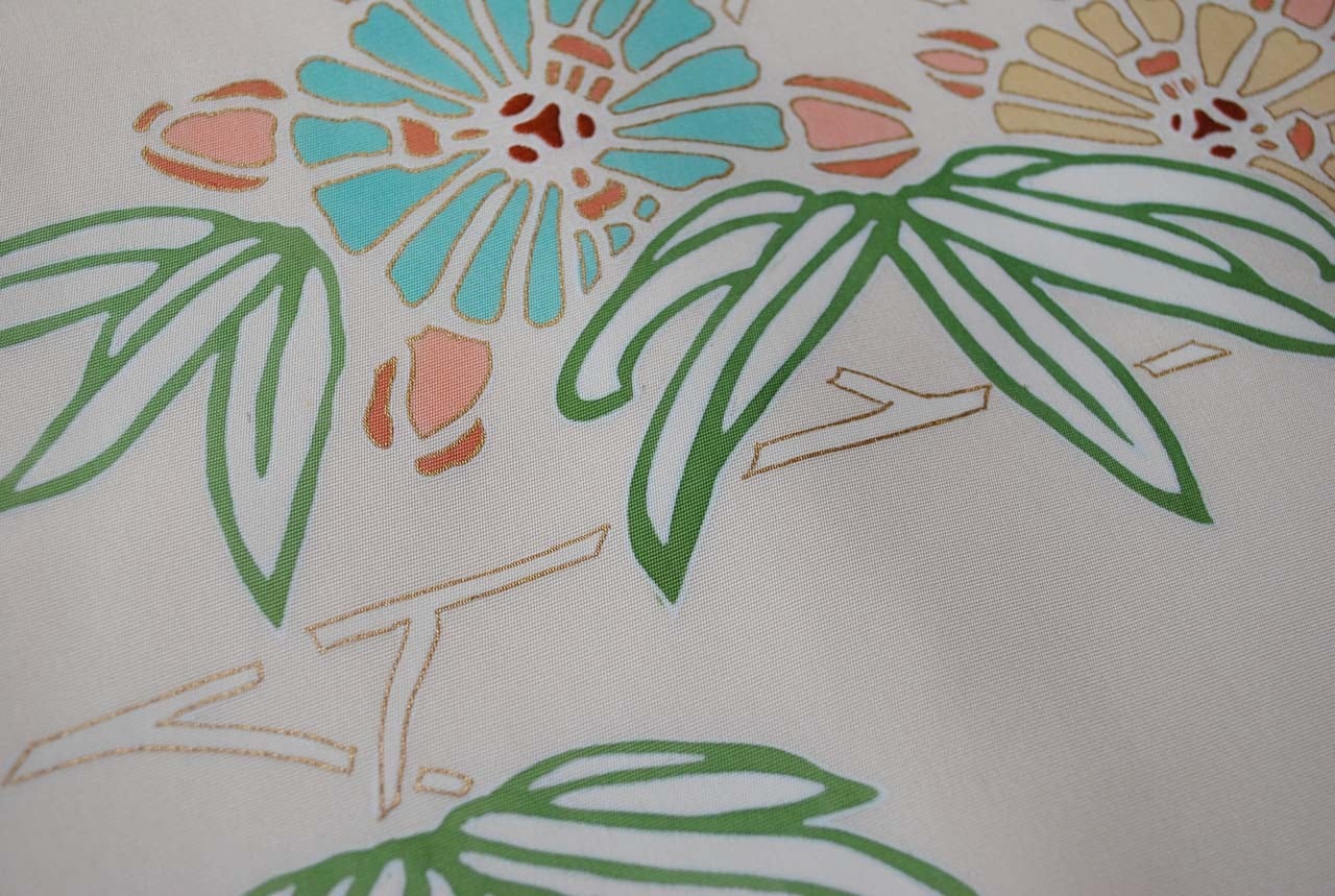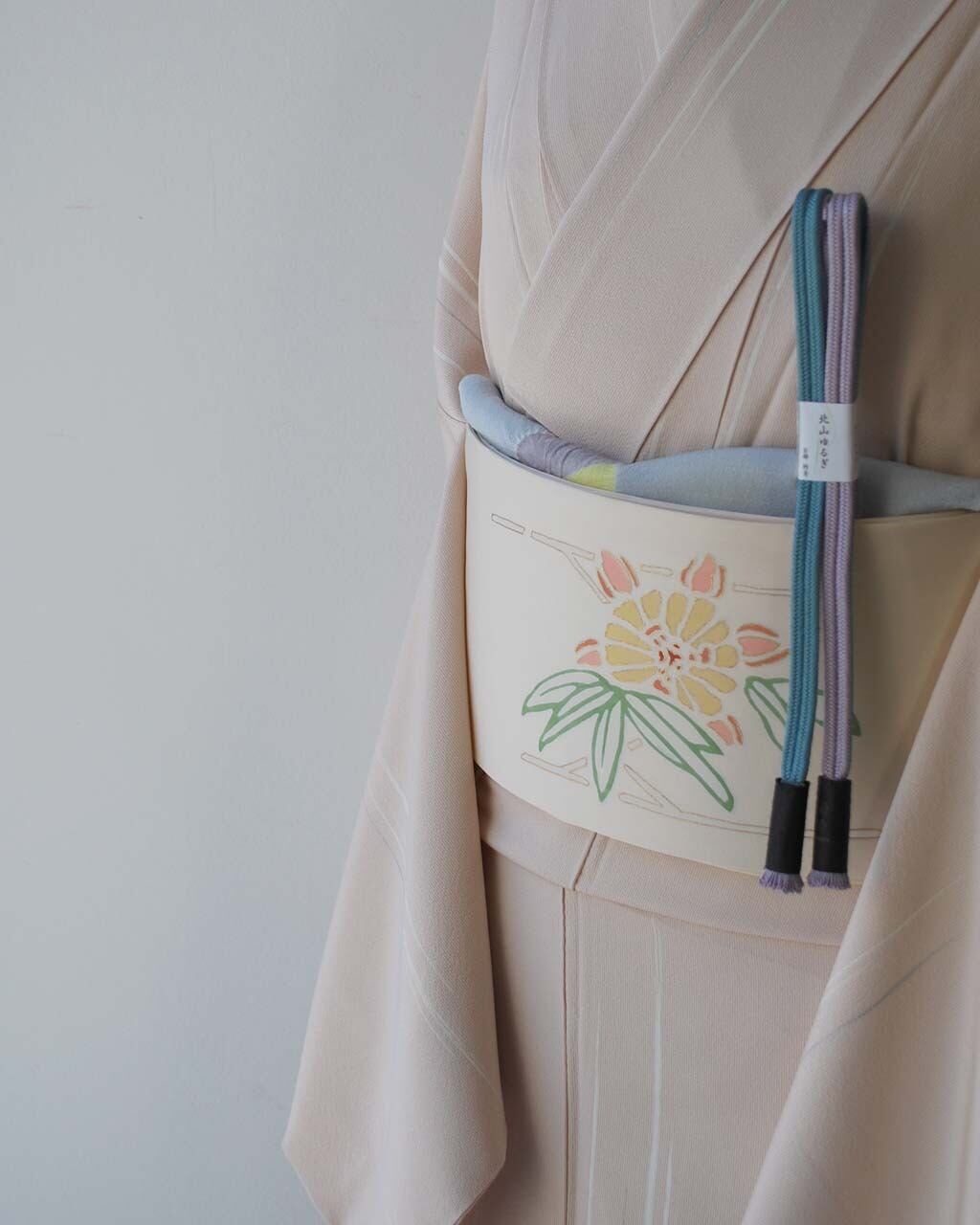 生成り色に抽象花笹文の塩瀬なごや帯です。