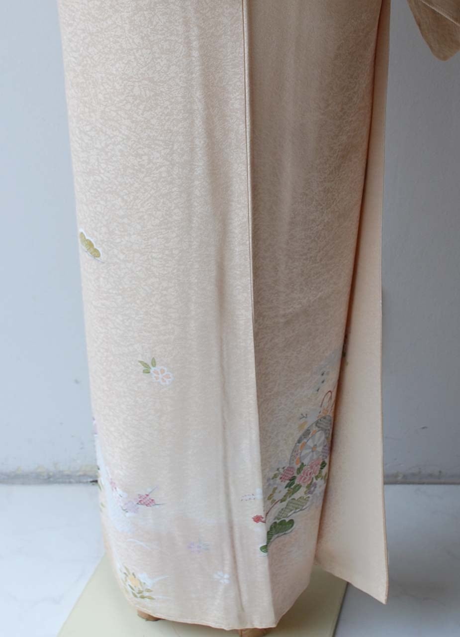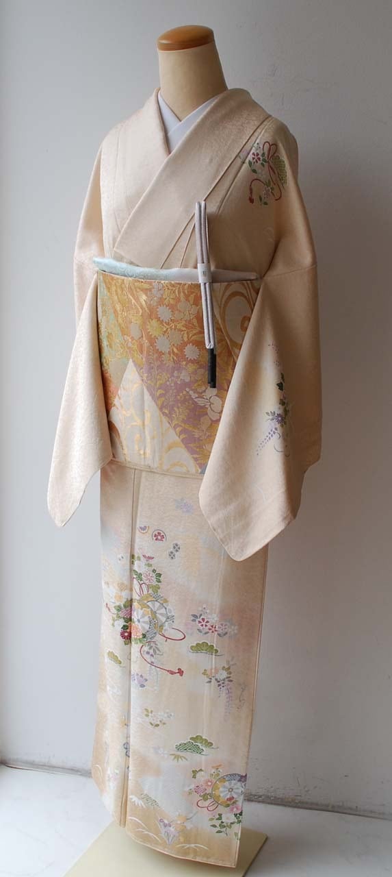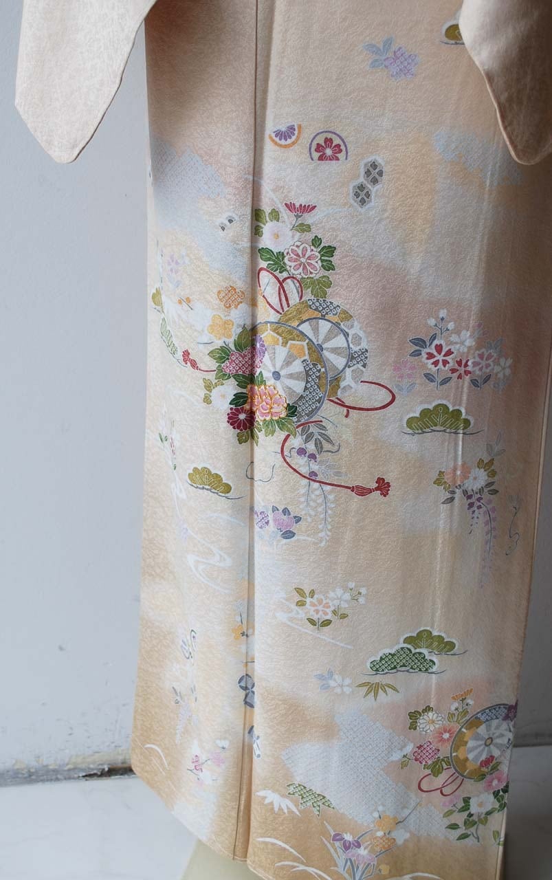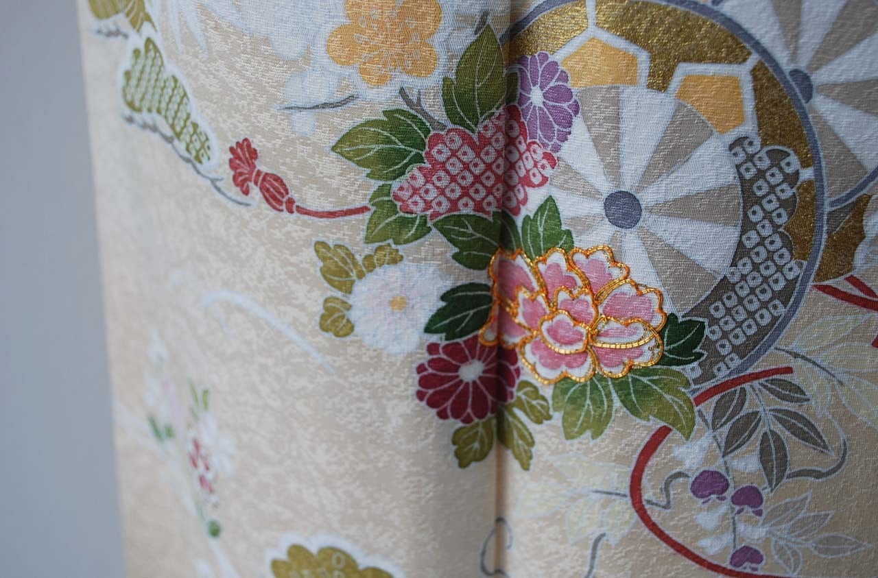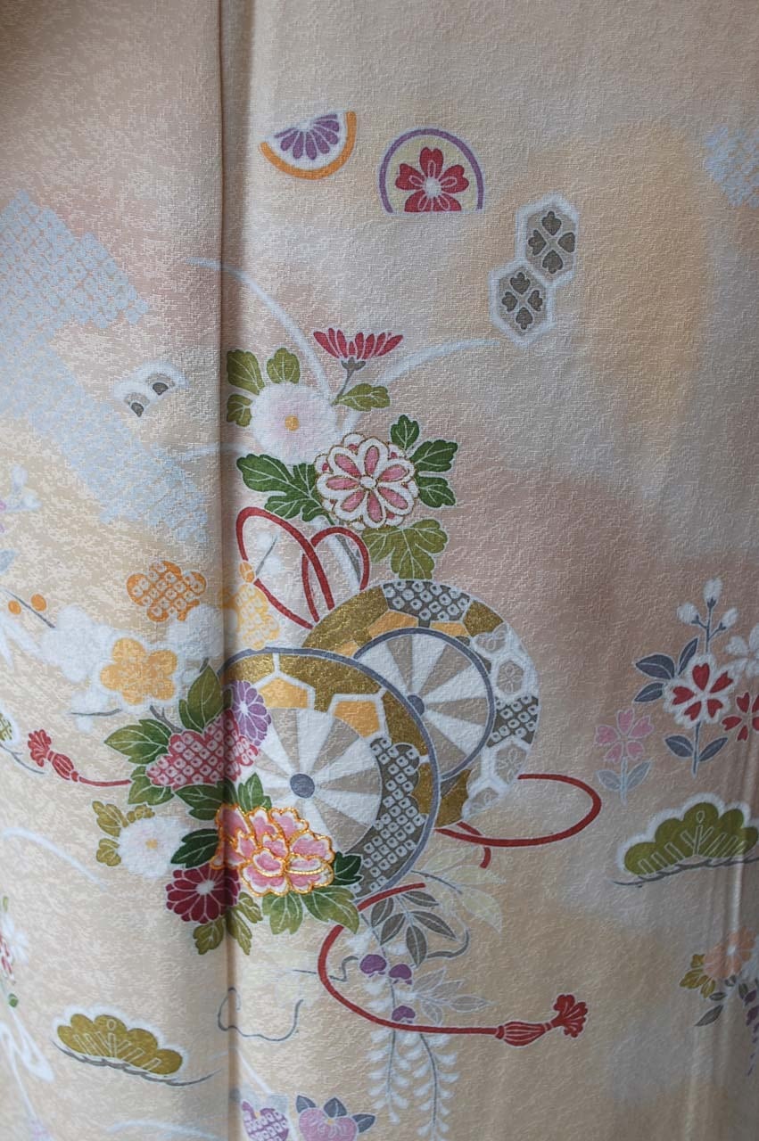 【袷】肌色 源氏車に吉祥四季花文 訪問着
