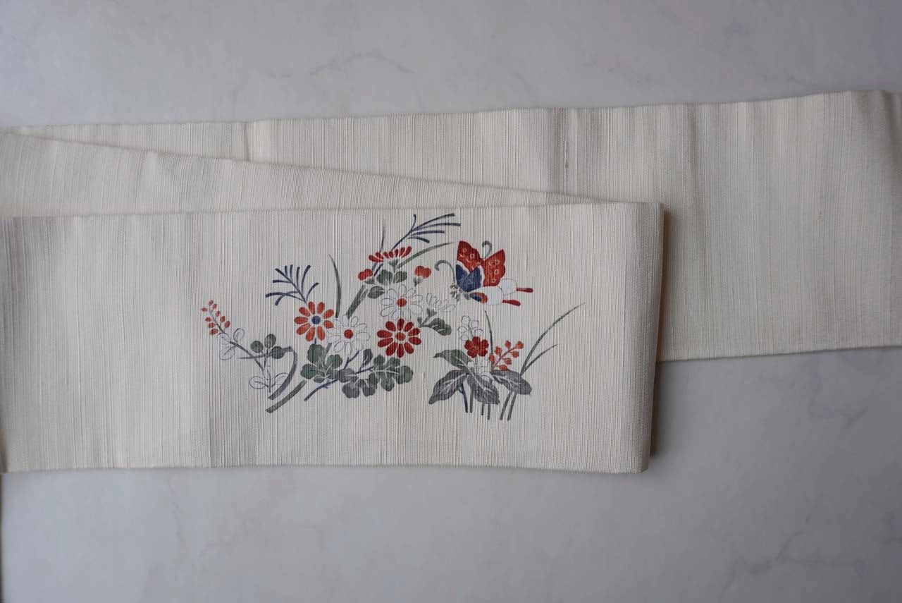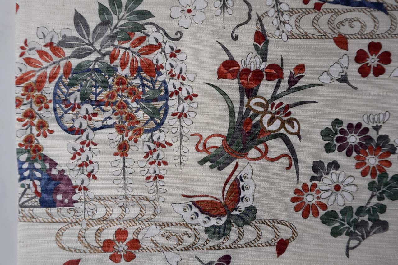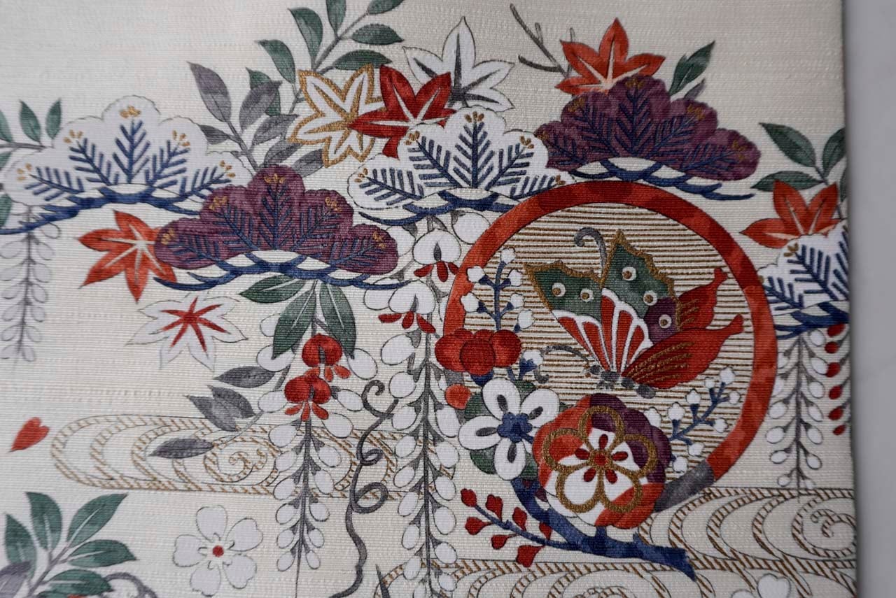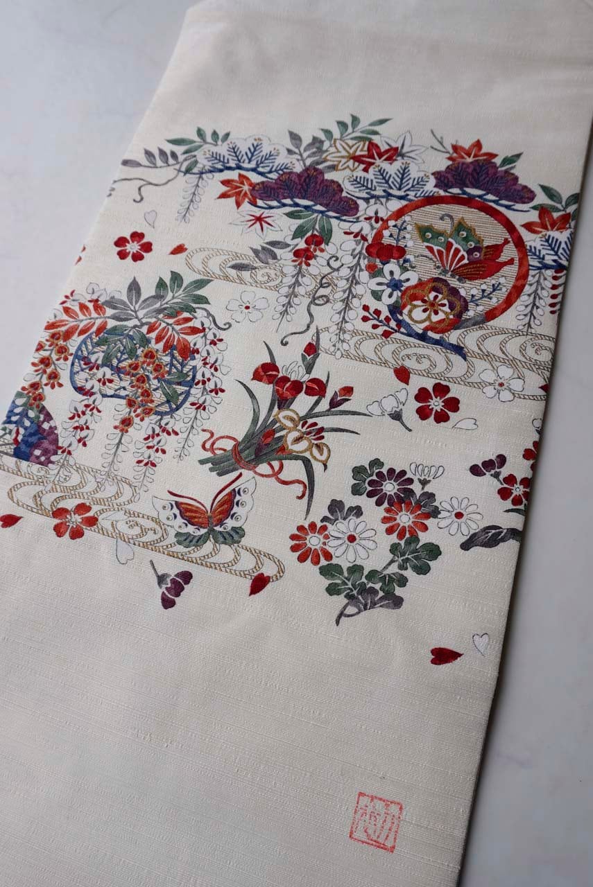 【なごや帯】生成り色地 四季草花文 なごや帯