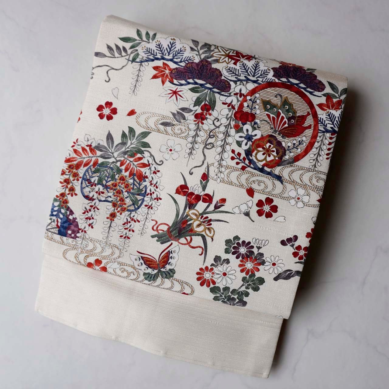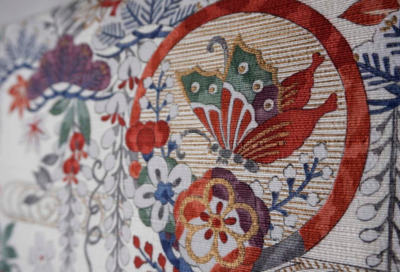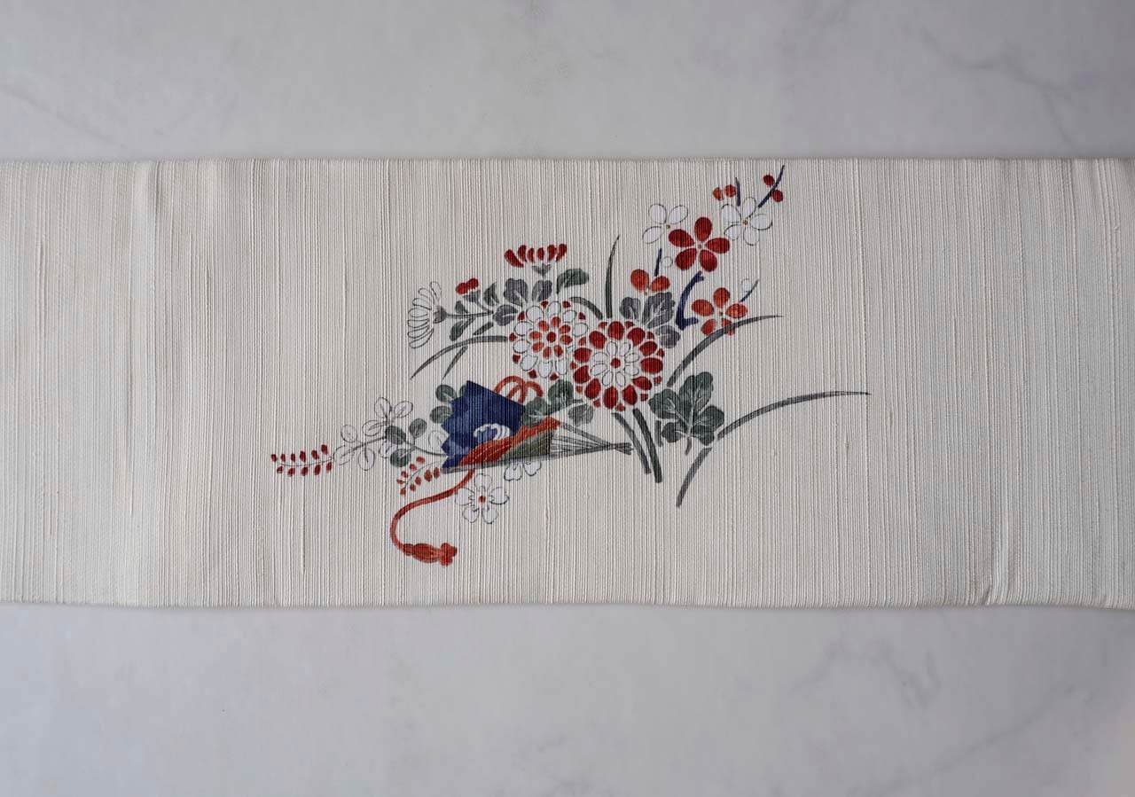 【なごや帯】生成り色地 四季草花文 なごや帯