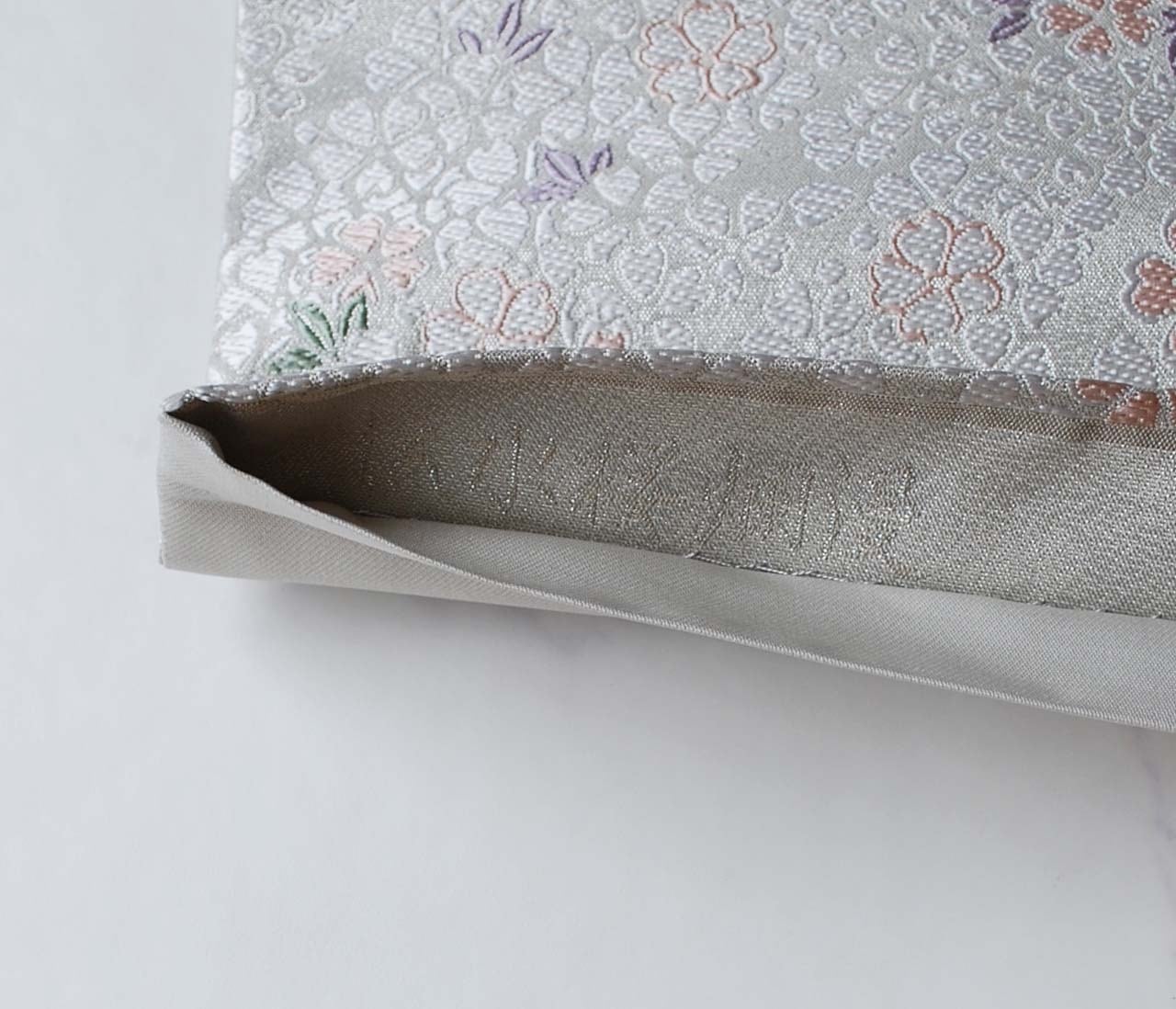 銀糸が織り込まれた淡いグレーの地のふくろ帯です。