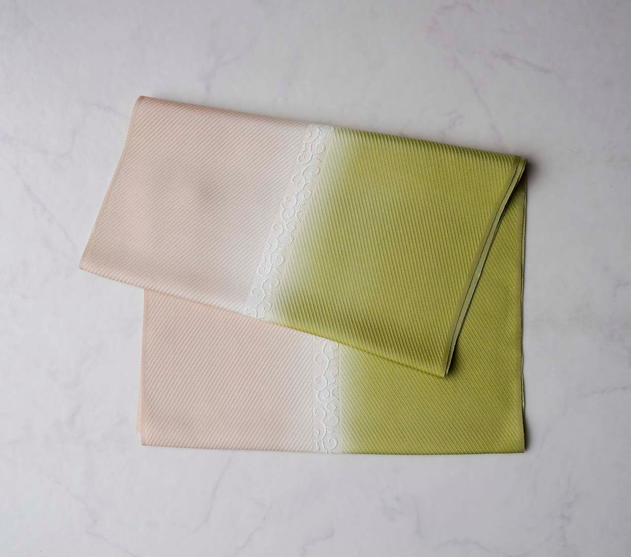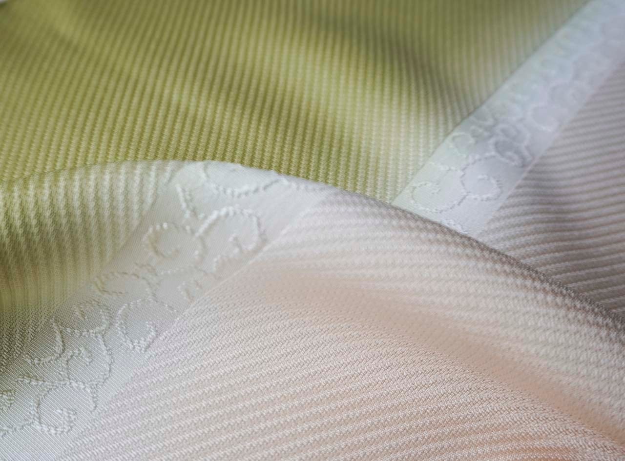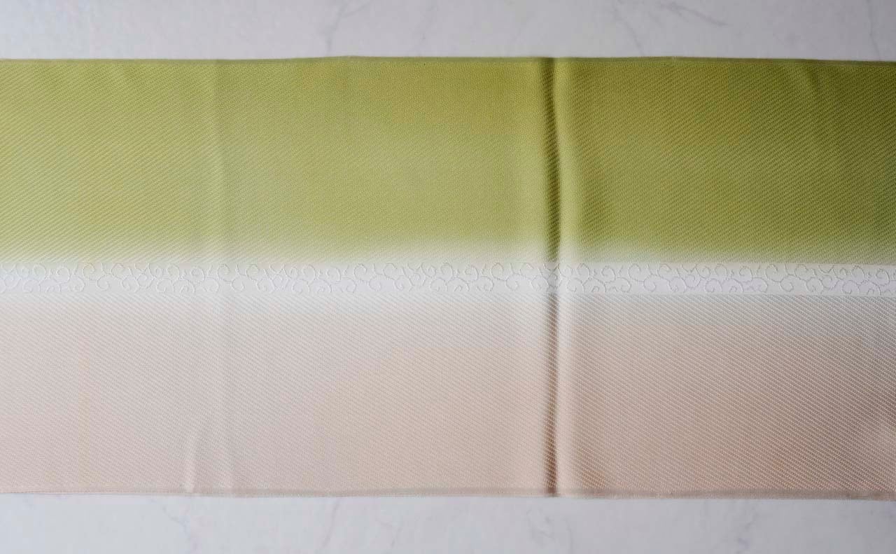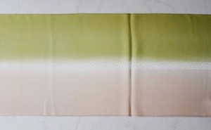 【衿秀・帯揚げ】若苗色 ×肌色 風通染め分け唐草 帯揚げ 260214⑬