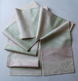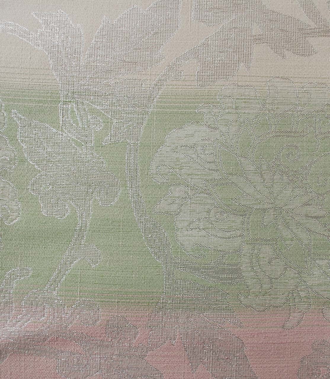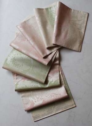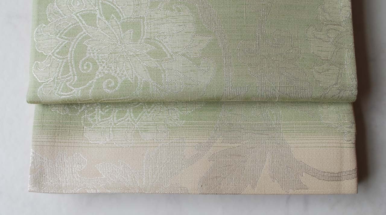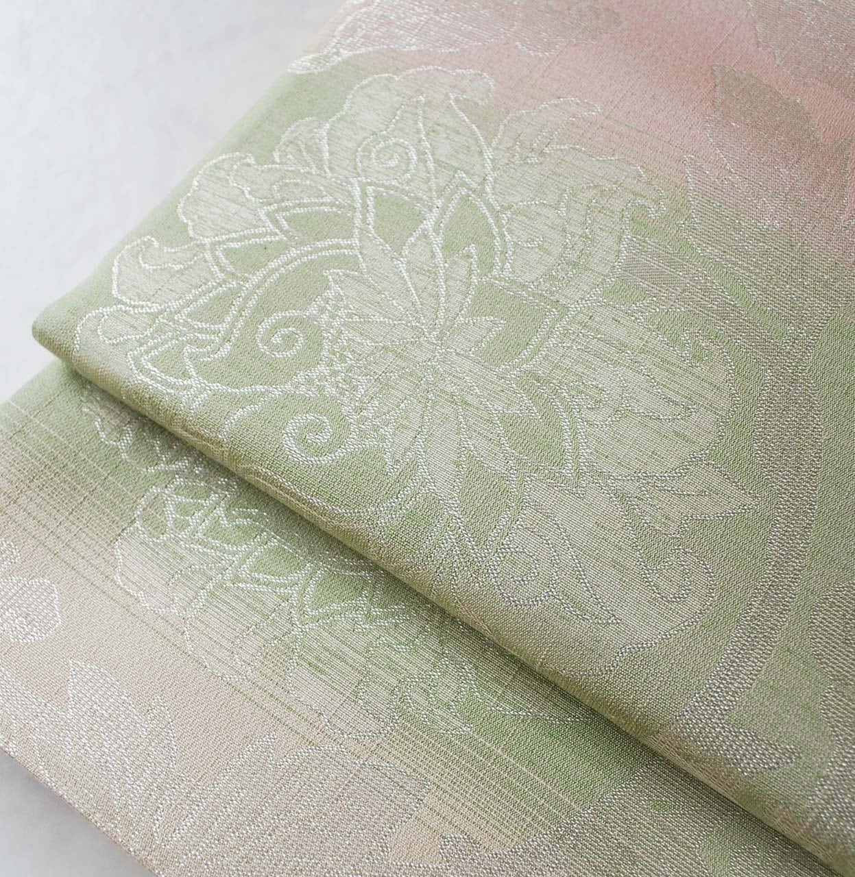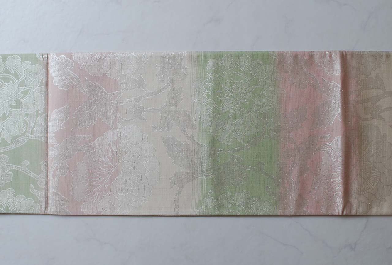 【ふくろ帯】桜色×若菜色 更紗文様 ふくろ帯 全通 長尺