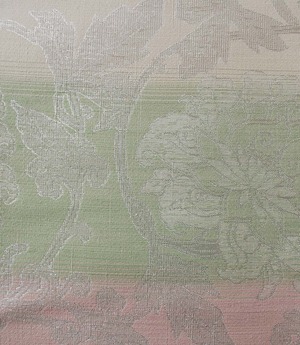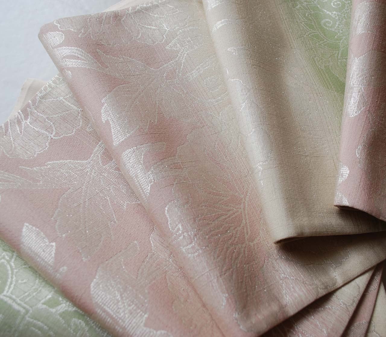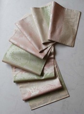 こちらの紬の帯地に桜色、虹色、若菜色の糸が
