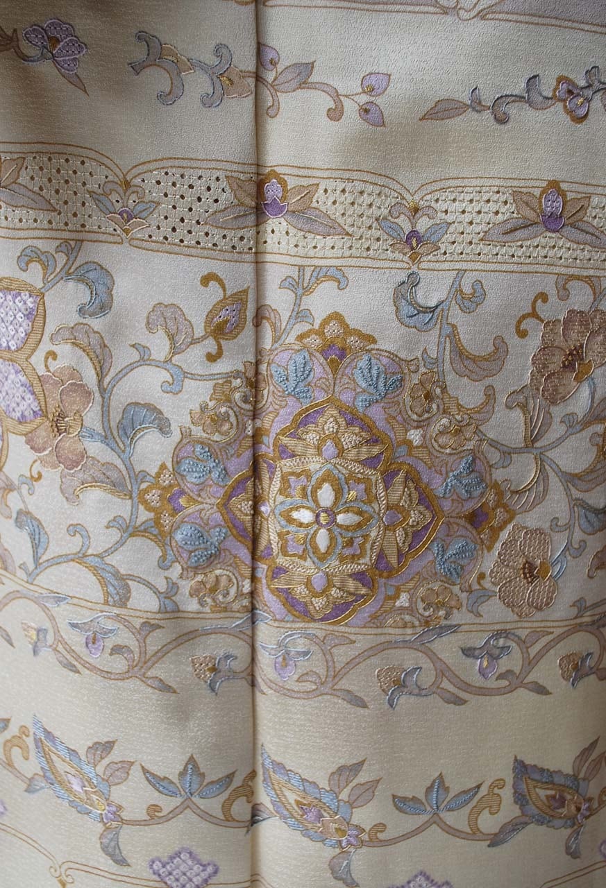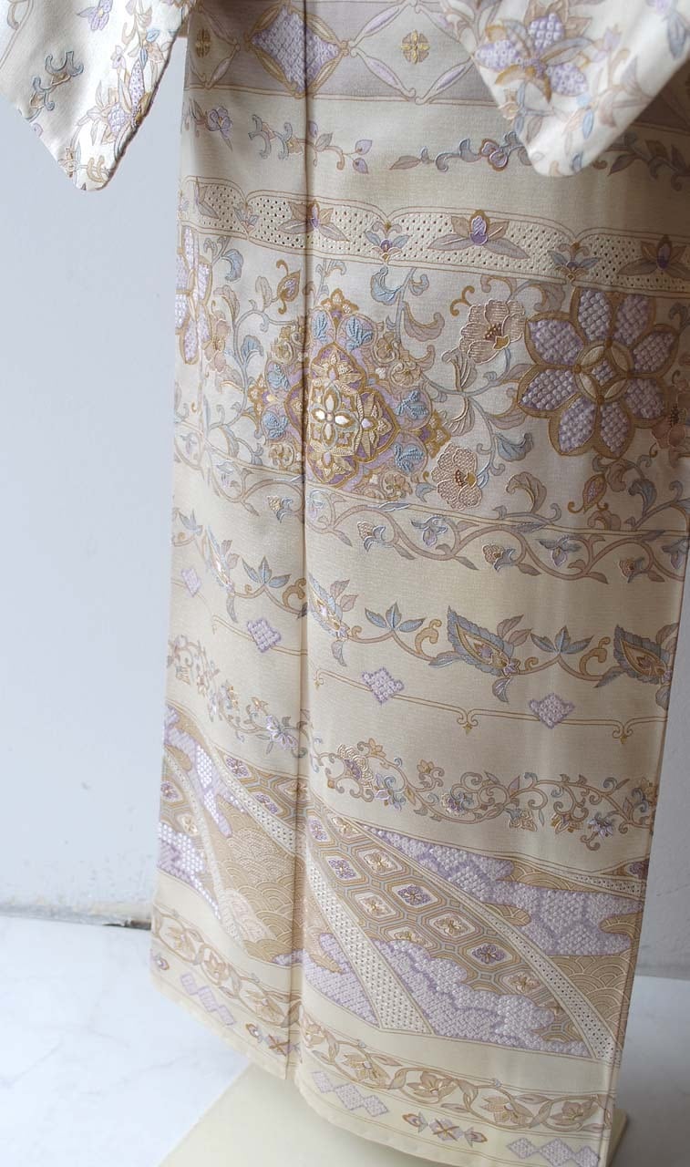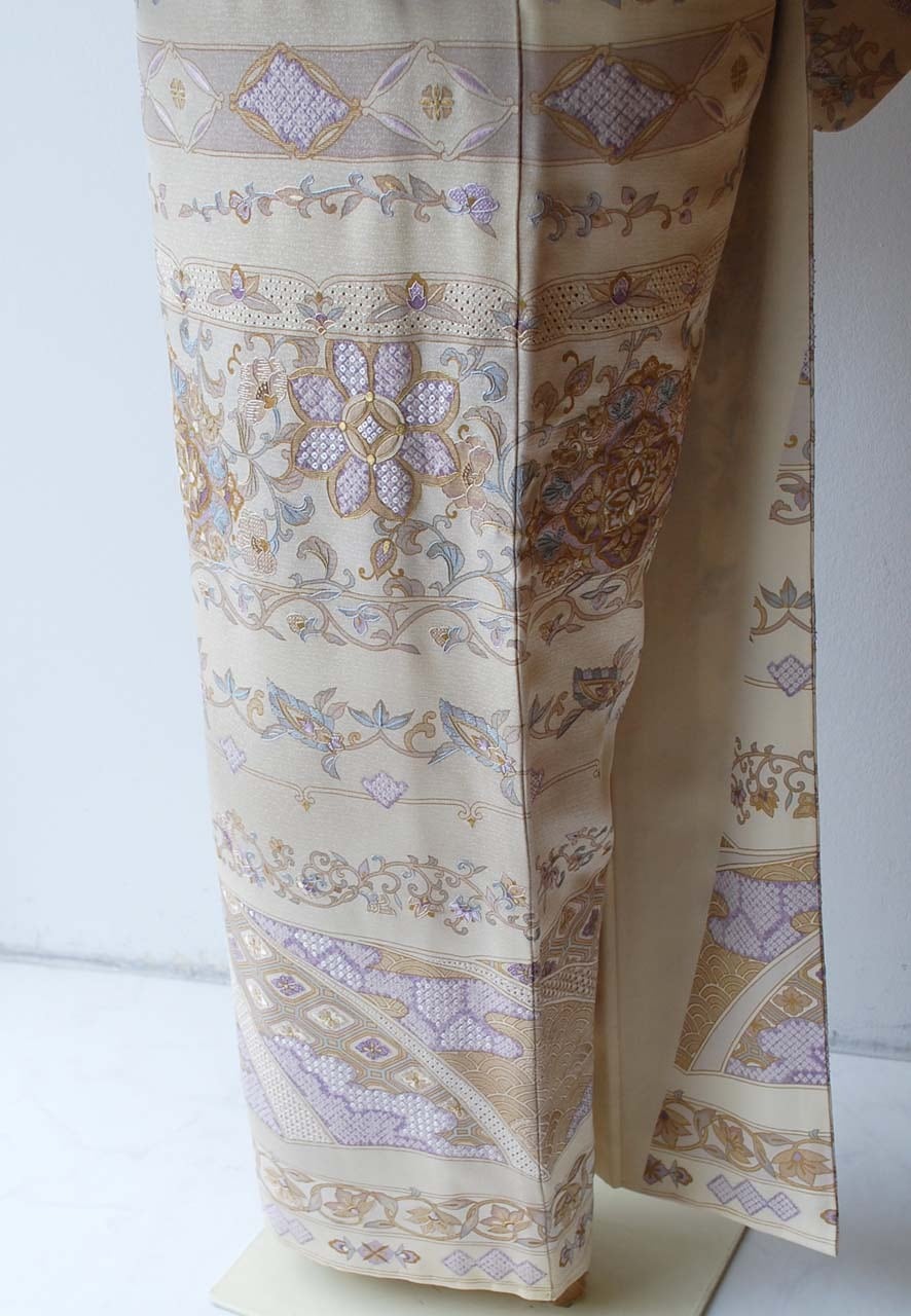 【袷】練色 段更紗刺繍文 訪問着
