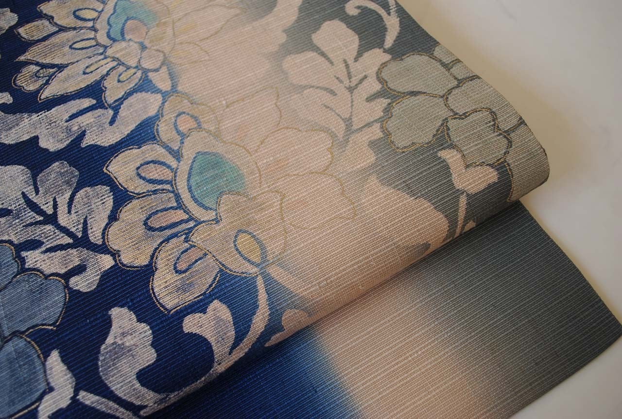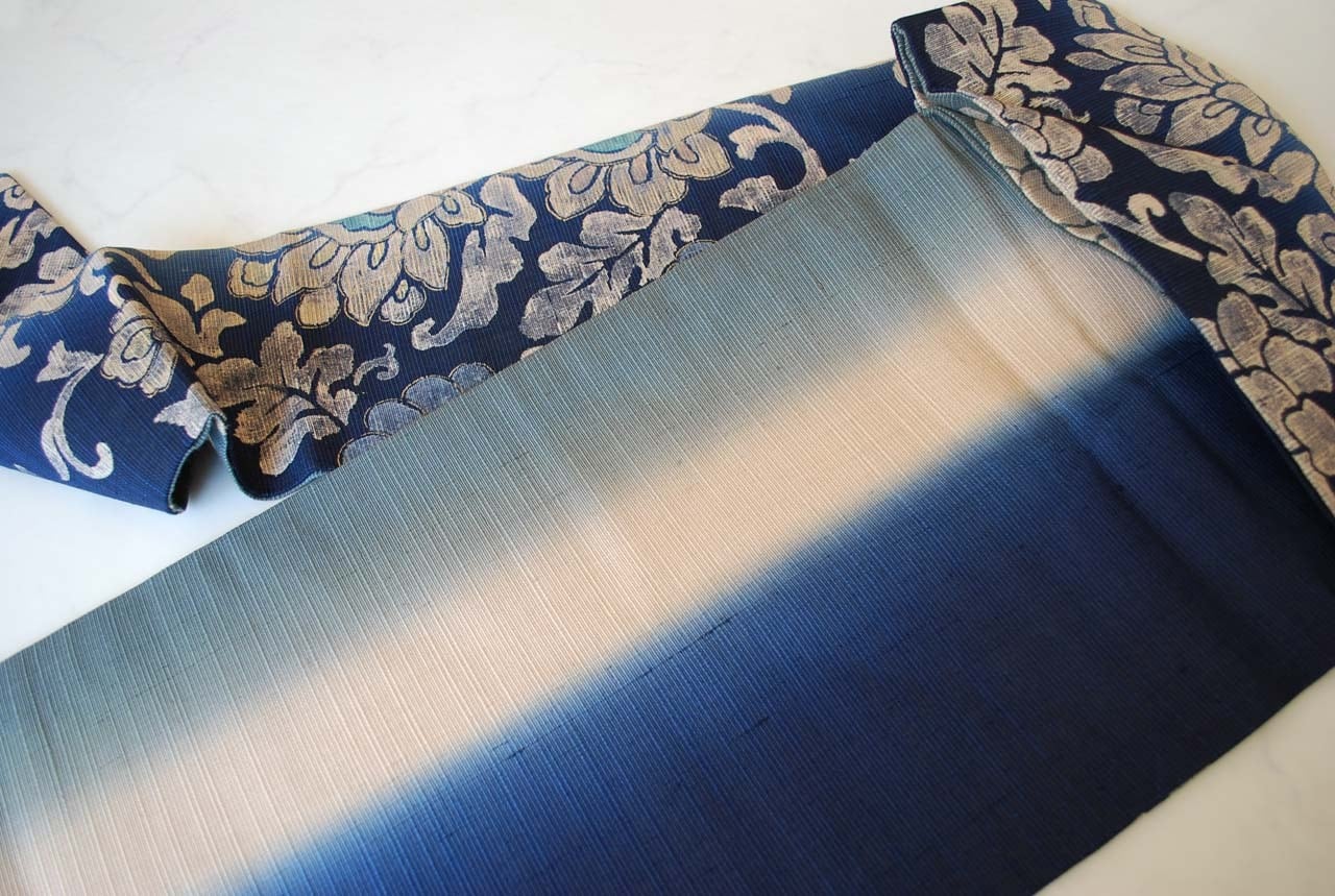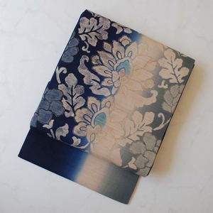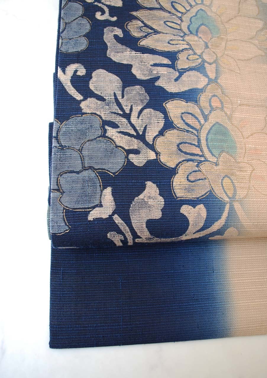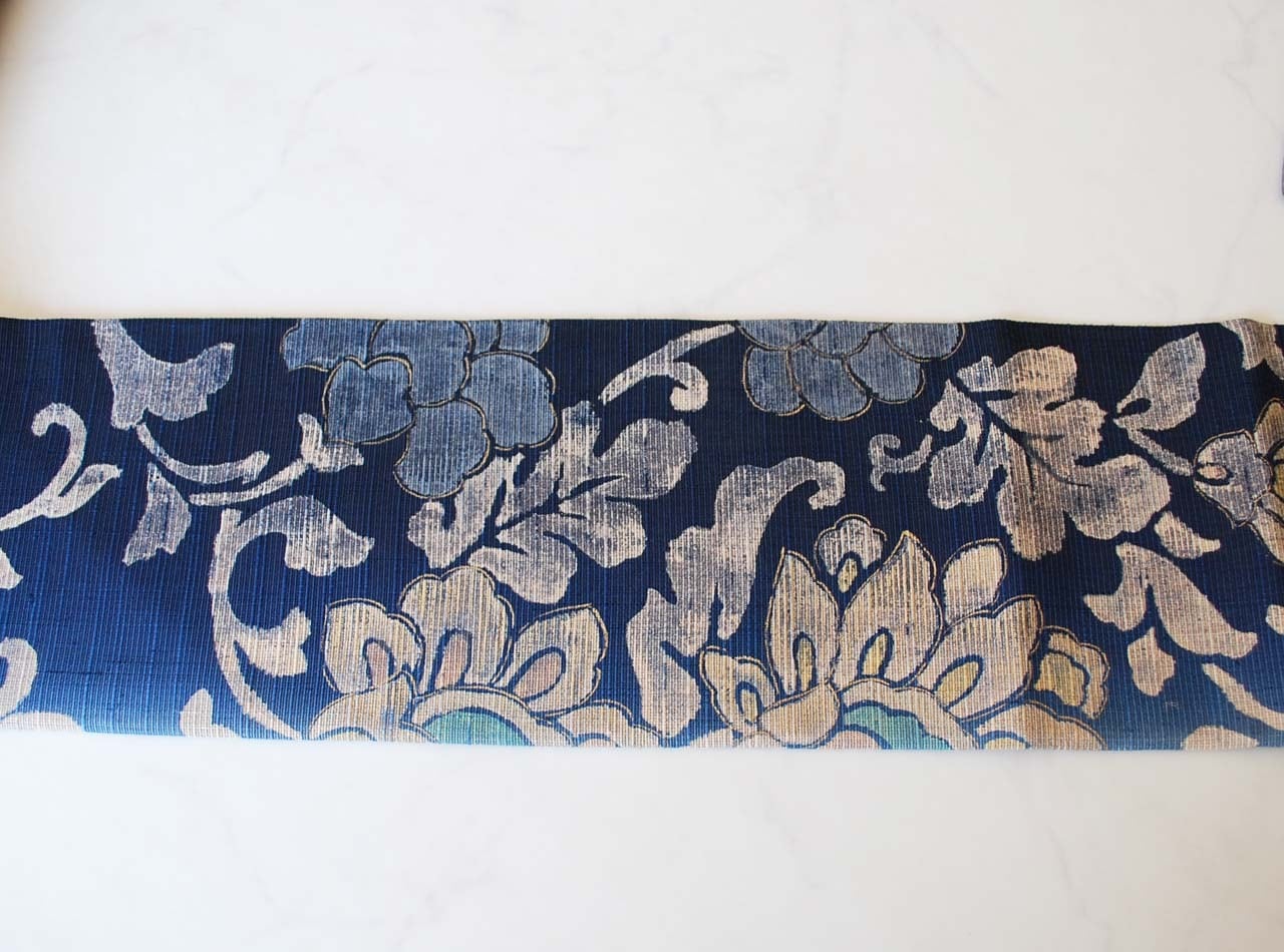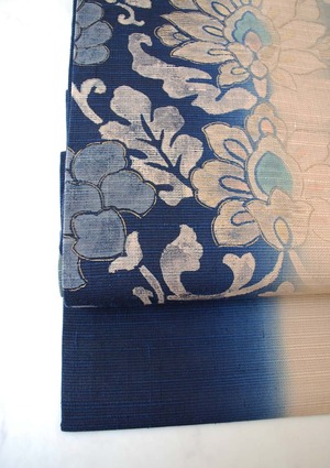 【なごや帯】濃藍色暈かし 更紗文 紬地なごや帯