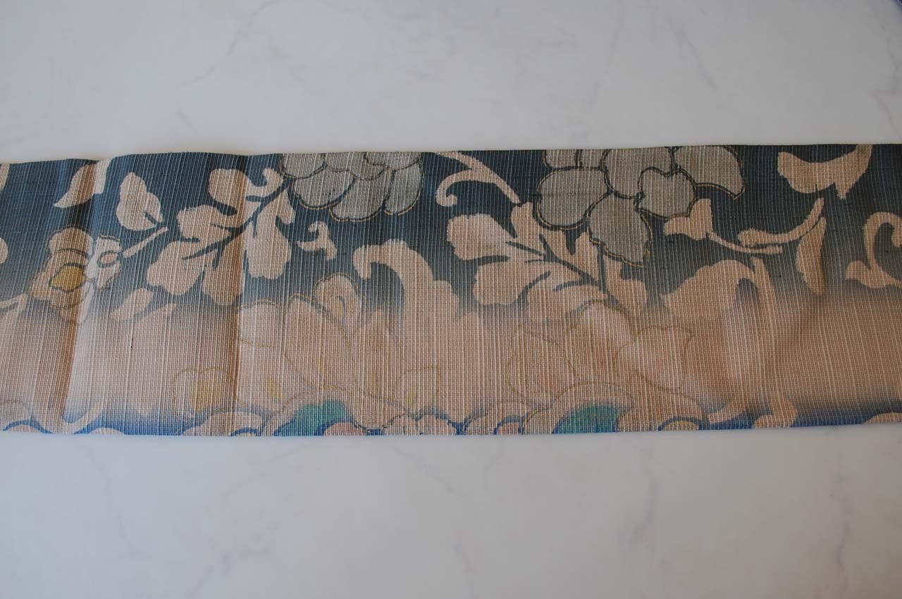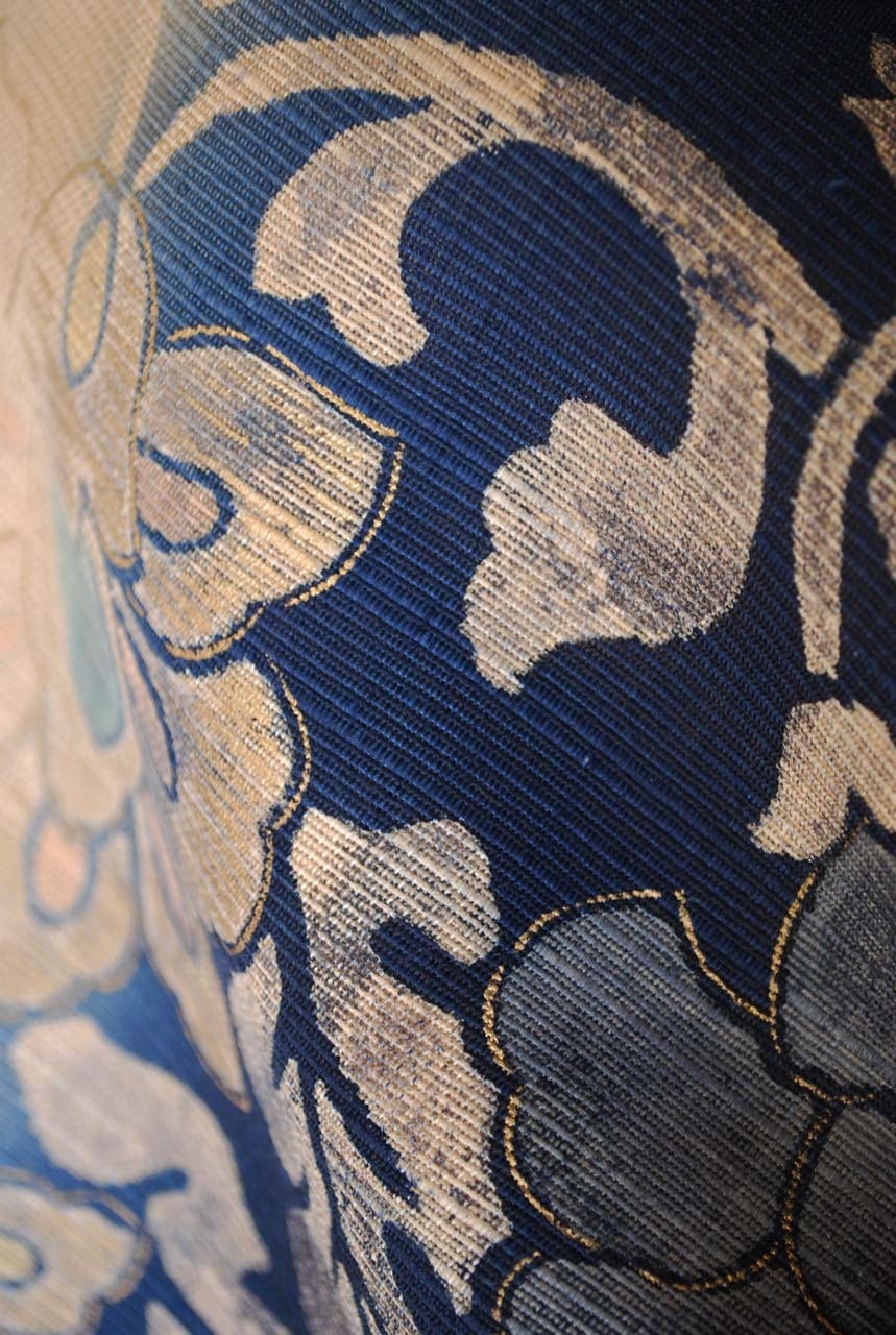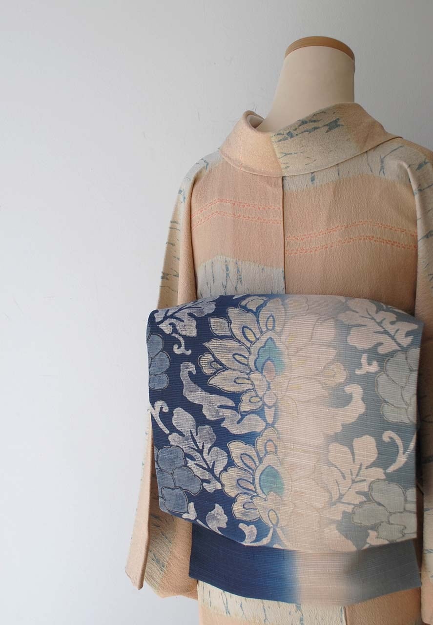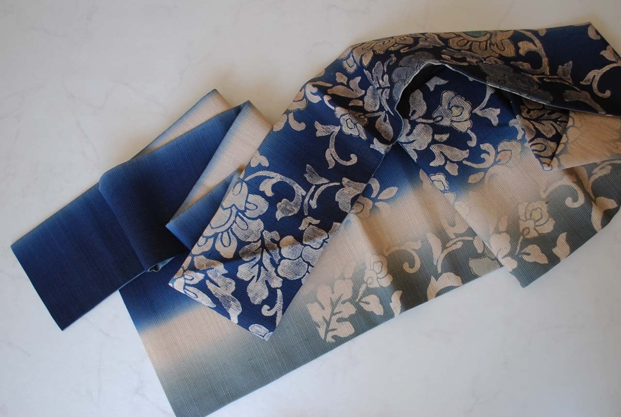 【なごや帯】濃藍色暈かし 更紗文 紬地なごや帯