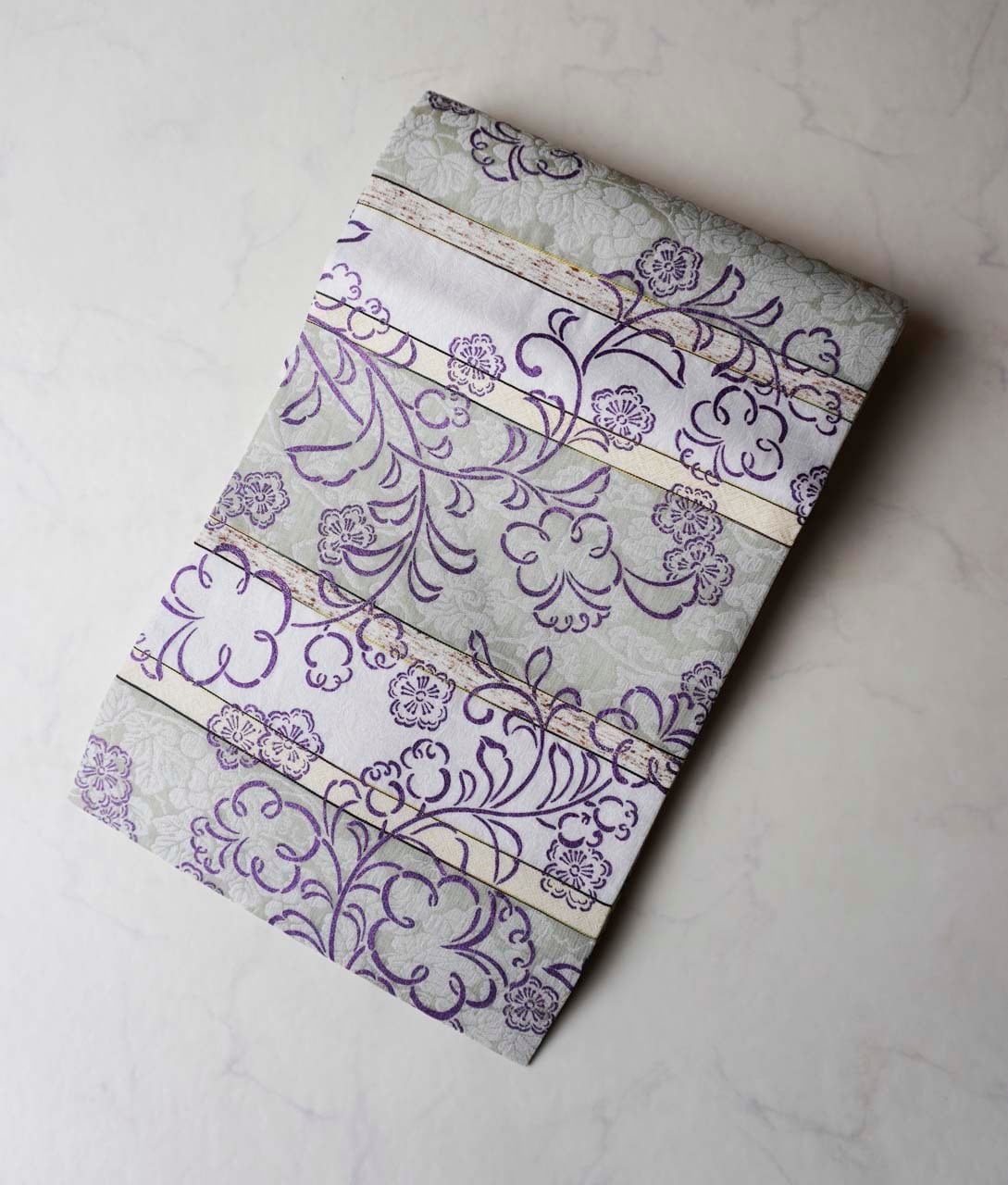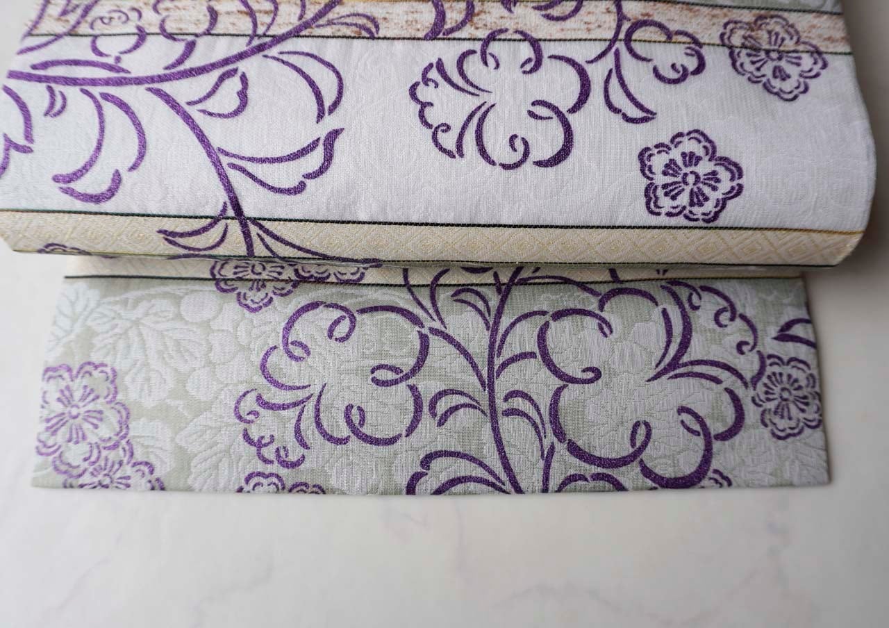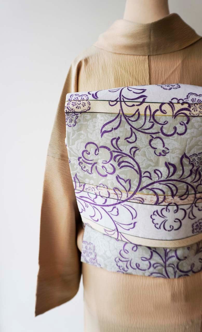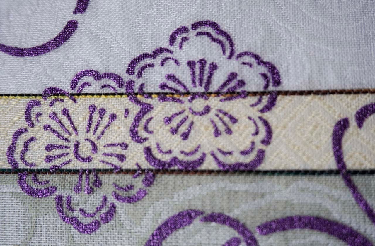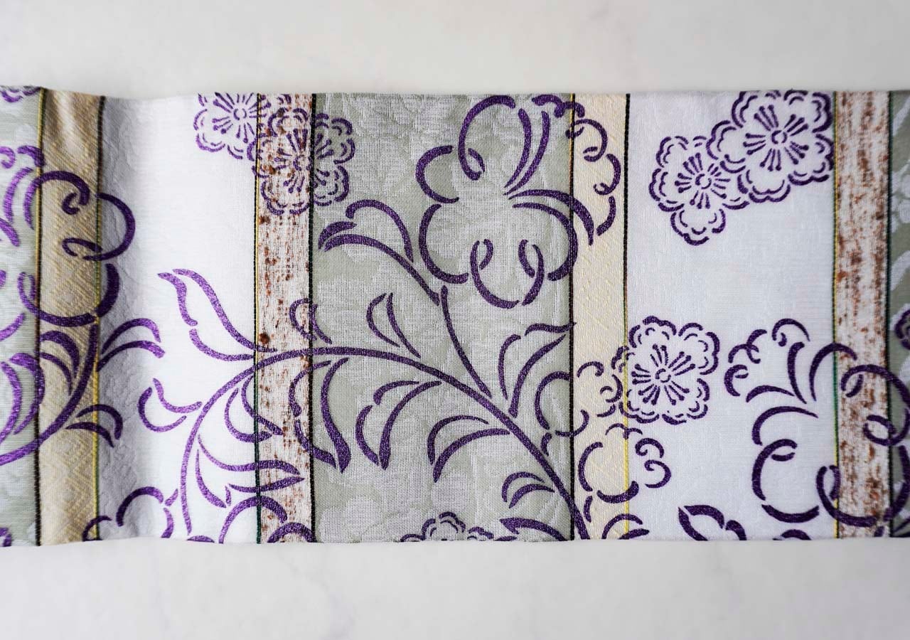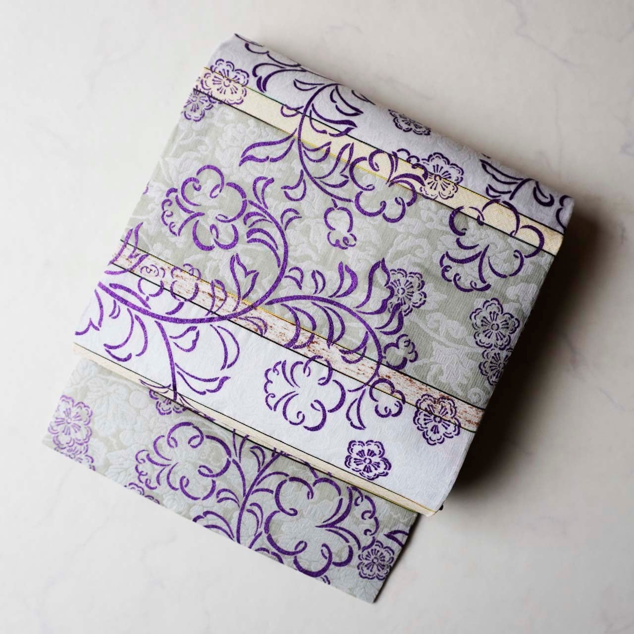 【なごや帯】柳茶色×白色 横段に花唐草文 なごや帯