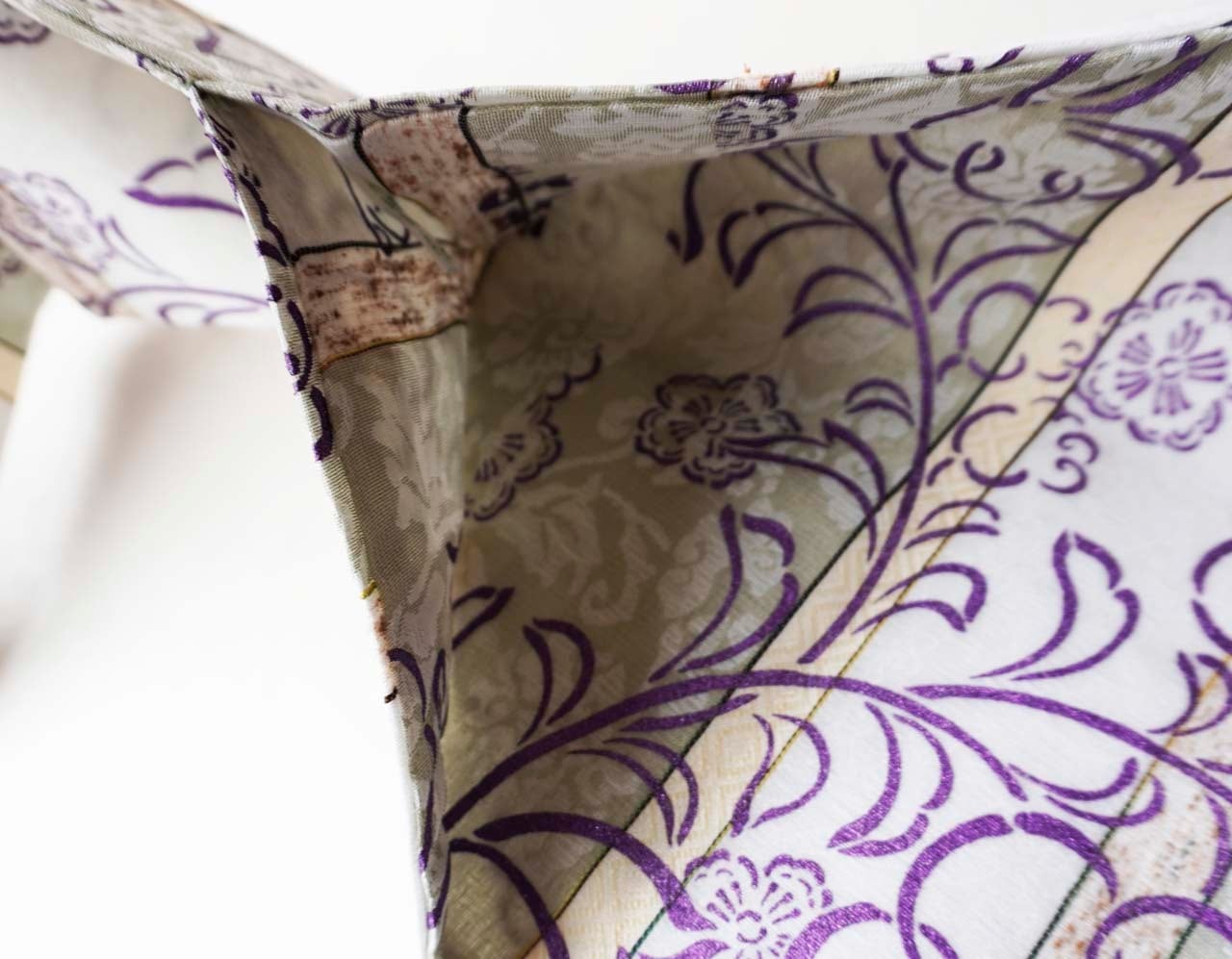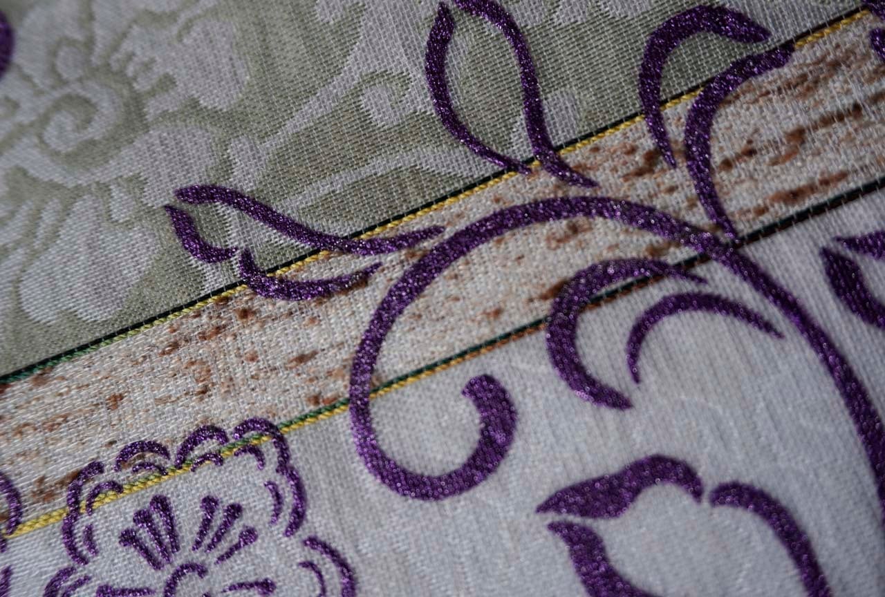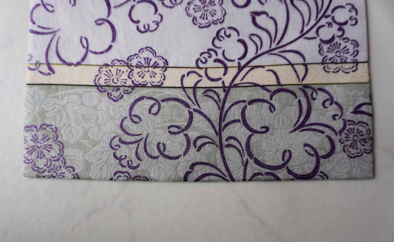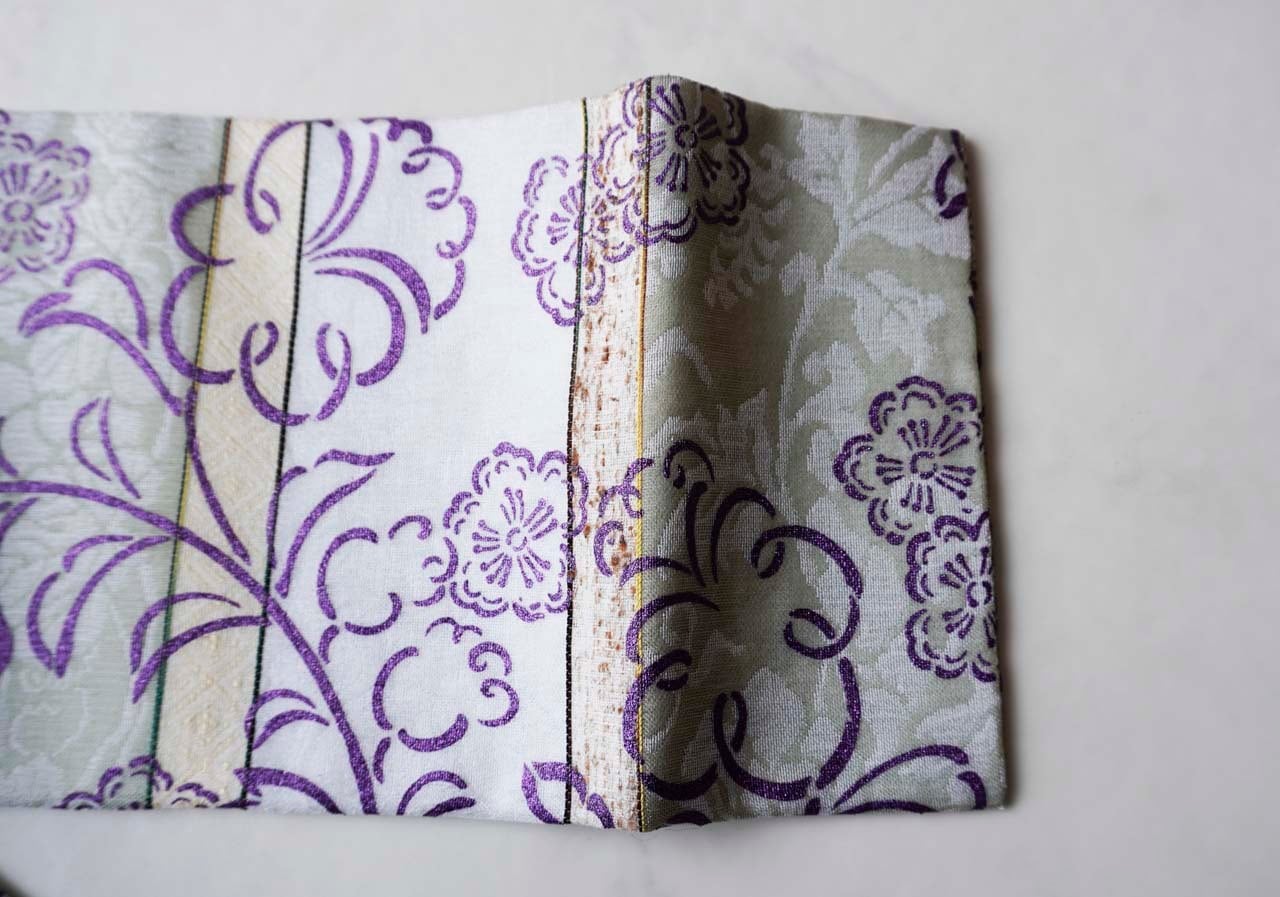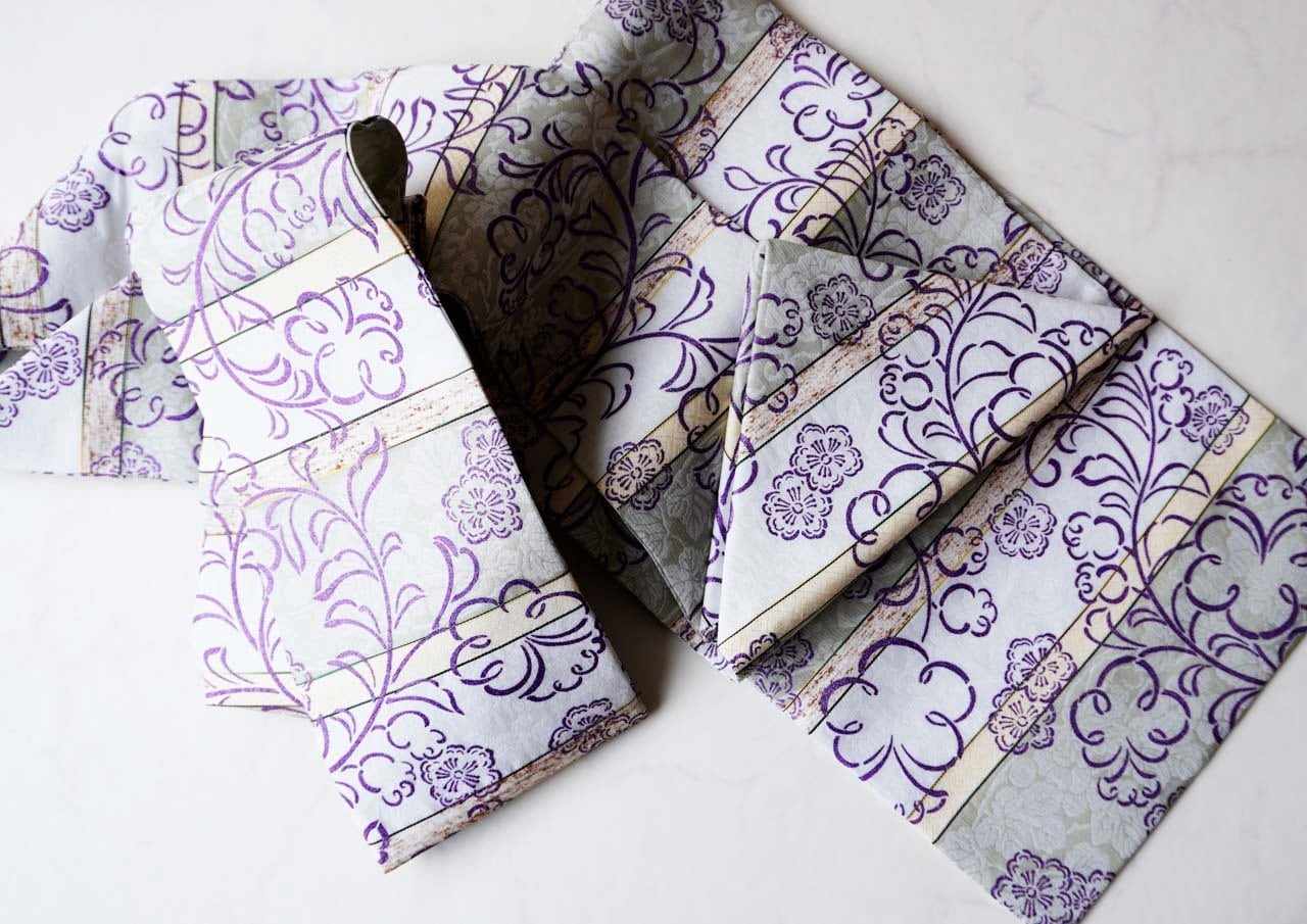 【なごや帯】柳茶色×白色 横段に花唐草文 なごや帯