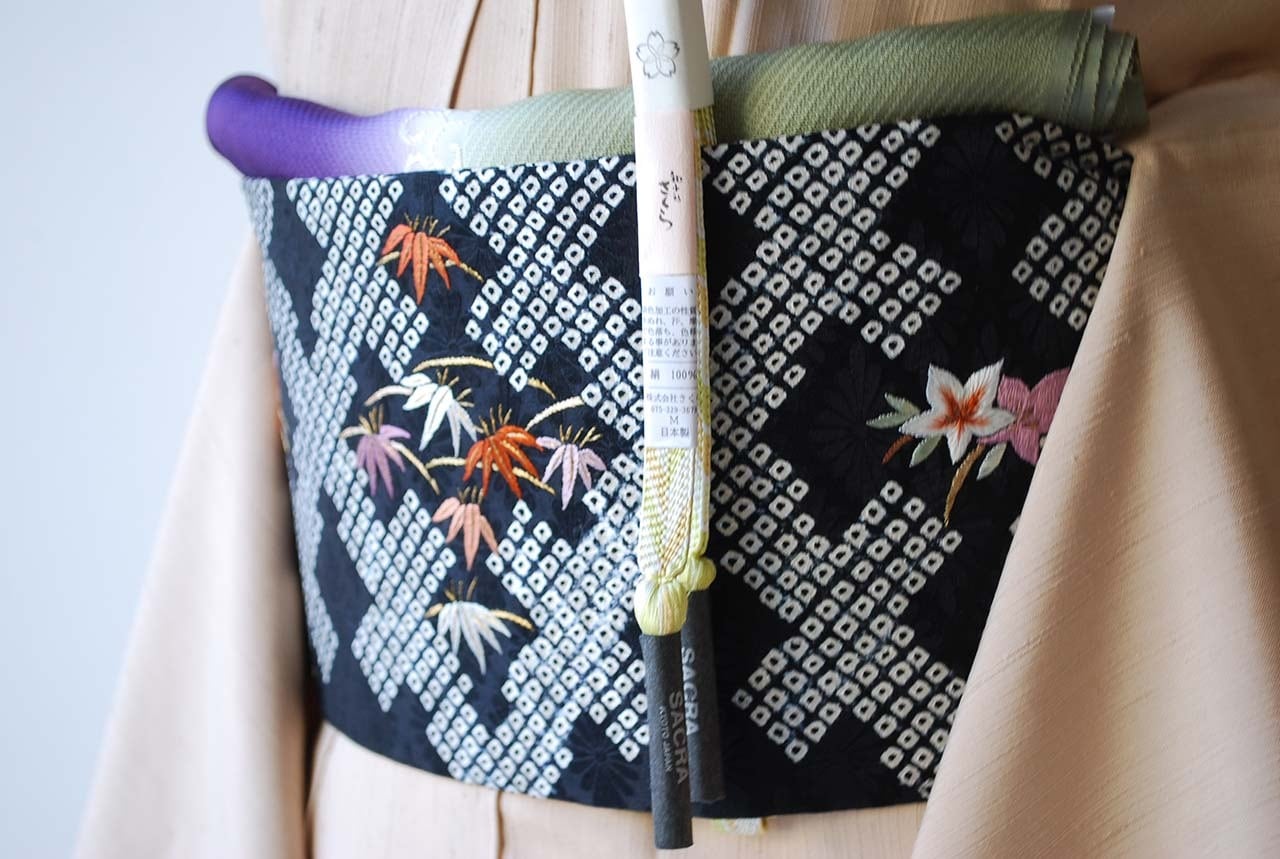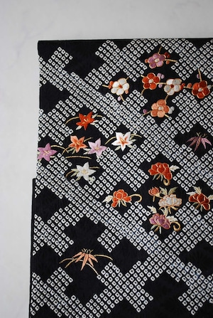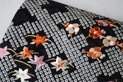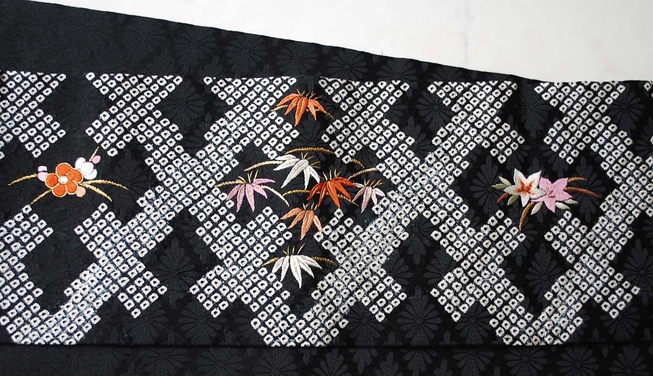 【なごや帯】黒地 手刺繍四季花文 絞りなごや帯