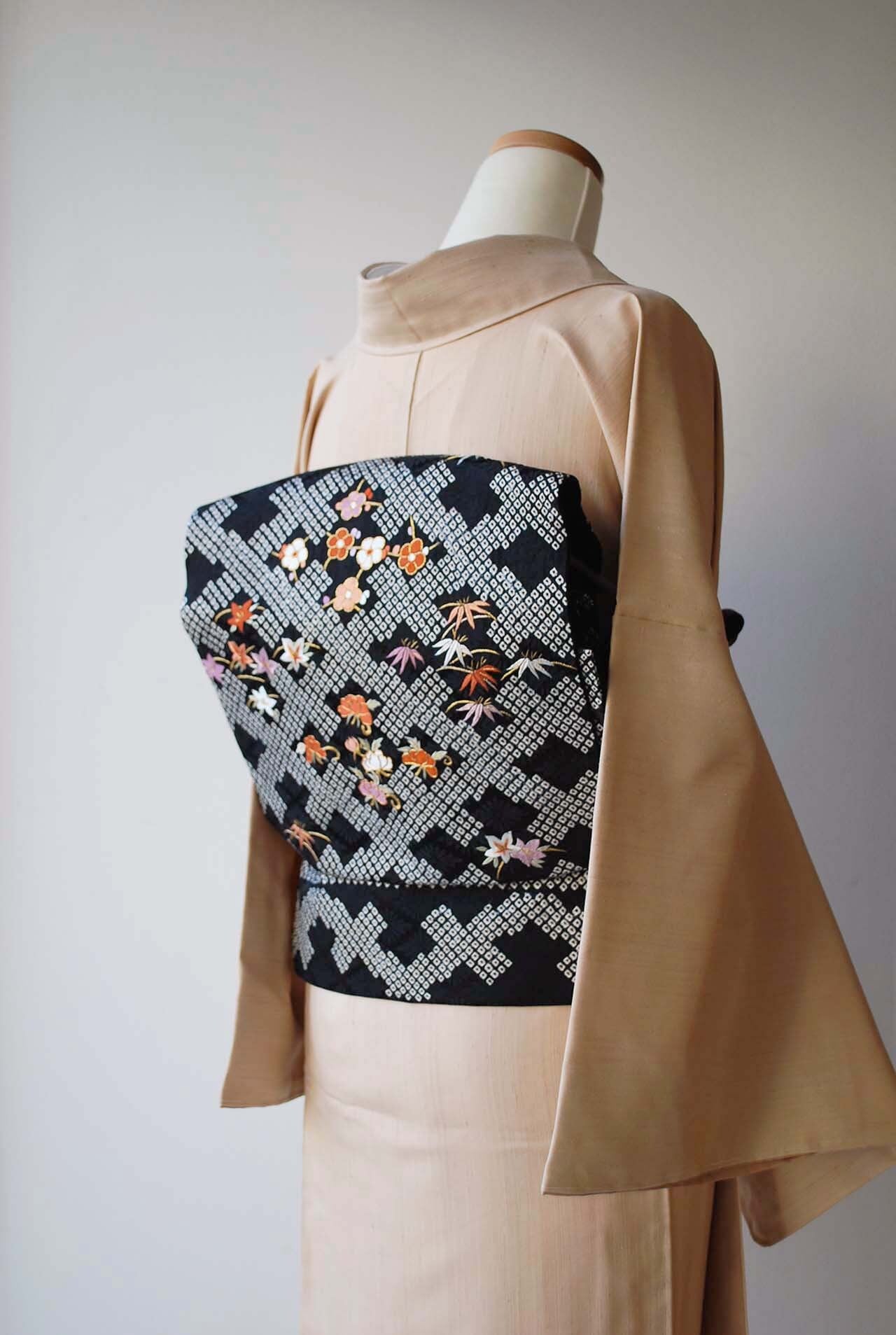 帯地は黒に花菱の地紋が浮かび上がります。