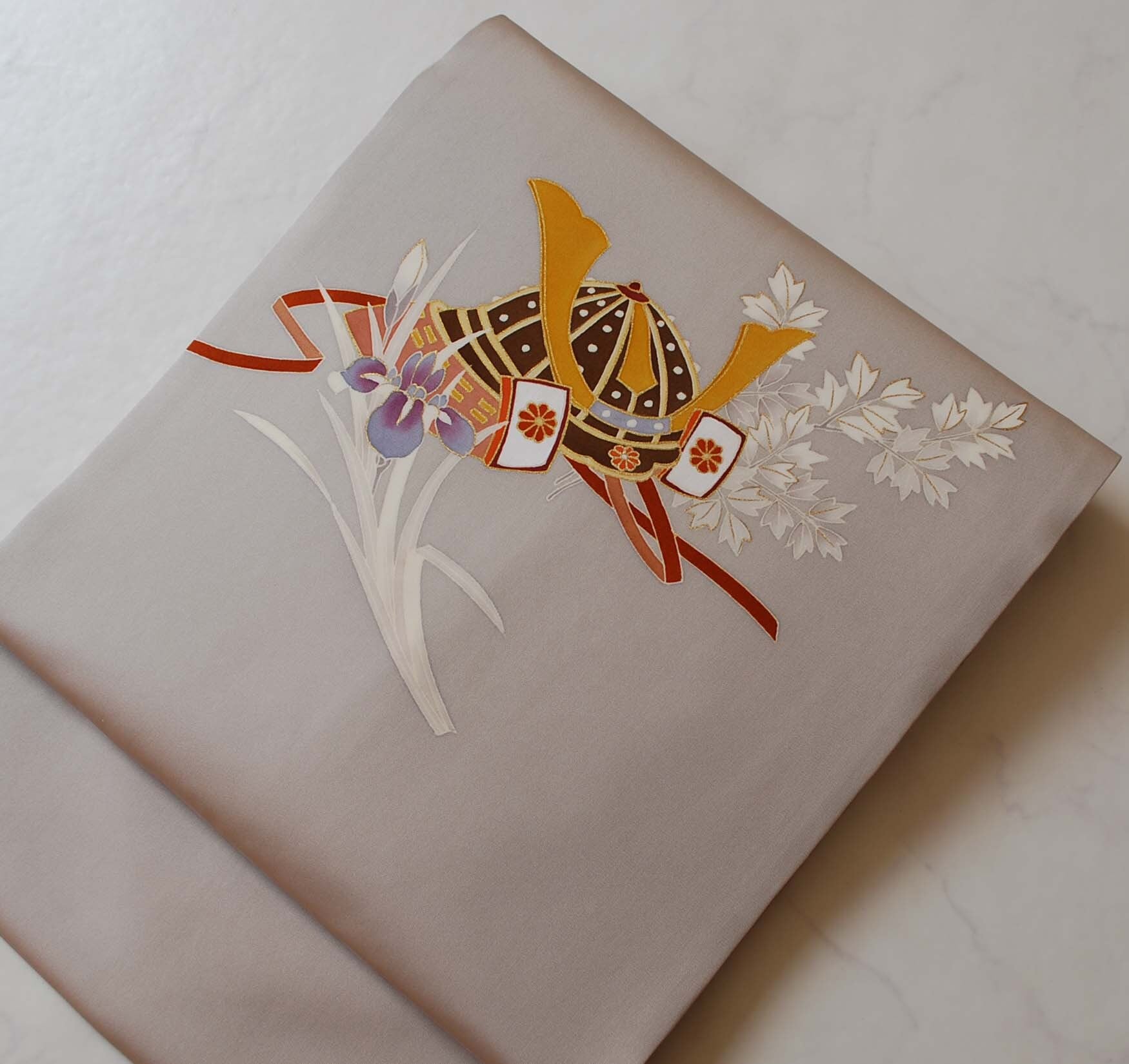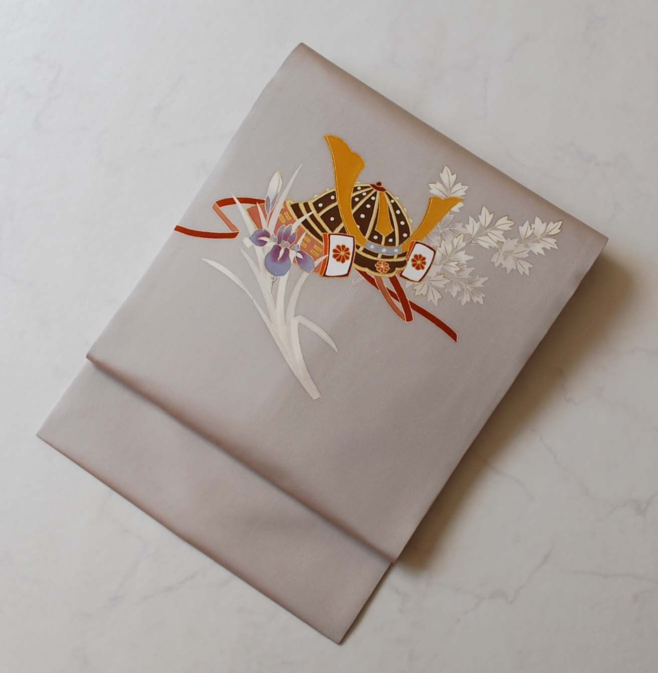 お太鼓柄には、黄金色に輝く兜を中心に、